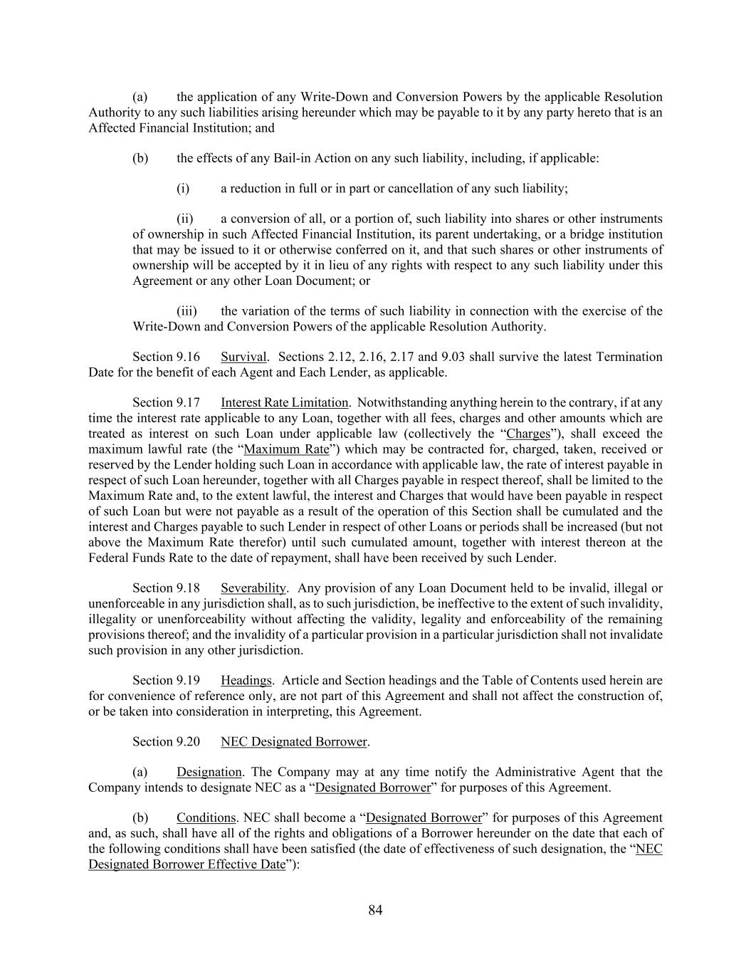 84 (a) the application of any Write-Down and Conversion Powers by the applicable Resolution Authority to any such liabilities arising hereunder which may be payable to it by any party hereto that is an Affected Financial Institution; and (b) the effects of any Bail-in Action on any such liability, including, if applicable: (i) a reduction in full or in part or cancellation of any such liability; (ii) a conversion of all, or a portion of, such liability into shares or other instruments of ownership in such Affected Financial Institution, its parent undertaking, or a bridge institution that may be issued to it or otherwise conferred on it, and that such shares or other instruments of ownership will be accepted by it in lieu of any rights with respect to any such liability under this Agreement or any other Loan Document; or (iii) the variation of the terms of such liability in connection with the exercise of the Write-Down and Conversion Powers of the applicable Resolution Authority. Section 9.16 Survival. Sections 2.12, 2.16, 2.17 and 9.03 shall survive the latest Termination Date for the benefit of each Agent and Each Lender, as applicable. Section 9.17 Interest Rate Limitation. Notwithstanding anything herein to the contrary, if at any time the interest rate applicable to any Loan, together with all fees, charges and other amounts which are treated as interest on such Loan under applicable law (collectively the “Charges”), shall exceed the maximum lawful rate (the “Maximum Rate”) which may be contracted for, charged, taken, received or reserved by the Lender holding such Loan in accordance with applicable law, the rate of interest payable in respect of such Loan hereunder, together with all Charges payable in respect thereof, shall be limited to the Maximum Rate and, to the extent lawful, the interest and Charges that would have been payable in respect of such Loan but were not payable as a result of the operation of this Section shall be cumulated and the interest and Charges payable to such Lender in respect of other Loans or periods shall be increased (but not above the Maximum Rate therefor) until such cumulated amount, together with interest thereon at the Federal Funds Rate to the date of repayment, shall have been received by such Lender. Section 9.18 Severability. Any provision of any Loan Document held to be invalid, illegal or unenforceable in any jurisdiction shall, as to such jurisdiction, be ineffective to the extent of such invalidity, illegality or unenforceability without affecting the validity, legality and enforceability of the remaining provisions thereof; and the invalidity of a particular provision in a particular jurisdiction shall not invalidate such provision in any other jurisdiction. Section 9.19 Headings. Article and Section headings and the Table of Contents used herein are for convenience of reference only, are not part of this Agreement and shall not affect the construction of, or be taken into consideration in interpreting, this Agreement. Section 9.20 NEC Designated Borrower. (a) Designation. The Company may at any time notify the Administrative Agent that the Company intends to designate NEC as a “Designated Borrower” for purposes of this Agreement. (b) Conditions. NEC shall become a “Designated Borrower” for purposes of this Agreement and, as such, shall have all of the rights and obligations of a Borrower hereunder on the date that each of the following conditions shall have been satisfied (the date of effectiveness of such designation, the “NEC Designated Borrower Effective Date”):