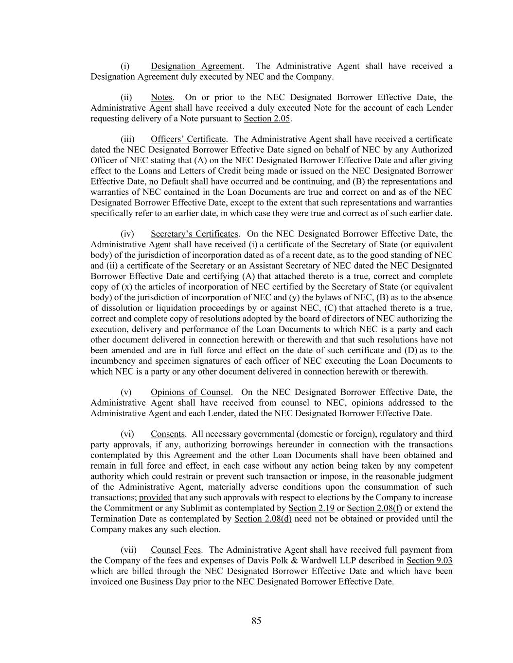85 (i) Designation Agreement. The Administrative Agent shall have received a Designation Agreement duly executed by NEC and the Company. (ii) Notes. On or prior to the NEC Designated Borrower Effective Date, the Administrative Agent shall have received a duly executed Note for the account of each Lender requesting delivery of a Note pursuant to Section 2.05. (iii) Officers’ Certificate. The Administrative Agent shall have received a certificate dated the NEC Designated Borrower Effective Date signed on behalf of NEC by any Authorized Officer of NEC stating that (A) on the NEC Designated Borrower Effective Date and after giving effect to the Loans and Letters of Credit being made or issued on the NEC Designated Borrower Effective Date, no Default shall have occurred and be continuing, and (B) the representations and warranties of NEC contained in the Loan Documents are true and correct on and as of the NEC Designated Borrower Effective Date, except to the extent that such representations and warranties specifically refer to an earlier date, in which case they were true and correct as of such earlier date. (iv) Secretary’s Certificates. On the NEC Designated Borrower Effective Date, the Administrative Agent shall have received (i) a certificate of the Secretary of State (or equivalent body) of the jurisdiction of incorporation dated as of a recent date, as to the good standing of NEC and (ii) a certificate of the Secretary or an Assistant Secretary of NEC dated the NEC Designated Borrower Effective Date and certifying (A) that attached thereto is a true, correct and complete copy of (x) the articles of incorporation of NEC certified by the Secretary of State (or equivalent body) of the jurisdiction of incorporation of NEC and (y) the bylaws of NEC, (B) as to the absence of dissolution or liquidation proceedings by or against NEC, (C) that attached thereto is a true, correct and complete copy of resolutions adopted by the board of directors of NEC authorizing the execution, delivery and performance of the Loan Documents to which NEC is a party and each other document delivered in connection herewith or therewith and that such resolutions have not been amended and are in full force and effect on the date of such certificate and (D) as to the incumbency and specimen signatures of each officer of NEC executing the Loan Documents to which NEC is a party or any other document delivered in connection herewith or therewith. (v) Opinions of Counsel. On the NEC Designated Borrower Effective Date, the Administrative Agent shall have received from counsel to NEC, opinions addressed to the Administrative Agent and each Lender, dated the NEC Designated Borrower Effective Date. (vi) Consents. All necessary governmental (domestic or foreign), regulatory and third party approvals, if any, authorizing borrowings hereunder in connection with the transactions contemplated by this Agreement and the other Loan Documents shall have been obtained and remain in full force and effect, in each case without any action being taken by any competent authority which could restrain or prevent such transaction or impose, in the reasonable judgment of the Administrative Agent, materially adverse conditions upon the consummation of such transactions; provided that any such approvals with respect to elections by the Company to increase the Commitment or any Sublimit as contemplated by Section 2.19 or Section 2.08(f) or extend the Termination Date as contemplated by Section 2.08(d) need not be obtained or provided until the Company makes any such election. (vii) Counsel Fees. The Administrative Agent shall have received full payment from the Company of the fees and expenses of Davis Polk & Wardwell LLP described in Section 9.03 which are billed through the NEC Designated Borrower Effective Date and which have been invoiced one Business Day prior to the NEC Designated Borrower Effective Date.