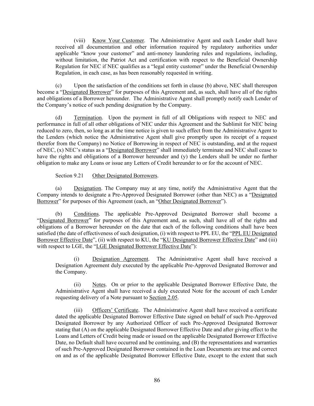 86 (viii) Know Your Customer. The Administrative Agent and each Lender shall have received all documentation and other information required by regulatory authorities under applicable “know your customer” and anti-money laundering rules and regulations, including, without limitation, the Patriot Act and certification with respect to the Beneficial Ownership Regulation for NEC if NEC qualifies as a “legal entity customer” under the Beneficial Ownership Regulation, in each case, as has been reasonably requested in writing. (c) Upon the satisfaction of the conditions set forth in clause (b) above, NEC shall thereupon become a “Designated Borrower” for purposes of this Agreement and, as such, shall have all of the rights and obligations of a Borrower hereunder. The Administrative Agent shall promptly notify each Lender of the Company’s notice of such pending designation by the Company. (d) Termination. Upon the payment in full of all Obligations with respect to NEC and performance in full of all other obligations of NEC under this Agreement and the Sublimit for NEC being reduced to zero, then, so long as at the time notice is given to such effect from the Administrative Agent to the Lenders (which notice the Administrative Agent shall give promptly upon its receipt of a request therefor from the Company) no Notice of Borrowing in respect of NEC is outstanding, and at the request of NEC, (x) NEC’s status as a “Designated Borrower” shall immediately terminate and NEC shall cease to have the rights and obligations of a Borrower hereunder and (y) the Lenders shall be under no further obligation to make any Loans or issue any Letters of Credit hereunder to or for the account of NEC. Section 9.21 Other Designated Borrowers. (a) Designation. The Company may at any time, notify the Administrative Agent that the Company intends to designate a Pre-Approved Designated Borrower (other than NEC) as a “Designated Borrower” for purposes of this Agreement (each, an “Other Designated Borrower”). (b) Conditions. The applicable Pre-Approved Designated Borrower shall become a “Designated Borrower” for purposes of this Agreement and, as such, shall have all of the rights and obligations of a Borrower hereunder on the date that each of the following conditions shall have been satisfied (the date of effectiveness of such designation, (i) with respect to PPL EU, the “PPL EU Designated Borrower Effective Date”, (ii) with respect to KU, the “KU Designated Borrower Effective Date” and (iii) with respect to LGE, the “LGE Designated Borrower Effective Date”): (i) Designation Agreement. The Administrative Agent shall have received a Designation Agreement duly executed by the applicable Pre-Approved Designated Borrower and the Company. (ii) Notes. On or prior to the applicable Designated Borrower Effective Date, the Administrative Agent shall have received a duly executed Note for the account of each Lender requesting delivery of a Note pursuant to Section 2.05. (iii) Officers’ Certificate. The Administrative Agent shall have received a certificate dated the applicable Designated Borrower Effective Date signed on behalf of such Pre-Approved Designated Borrower by any Authorized Officer of such Pre-Approved Designated Borrower stating that (A) on the applicable Designated Borrower Effective Date and after giving effect to the Loans and Letters of Credit being made or issued on the applicable Designated Borrower Effective Date, no Default shall have occurred and be continuing, and (B) the representations and warranties of such Pre-Approved Designated Borrower contained in the Loan Documents are true and correct on and as of the applicable Designated Borrower Effective Date, except to the extent that such