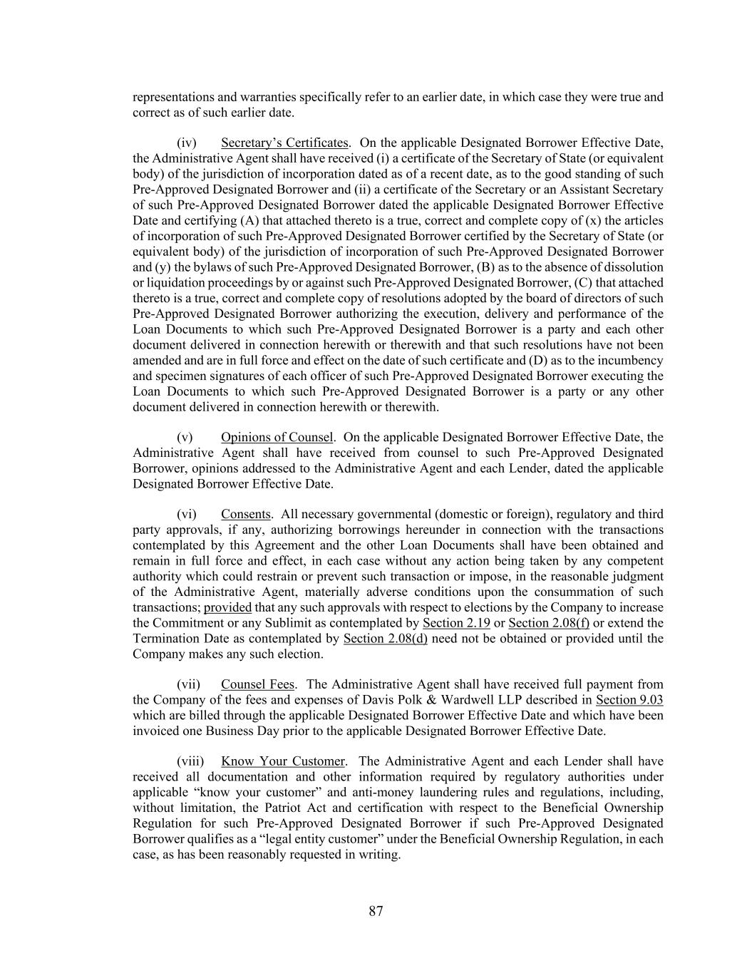 87 representations and warranties specifically refer to an earlier date, in which case they were true and correct as of such earlier date. (iv) Secretary’s Certificates. On the applicable Designated Borrower Effective Date, the Administrative Agent shall have received (i) a certificate of the Secretary of State (or equivalent body) of the jurisdiction of incorporation dated as of a recent date, as to the good standing of such Pre-Approved Designated Borrower and (ii) a certificate of the Secretary or an Assistant Secretary of such Pre-Approved Designated Borrower dated the applicable Designated Borrower Effective Date and certifying (A) that attached thereto is a true, correct and complete copy of (x) the articles of incorporation of such Pre-Approved Designated Borrower certified by the Secretary of State (or equivalent body) of the jurisdiction of incorporation of such Pre-Approved Designated Borrower and (y) the bylaws of such Pre-Approved Designated Borrower, (B) as to the absence of dissolution or liquidation proceedings by or against such Pre-Approved Designated Borrower, (C) that attached thereto is a true, correct and complete copy of resolutions adopted by the board of directors of such Pre-Approved Designated Borrower authorizing the execution, delivery and performance of the Loan Documents to which such Pre-Approved Designated Borrower is a party and each other document delivered in connection herewith or therewith and that such resolutions have not been amended and are in full force and effect on the date of such certificate and (D) as to the incumbency and specimen signatures of each officer of such Pre-Approved Designated Borrower executing the Loan Documents to which such Pre-Approved Designated Borrower is a party or any other document delivered in connection herewith or therewith. (v) Opinions of Counsel. On the applicable Designated Borrower Effective Date, the Administrative Agent shall have received from counsel to such Pre-Approved Designated Borrower, opinions addressed to the Administrative Agent and each Lender, dated the applicable Designated Borrower Effective Date. (vi) Consents. All necessary governmental (domestic or foreign), regulatory and third party approvals, if any, authorizing borrowings hereunder in connection with the transactions contemplated by this Agreement and the other Loan Documents shall have been obtained and remain in full force and effect, in each case without any action being taken by any competent authority which could restrain or prevent such transaction or impose, in the reasonable judgment of the Administrative Agent, materially adverse conditions upon the consummation of such transactions; provided that any such approvals with respect to elections by the Company to increase the Commitment or any Sublimit as contemplated by Section 2.19 or Section 2.08(f) or extend the Termination Date as contemplated by Section 2.08(d) need not be obtained or provided until the Company makes any such election. (vii) Counsel Fees. The Administrative Agent shall have received full payment from the Company of the fees and expenses of Davis Polk & Wardwell LLP described in Section 9.03 which are billed through the applicable Designated Borrower Effective Date and which have been invoiced one Business Day prior to the applicable Designated Borrower Effective Date. (viii) Know Your Customer. The Administrative Agent and each Lender shall have received all documentation and other information required by regulatory authorities under applicable “know your customer” and anti-money laundering rules and regulations, including, without limitation, the Patriot Act and certification with respect to the Beneficial Ownership Regulation for such Pre-Approved Designated Borrower if such Pre-Approved Designated Borrower qualifies as a “legal entity customer” under the Beneficial Ownership Regulation, in each case, as has been reasonably requested in writing.