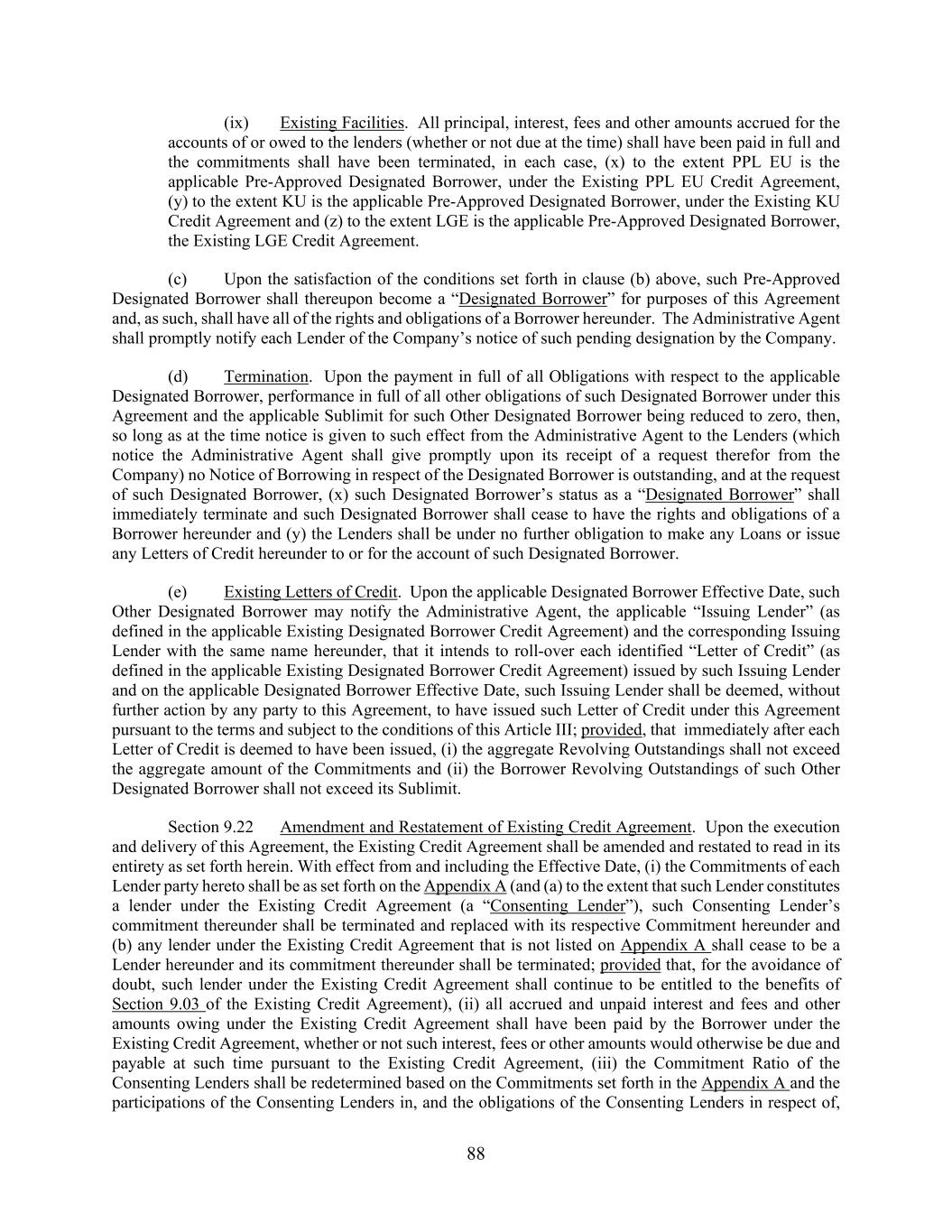 88 (ix) Existing Facilities. All principal, interest, fees and other amounts accrued for the accounts of or owed to the lenders (whether or not due at the time) shall have been paid in full and the commitments shall have been terminated, in each case, (x) to the extent PPL EU is the applicable Pre-Approved Designated Borrower, under the Existing PPL EU Credit Agreement, (y) to the extent KU is the applicable Pre-Approved Designated Borrower, under the Existing KU Credit Agreement and (z) to the extent LGE is the applicable Pre-Approved Designated Borrower, the Existing LGE Credit Agreement. (c) Upon the satisfaction of the conditions set forth in clause (b) above, such Pre-Approved Designated Borrower shall thereupon become a “Designated Borrower” for purposes of this Agreement and, as such, shall have all of the rights and obligations of a Borrower hereunder. The Administrative Agent shall promptly notify each Lender of the Company’s notice of such pending designation by the Company. (d) Termination. Upon the payment in full of all Obligations with respect to the applicable Designated Borrower, performance in full of all other obligations of such Designated Borrower under this Agreement and the applicable Sublimit for such Other Designated Borrower being reduced to zero, then, so long as at the time notice is given to such effect from the Administrative Agent to the Lenders (which notice the Administrative Agent shall give promptly upon its receipt of a request therefor from the Company) no Notice of Borrowing in respect of the Designated Borrower is outstanding, and at the request of such Designated Borrower, (x) such Designated Borrower’s status as a “Designated Borrower” shall immediately terminate and such Designated Borrower shall cease to have the rights and obligations of a Borrower hereunder and (y) the Lenders shall be under no further obligation to make any Loans or issue any Letters of Credit hereunder to or for the account of such Designated Borrower. (e) Existing Letters of Credit. Upon the applicable Designated Borrower Effective Date, such Other Designated Borrower may notify the Administrative Agent, the applicable “Issuing Lender” (as defined in the applicable Existing Designated Borrower Credit Agreement) and the corresponding Issuing Lender with the same name hereunder, that it intends to roll-over each identified “Letter of Credit” (as defined in the applicable Existing Designated Borrower Credit Agreement) issued by such Issuing Lender and on the applicable Designated Borrower Effective Date, such Issuing Lender shall be deemed, without further action by any party to this Agreement, to have issued such Letter of Credit under this Agreement pursuant to the terms and subject to the conditions of this Article III; provided, that immediately after each Letter of Credit is deemed to have been issued, (i) the aggregate Revolving Outstandings shall not exceed the aggregate amount of the Commitments and (ii) the Borrower Revolving Outstandings of such Other Designated Borrower shall not exceed its Sublimit. Section 9.22 Amendment and Restatement of Existing Credit Agreement. Upon the execution and delivery of this Agreement, the Existing Credit Agreement shall be amended and restated to read in its entirety as set forth herein. With effect from and including the Effective Date, (i) the Commitments of each Lender party hereto shall be as set forth on the Appendix A (and (a) to the extent that such Lender constitutes a lender under the Existing Credit Agreement (a “Consenting Lender”), such Consenting Lender’s commitment thereunder shall be terminated and replaced with its respective Commitment hereunder and (b) any lender under the Existing Credit Agreement that is not listed on Appendix A shall cease to be a Lender hereunder and its commitment thereunder shall be terminated; provided that, for the avoidance of doubt, such lender under the Existing Credit Agreement shall continue to be entitled to the benefits of Section 9.03 of the Existing Credit Agreement), (ii) all accrued and unpaid interest and fees and other amounts owing under the Existing Credit Agreement shall have been paid by the Borrower under the Existing Credit Agreement, whether or not such interest, fees or other amounts would otherwise be due and payable at such time pursuant to the Existing Credit Agreement, (iii) the Commitment Ratio of the Consenting Lenders shall be redetermined based on the Commitments set forth in the Appendix A and the participations of the Consenting Lenders in, and the obligations of the Consenting Lenders in respect of,
