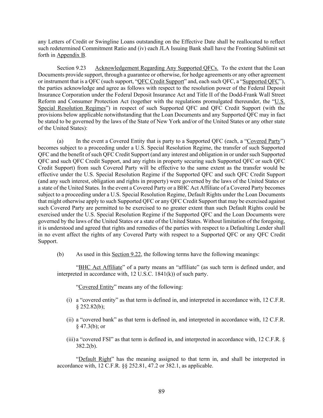 89 any Letters of Credit or Swingline Loans outstanding on the Effective Date shall be reallocated to reflect such redetermined Commitment Ratio and (iv) each JLA Issuing Bank shall have the Fronting Sublimit set forth in Appendix B. Section 9.23 Acknowledgement Regarding Any Supported QFCs. To the extent that the Loan Documents provide support, through a guarantee or otherwise, for hedge agreements or any other agreement or instrument that is a QFC (such support, “QFC Credit Support” and, each such QFC, a “Supported QFC”), the parties acknowledge and agree as follows with respect to the resolution power of the Federal Deposit Insurance Corporation under the Federal Deposit Insurance Act and Title II of the Dodd-Frank Wall Street Reform and Consumer Protection Act (together with the regulations promulgated thereunder, the “U.S. Special Resolution Regimes”) in respect of such Supported QFC and QFC Credit Support (with the provisions below applicable notwithstanding that the Loan Documents and any Supported QFC may in fact be stated to be governed by the laws of the State of New York and/or of the United States or any other state of the United States): (a) In the event a Covered Entity that is party to a Supported QFC (each, a “Covered Party”) becomes subject to a proceeding under a U.S. Special Resolution Regime, the transfer of such Supported QFC and the benefit of such QFC Credit Support (and any interest and obligation in or under such Supported QFC and such QFC Credit Support, and any rights in property securing such Supported QFC or such QFC Credit Support) from such Covered Party will be effective to the same extent as the transfer would be effective under the U.S. Special Resolution Regime if the Supported QFC and such QFC Credit Support (and any such interest, obligation and rights in property) were governed by the laws of the United States or a state of the United States. In the event a Covered Party or a BHC Act Affiliate of a Covered Party becomes subject to a proceeding under a U.S. Special Resolution Regime, Default Rights under the Loan Documents that might otherwise apply to such Supported QFC or any QFC Credit Support that may be exercised against such Covered Party are permitted to be exercised to no greater extent than such Default Rights could be exercised under the U.S. Special Resolution Regime if the Supported QFC and the Loan Documents were governed by the laws of the United States or a state of the United States. Without limitation of the foregoing, it is understood and agreed that rights and remedies of the parties with respect to a Defaulting Lender shall in no event affect the rights of any Covered Party with respect to a Supported QFC or any QFC Credit Support. (b) As used in this Section 9.22, the following terms have the following meanings: “BHC Act Affiliate” of a party means an “affiliate” (as such term is defined under, and interpreted in accordance with, 12 U.S.C. 1841(k)) of such party. “Covered Entity” means any of the following: (i) a “covered entity” as that term is defined in, and interpreted in accordance with, 12 C.F.R. § 252.82(b); (ii) a “covered bank” as that term is defined in, and interpreted in accordance with, 12 C.F.R. § 47.3(b); or (iii) a “covered FSI” as that term is defined in, and interpreted in accordance with, 12 C.F.R. § 382.2(b). “Default Right” has the meaning assigned to that term in, and shall be interpreted in accordance with, 12 C.F.R. §§ 252.81, 47.2 or 382.1, as applicable.
