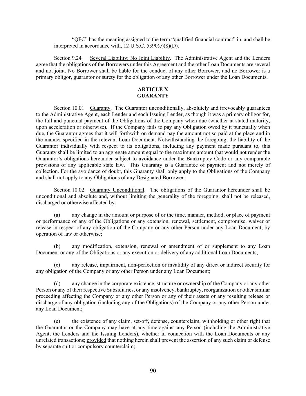 90 “QFC” has the meaning assigned to the term “qualified financial contract” in, and shall be interpreted in accordance with, 12 U.S.C. 5390(c)(8)(D). Section 9.24 Several Liability; No Joint Liability. The Administrative Agent and the Lenders agree that the obligations of the Borrowers under this Agreement and the other Loan Documents are several and not joint. No Borrower shall be liable for the conduct of any other Borrower, and no Borrower is a primary obligor, guarantor or surety for the obligation of any other Borrower under the Loan Documents. ARTICLE X GUARANTY Section 10.01 Guaranty. The Guarantor unconditionally, absolutely and irrevocably guarantees to the Administrative Agent, each Lender and each Issuing Lender, as though it was a primary obligor for, the full and punctual payment of the Obligations of the Company when due (whether at stated maturity, upon acceleration or otherwise). If the Company fails to pay any Obligation owed by it punctually when due, the Guarantor agrees that it will forthwith on demand pay the amount not so paid at the place and in the manner specified in the relevant Loan Document. Notwithstanding the foregoing, the liability of the Guarantor individually with respect to its obligations, including any payment made pursuant to, this Guaranty shall be limited to an aggregate amount equal to the maximum amount that would not render the Guarantor’s obligations hereunder subject to avoidance under the Bankruptcy Code or any comparable provisions of any applicable state law. This Guaranty is a Guarantee of payment and not merely of collection. For the avoidance of doubt, this Guaranty shall only apply to the Obligations of the Company and shall not apply to any Obligations of any Designated Borrower. Section 10.02 Guaranty Unconditional. The obligations of the Guarantor hereunder shall be unconditional and absolute and, without limiting the generality of the foregoing, shall not be released, discharged or otherwise affected by: (a) any change in the amount or purpose of or the time, manner, method, or place of payment or performance of any of the Obligations or any extension, renewal, settlement, compromise, waiver or release in respect of any obligation of the Company or any other Person under any Loan Document, by operation of law or otherwise; (b) any modification, extension, renewal or amendment of or supplement to any Loan Document or any of the Obligations or any execution or delivery of any additional Loan Documents; (c) any release, impairment, non-perfection or invalidity of any direct or indirect security for any obligation of the Company or any other Person under any Loan Document; (d) any change in the corporate existence, structure or ownership of the Company or any other Person or any of their respective Subsidiaries, or any insolvency, bankruptcy, reorganization or other similar proceeding affecting the Company or any other Person or any of their assets or any resulting release or discharge of any obligation (including any of the Obligations) of the Company or any other Person under any Loan Document; (e) the existence of any claim, set-off, defense, counterclaim, withholding or other right that the Guarantor or the Company may have at any time against any Person (including the Administrative Agent, the Lenders and the Issuing Lenders), whether in connection with the Loan Documents or any unrelated transactions; provided that nothing herein shall prevent the assertion of any such claim or defense by separate suit or compulsory counterclaim;
