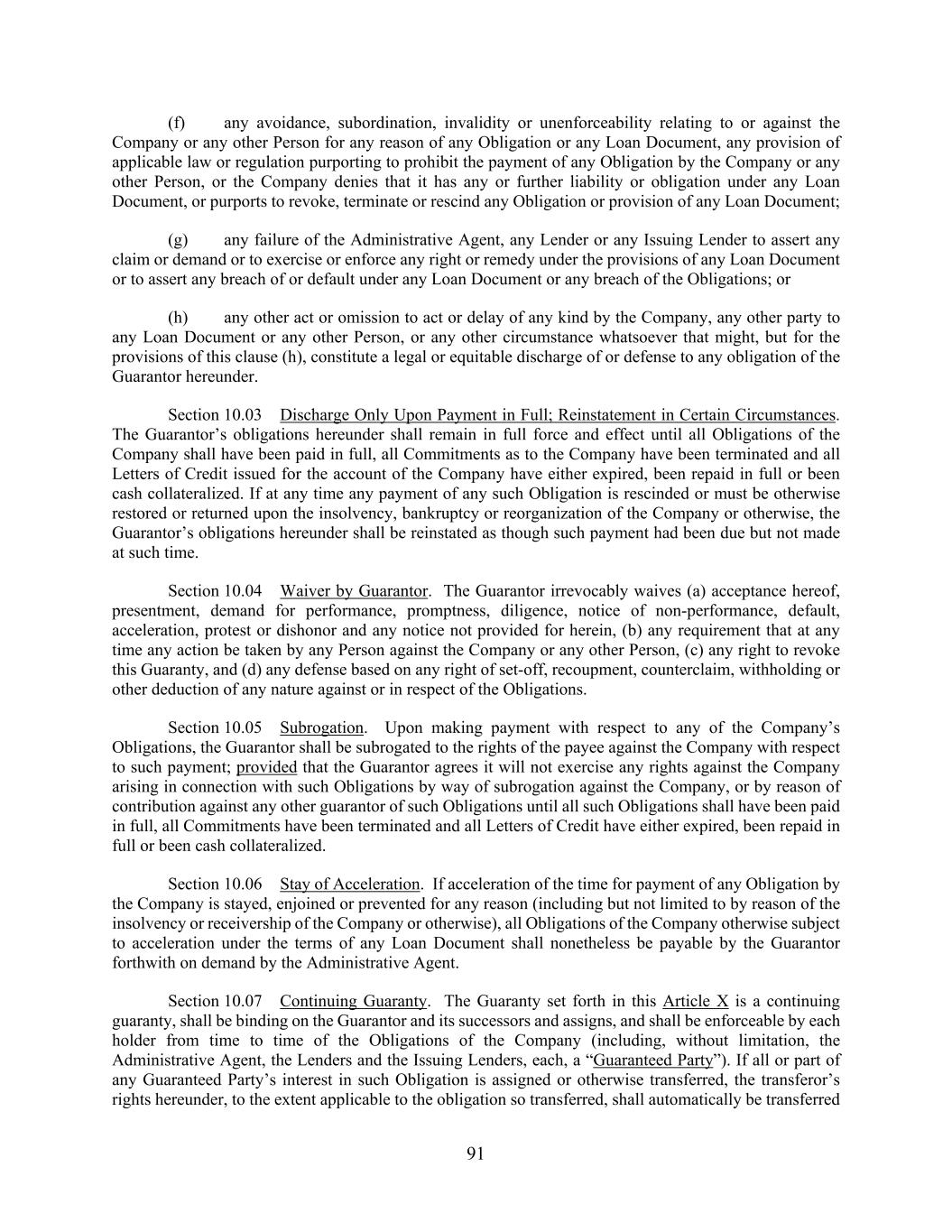 91 (f) any avoidance, subordination, invalidity or unenforceability relating to or against the Company or any other Person for any reason of any Obligation or any Loan Document, any provision of applicable law or regulation purporting to prohibit the payment of any Obligation by the Company or any other Person, or the Company denies that it has any or further liability or obligation under any Loan Document, or purports to revoke, terminate or rescind any Obligation or provision of any Loan Document; (g) any failure of the Administrative Agent, any Lender or any Issuing Lender to assert any claim or demand or to exercise or enforce any right or remedy under the provisions of any Loan Document or to assert any breach of or default under any Loan Document or any breach of the Obligations; or (h) any other act or omission to act or delay of any kind by the Company, any other party to any Loan Document or any other Person, or any other circumstance whatsoever that might, but for the provisions of this clause (h), constitute a legal or equitable discharge of or defense to any obligation of the Guarantor hereunder. Section 10.03 Discharge Only Upon Payment in Full; Reinstatement in Certain Circumstances. The Guarantor’s obligations hereunder shall remain in full force and effect until all Obligations of the Company shall have been paid in full, all Commitments as to the Company have been terminated and all Letters of Credit issued for the account of the Company have either expired, been repaid in full or been cash collateralized. If at any time any payment of any such Obligation is rescinded or must be otherwise restored or returned upon the insolvency, bankruptcy or reorganization of the Company or otherwise, the Guarantor’s obligations hereunder shall be reinstated as though such payment had been due but not made at such time. Section 10.04 Waiver by Guarantor. The Guarantor irrevocably waives (a) acceptance hereof, presentment, demand for performance, promptness, diligence, notice of non-performance, default, acceleration, protest or dishonor and any notice not provided for herein, (b) any requirement that at any time any action be taken by any Person against the Company or any other Person, (c) any right to revoke this Guaranty, and (d) any defense based on any right of set-off, recoupment, counterclaim, withholding or other deduction of any nature against or in respect of the Obligations. Section 10.05 Subrogation. Upon making payment with respect to any of the Company’s Obligations, the Guarantor shall be subrogated to the rights of the payee against the Company with respect to such payment; provided that the Guarantor agrees it will not exercise any rights against the Company arising in connection with such Obligations by way of subrogation against the Company, or by reason of contribution against any other guarantor of such Obligations until all such Obligations shall have been paid in full, all Commitments have been terminated and all Letters of Credit have either expired, been repaid in full or been cash collateralized. Section 10.06 Stay of Acceleration. If acceleration of the time for payment of any Obligation by the Company is stayed, enjoined or prevented for any reason (including but not limited to by reason of the insolvency or receivership of the Company or otherwise), all Obligations of the Company otherwise subject to acceleration under the terms of any Loan Document shall nonetheless be payable by the Guarantor forthwith on demand by the Administrative Agent. Section 10.07 Continuing Guaranty. The Guaranty set forth in this Article X is a continuing guaranty, shall be binding on the Guarantor and its successors and assigns, and shall be enforceable by each holder from time to time of the Obligations of the Company (including, without limitation, the Administrative Agent, the Lenders and the Issuing Lenders, each, a “Guaranteed Party”). If all or part of any Guaranteed Party’s interest in such Obligation is assigned or otherwise transferred, the transferor’s rights hereunder, to the extent applicable to the obligation so transferred, shall automatically be transferred