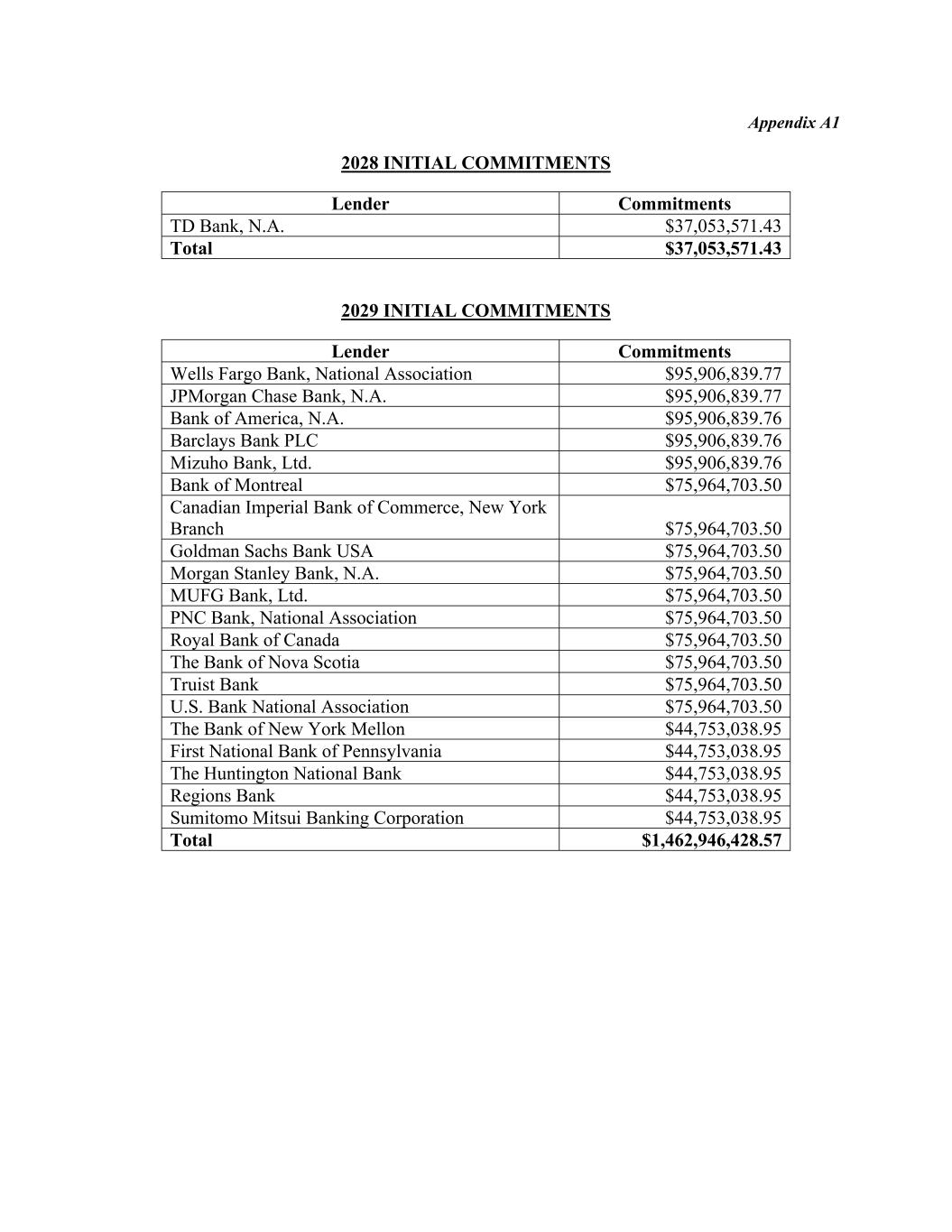 Appendix A1 2028 INITIAL COMMITMENTS Lender Commitments TD Bank, N.A. $37,053,571.43 Total $37,053,571.43 2029 INITIAL COMMITMENTS Lender Commitments Wells Fargo Bank, National Association $95,906,839.77 JPMorgan Chase Bank, N.A. $95,906,839.77 Bank of America, N.A. $95,906,839.76 Barclays Bank PLC $95,906,839.76 Mizuho Bank, Ltd. $95,906,839.76 Bank of Montreal $75,964,703.50 Canadian Imperial Bank of Commerce, New York Branch $75,964,703.50 Goldman Sachs Bank USA $75,964,703.50 Morgan Stanley Bank, N.A. $75,964,703.50 MUFG Bank, Ltd. $75,964,703.50 PNC Bank, National Association $75,964,703.50 Royal Bank of Canada $75,964,703.50 The Bank of Nova Scotia $75,964,703.50 Truist Bank $75,964,703.50 U.S. Bank National Association $75,964,703.50 The Bank of New York Mellon $44,753,038.95 First National Bank of Pennsylvania $44,753,038.95 The Huntington National Bank $44,753,038.95 Regions Bank $44,753,038.95 Sumitomo Mitsui Banking Corporation $44,753,038.95 Total $1,462,946,428.57