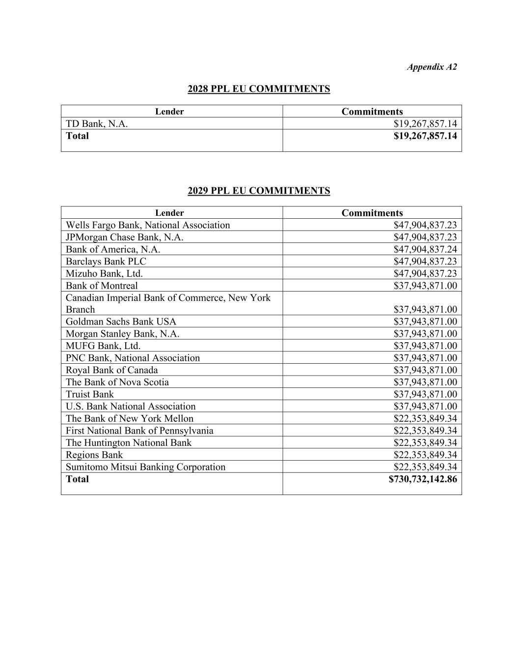Appendix A2 2028 PPL EU COMMITMENTS Lender Commitments TD Bank, N.A. $19,267,857.14 Total $19,267,857.14 2029 PPL EU COMMITMENTS Lender Commitments Wells Fargo Bank, National Association $47,904,837.23 JPMorgan Chase Bank, N.A. $47,904,837.23 Bank of America, N.A. $47,904,837.24 Barclays Bank PLC $47,904,837.23 Mizuho Bank, Ltd. $47,904,837.23 Bank of Montreal $37,943,871.00 Canadian Imperial Bank of Commerce, New York Branch $37,943,871.00 Goldman Sachs Bank USA $37,943,871.00 Morgan Stanley Bank, N.A. $37,943,871.00 MUFG Bank, Ltd. $37,943,871.00 PNC Bank, National Association $37,943,871.00 Royal Bank of Canada $37,943,871.00 The Bank of Nova Scotia $37,943,871.00 Truist Bank $37,943,871.00 U.S. Bank National Association $37,943,871.00 The Bank of New York Mellon $22,353,849.34 First National Bank of Pennsylvania $22,353,849.34 The Huntington National Bank $22,353,849.34 Regions Bank $22,353,849.34 Sumitomo Mitsui Banking Corporation $22,353,849.34 Total $730,732,142.86