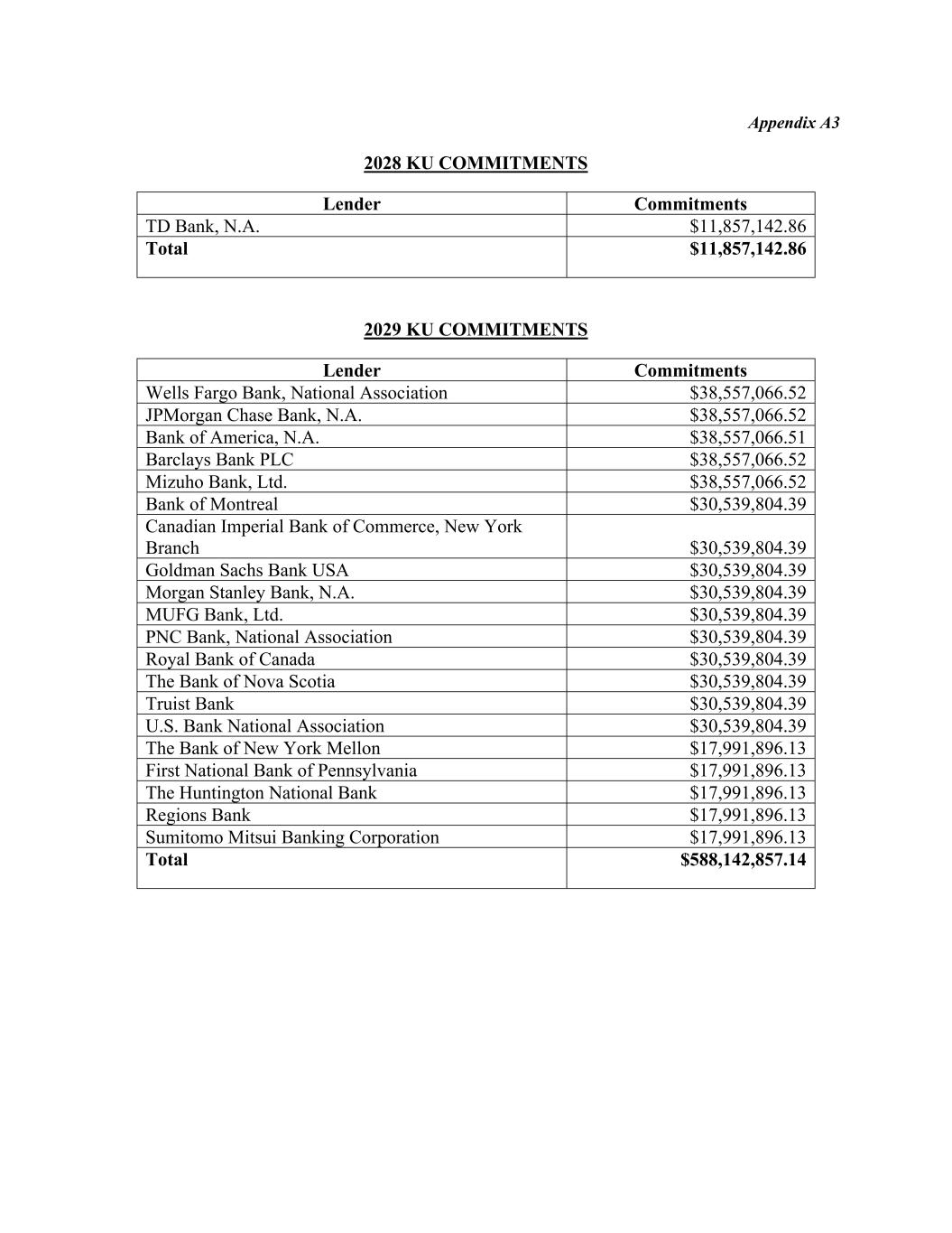 Appendix A3 2028 KU COMMITMENTS Lender Commitments TD Bank, N.A. $11,857,142.86 Total $11,857,142.86 2029 KU COMMITMENTS Lender Commitments Wells Fargo Bank, National Association $38,557,066.52 JPMorgan Chase Bank, N.A. $38,557,066.52 Bank of America, N.A. $38,557,066.51 Barclays Bank PLC $38,557,066.52 Mizuho Bank, Ltd. $38,557,066.52 Bank of Montreal $30,539,804.39 Canadian Imperial Bank of Commerce, New York Branch $30,539,804.39 Goldman Sachs Bank USA $30,539,804.39 Morgan Stanley Bank, N.A. $30,539,804.39 MUFG Bank, Ltd. $30,539,804.39 PNC Bank, National Association $30,539,804.39 Royal Bank of Canada $30,539,804.39 The Bank of Nova Scotia $30,539,804.39 Truist Bank $30,539,804.39 U.S. Bank National Association $30,539,804.39 The Bank of New York Mellon $17,991,896.13 First National Bank of Pennsylvania $17,991,896.13 The Huntington National Bank $17,991,896.13 Regions Bank $17,991,896.13 Sumitomo Mitsui Banking Corporation $17,991,896.13 Total $588,142,857.14