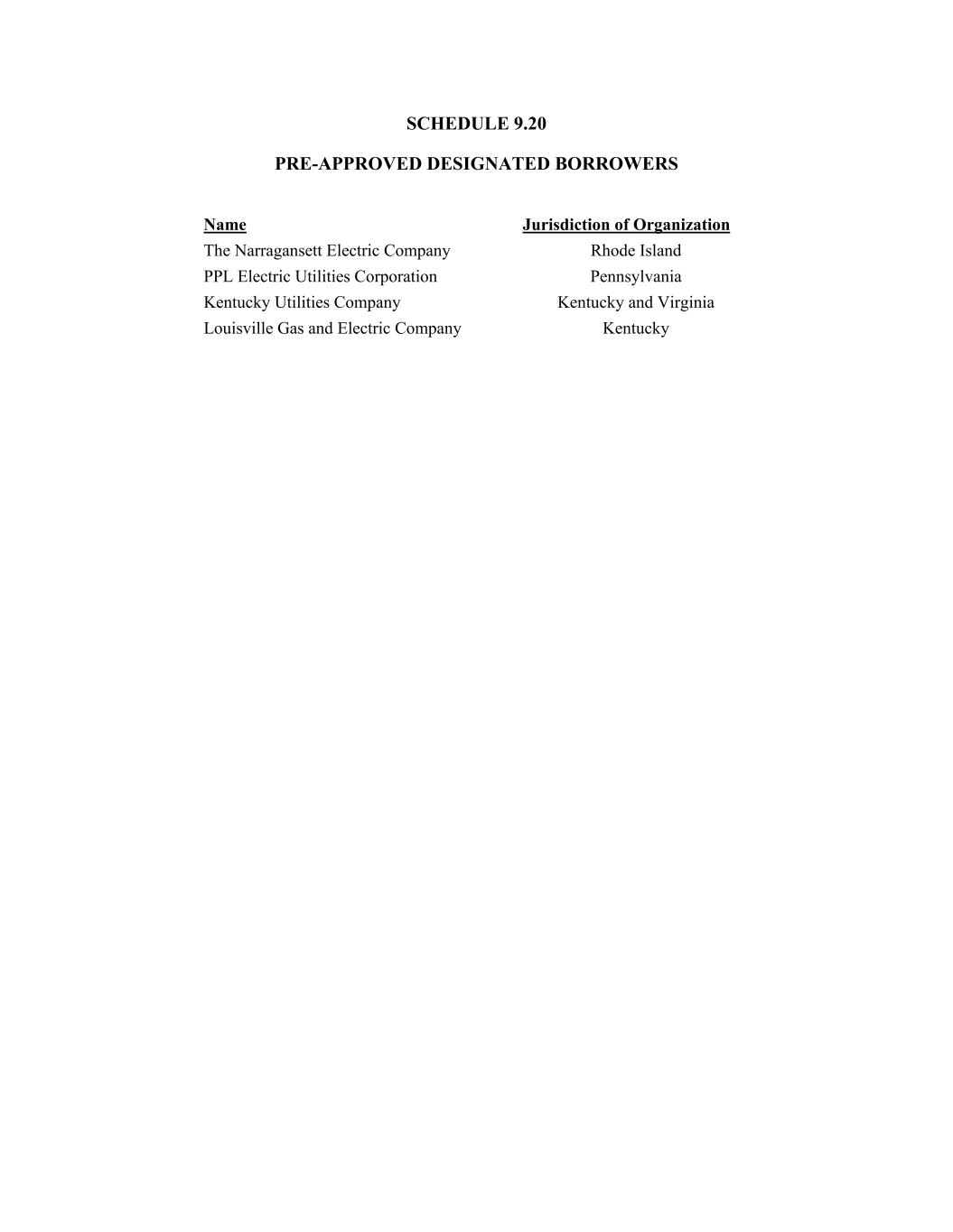 SCHEDULE 9.20 PRE-APPROVED DESIGNATED BORROWERS Name Jurisdiction of Organization The Narragansett Electric Company Rhode Island PPL Electric Utilities Corporation Pennsylvania Kentucky Utilities Company Kentucky and Virginia Louisville Gas and Electric Company Kentucky
