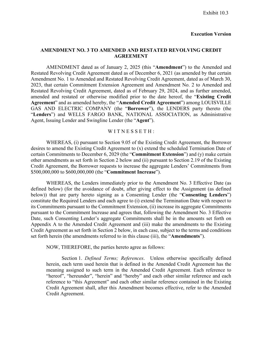 Execution Version AMENDMENT NO. 3 TO AMENDED AND RESTATED REVOLVING CREDIT AGREEMENT AMENDMENT dated as of January 2, 2025 (this “Amendment”) to the Amended and Restated Revolving Credit Agreement dated as of December 6, 2021 (as amended by that certain Amendment No. 1 to Amended and Restated Revolving Credit Agreement, dated as of March 30, 2023, that certain Commitment Extension Agreement and Amendment No. 2 to Amended and Restated Revolving Credit Agreement, dated as of February 29, 2024, and as further amended, amended and restated or otherwise modified prior to the date hereof, the “Existing Credit Agreement” and as amended hereby, the “Amended Credit Agreement”) among LOUISVILLE GAS AND ELECTRIC COMPANY (the “Borrower”), the LENDERS party thereto (the “Lenders”) and WELLS FARGO BANK, NATIONAL ASSOCIATION, as Administrative Agent, Issuing Lender and Swingline Lender (the “Agent”). W I T N E S S E T H : WHEREAS, (i) pursuant to Section 9.05 of the Existing Credit Agreement, the Borrower desires to amend the Existing Credit Agreement to (x) extend the scheduled Termination Date of certain Commitments to December 6, 2029 (the “Commitment Extension”) and (y) make certain other amendments as set forth in Section 2 below and (ii) pursuant to Section 2.19 of the Existing Credit Agreement, the Borrower requests to increase the aggregate Lenders’ Commitments from $500,000,000 to $600,000,000 (the “Commitment Increase”). WHEREAS, the Lenders immediately prior to the Amendment No. 3 Effective Date (as defined below) (for the avoidance of doubt, after giving effect to the Assignment (as defined below)) that are party hereto signing as a Consenting Lender (the “Consenting Lenders”) constitute the Required Lenders and each agree to (i) extend the Termination Date with respect to its Commitments pursuant to the Commitment Extension, (ii) increase its aggregate Commitments pursuant to the Commitment Increase and agrees that, following the Amendment No. 3 Effective Date, such Consenting Lender’s aggregate Commitments shall be in the amounts set forth on Appendix A to the Amended Credit Agreement and (iii) make the amendments to the Existing Credit Agreement as set forth in Section 2 below, in each case, subject to the terms and conditions set forth herein (the amendments referred to in this clause (iii), the “Amendments”). NOW, THEREFORE, the parties hereto agree as follows: Section 1. Defined Terms; References. Unless otherwise specifically defined herein, each term used herein that is defined in the Amended Credit Agreement has the meaning assigned to such term in the Amended Credit Agreement. Each reference to “hereof”, “hereunder”, “herein” and “hereby” and each other similar reference and each reference to “this Agreement” and each other similar reference contained in the Existing Credit Agreement shall, after this Amendment becomes effective, refer to the Amended Credit Agreement. Exhibit 10.3