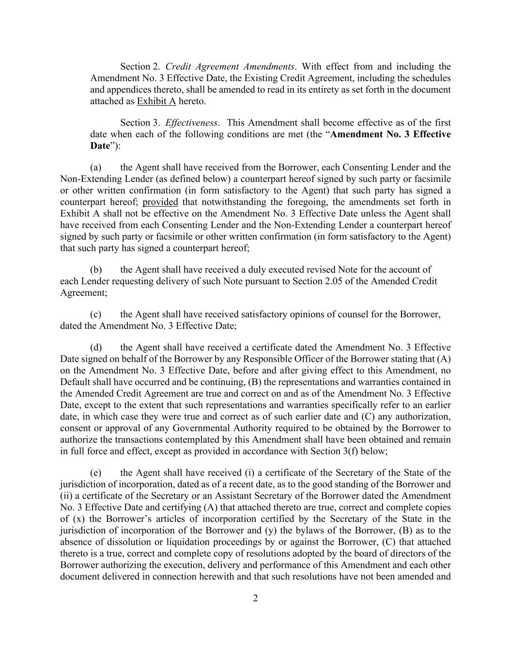 2 Section 2. Credit Agreement Amendments. With effect from and including the Amendment No. 3 Effective Date, the Existing Credit Agreement, including the schedules and appendices thereto, shall be amended to read in its entirety as set forth in the document attached as Exhibit A hereto. Section 3. Effectiveness. This Amendment shall become effective as of the first date when each of the following conditions are met (the “Amendment No. 3 Effective Date”): (a) the Agent shall have received from the Borrower, each Consenting Lender and the Non-Extending Lender (as defined below) a counterpart hereof signed by such party or facsimile or other written confirmation (in form satisfactory to the Agent) that such party has signed a counterpart hereof; provided that notwithstanding the foregoing, the amendments set forth in Exhibit A shall not be effective on the Amendment No. 3 Effective Date unless the Agent shall have received from each Consenting Lender and the Non-Extending Lender a counterpart hereof signed by such party or facsimile or other written confirmation (in form satisfactory to the Agent) that such party has signed a counterpart hereof; (b) the Agent shall have received a duly executed revised Note for the account of each Lender requesting delivery of such Note pursuant to Section 2.05 of the Amended Credit Agreement; (c) the Agent shall have received satisfactory opinions of counsel for the Borrower, dated the Amendment No. 3 Effective Date; (d) the Agent shall have received a certificate dated the Amendment No. 3 Effective Date signed on behalf of the Borrower by any Responsible Officer of the Borrower stating that (A) on the Amendment No. 3 Effective Date, before and after giving effect to this Amendment, no Default shall have occurred and be continuing, (B) the representations and warranties contained in the Amended Credit Agreement are true and correct on and as of the Amendment No. 3 Effective Date, except to the extent that such representations and warranties specifically refer to an earlier date, in which case they were true and correct as of such earlier date and (C) any authorization, consent or approval of any Governmental Authority required to be obtained by the Borrower to authorize the transactions contemplated by this Amendment shall have been obtained and remain in full force and effect, except as provided in accordance with Section 3(f) below; (e) the Agent shall have received (i) a certificate of the Secretary of the State of the jurisdiction of incorporation, dated as of a recent date, as to the good standing of the Borrower and (ii) a certificate of the Secretary or an Assistant Secretary of the Borrower dated the Amendment No. 3 Effective Date and certifying (A) that attached thereto are true, correct and complete copies of (x) the Borrower’s articles of incorporation certified by the Secretary of the State in the jurisdiction of incorporation of the Borrower and (y) the bylaws of the Borrower, (B) as to the absence of dissolution or liquidation proceedings by or against the Borrower, (C) that attached thereto is a true, correct and complete copy of resolutions adopted by the board of directors of the Borrower authorizing the execution, delivery and performance of this Amendment and each other document delivered in connection herewith and that such resolutions have not been amended and