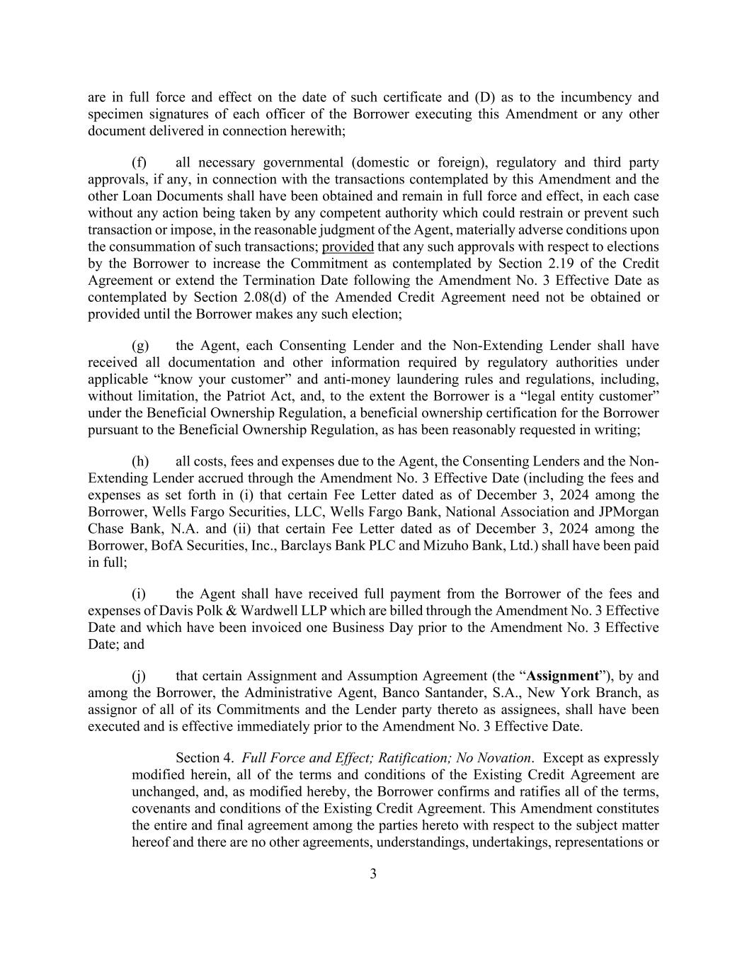 3 are in full force and effect on the date of such certificate and (D) as to the incumbency and specimen signatures of each officer of the Borrower executing this Amendment or any other document delivered in connection herewith; (f) all necessary governmental (domestic or foreign), regulatory and third party approvals, if any, in connection with the transactions contemplated by this Amendment and the other Loan Documents shall have been obtained and remain in full force and effect, in each case without any action being taken by any competent authority which could restrain or prevent such transaction or impose, in the reasonable judgment of the Agent, materially adverse conditions upon the consummation of such transactions; provided that any such approvals with respect to elections by the Borrower to increase the Commitment as contemplated by Section 2.19 of the Credit Agreement or extend the Termination Date following the Amendment No. 3 Effective Date as contemplated by Section 2.08(d) of the Amended Credit Agreement need not be obtained or provided until the Borrower makes any such election; (g) the Agent, each Consenting Lender and the Non-Extending Lender shall have received all documentation and other information required by regulatory authorities under applicable “know your customer” and anti-money laundering rules and regulations, including, without limitation, the Patriot Act, and, to the extent the Borrower is a “legal entity customer” under the Beneficial Ownership Regulation, a beneficial ownership certification for the Borrower pursuant to the Beneficial Ownership Regulation, as has been reasonably requested in writing; (h) all costs, fees and expenses due to the Agent, the Consenting Lenders and the Non- Extending Lender accrued through the Amendment No. 3 Effective Date (including the fees and expenses as set forth in (i) that certain Fee Letter dated as of December 3, 2024 among the Borrower, Wells Fargo Securities, LLC, Wells Fargo Bank, National Association and JPMorgan Chase Bank, N.A. and (ii) that certain Fee Letter dated as of December 3, 2024 among the Borrower, BofA Securities, Inc., Barclays Bank PLC and Mizuho Bank, Ltd.) shall have been paid in full; (i) the Agent shall have received full payment from the Borrower of the fees and expenses of Davis Polk & Wardwell LLP which are billed through the Amendment No. 3 Effective Date and which have been invoiced one Business Day prior to the Amendment No. 3 Effective Date; and (j) that certain Assignment and Assumption Agreement (the “Assignment”), by and among the Borrower, the Administrative Agent, Banco Santander, S.A., New York Branch, as assignor of all of its Commitments and the Lender party thereto as assignees, shall have been executed and is effective immediately prior to the Amendment No. 3 Effective Date. Section 4. Full Force and Effect; Ratification; No Novation. Except as expressly modified herein, all of the terms and conditions of the Existing Credit Agreement are unchanged, and, as modified hereby, the Borrower confirms and ratifies all of the terms, covenants and conditions of the Existing Credit Agreement. This Amendment constitutes the entire and final agreement among the parties hereto with respect to the subject matter hereof and there are no other agreements, understandings, undertakings, representations or