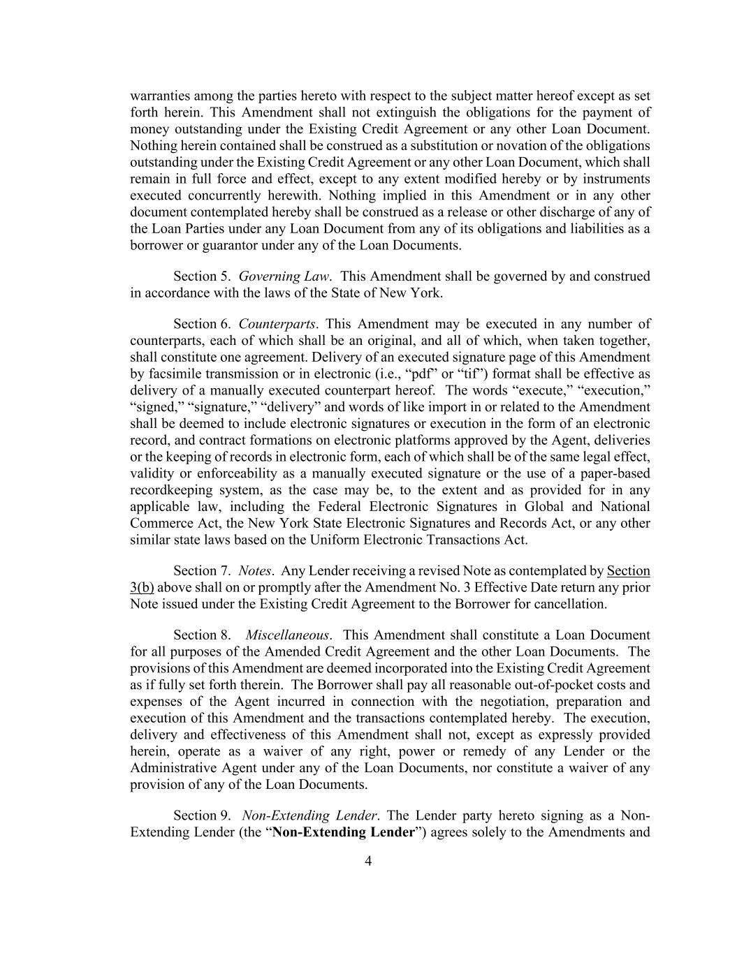 4 warranties among the parties hereto with respect to the subject matter hereof except as set forth herein. This Amendment shall not extinguish the obligations for the payment of money outstanding under the Existing Credit Agreement or any other Loan Document. Nothing herein contained shall be construed as a substitution or novation of the obligations outstanding under the Existing Credit Agreement or any other Loan Document, which shall remain in full force and effect, except to any extent modified hereby or by instruments executed concurrently herewith. Nothing implied in this Amendment or in any other document contemplated hereby shall be construed as a release or other discharge of any of the Loan Parties under any Loan Document from any of its obligations and liabilities as a borrower or guarantor under any of the Loan Documents. Section 5. Governing Law. This Amendment shall be governed by and construed in accordance with the laws of the State of New York. Section 6. Counterparts. This Amendment may be executed in any number of counterparts, each of which shall be an original, and all of which, when taken together, shall constitute one agreement. Delivery of an executed signature page of this Amendment by facsimile transmission or in electronic (i.e., “pdf” or “tif”) format shall be effective as delivery of a manually executed counterpart hereof. The words “execute,” “execution,” “signed,” “signature,” “delivery” and words of like import in or related to the Amendment shall be deemed to include electronic signatures or execution in the form of an electronic record, and contract formations on electronic platforms approved by the Agent, deliveries or the keeping of records in electronic form, each of which shall be of the same legal effect, validity or enforceability as a manually executed signature or the use of a paper-based recordkeeping system, as the case may be, to the extent and as provided for in any applicable law, including the Federal Electronic Signatures in Global and National Commerce Act, the New York State Electronic Signatures and Records Act, or any other similar state laws based on the Uniform Electronic Transactions Act. Section 7. Notes. Any Lender receiving a revised Note as contemplated by Section 3(b) above shall on or promptly after the Amendment No. 3 Effective Date return any prior Note issued under the Existing Credit Agreement to the Borrower for cancellation. Section 8. Miscellaneous. This Amendment shall constitute a Loan Document for all purposes of the Amended Credit Agreement and the other Loan Documents. The provisions of this Amendment are deemed incorporated into the Existing Credit Agreement as if fully set forth therein. The Borrower shall pay all reasonable out-of-pocket costs and expenses of the Agent incurred in connection with the negotiation, preparation and execution of this Amendment and the transactions contemplated hereby. The execution, delivery and effectiveness of this Amendment shall not, except as expressly provided herein, operate as a waiver of any right, power or remedy of any Lender or the Administrative Agent under any of the Loan Documents, nor constitute a waiver of any provision of any of the Loan Documents. Section 9. Non-Extending Lender. The Lender party hereto signing as a Non- Extending Lender (the “Non-Extending Lender”) agrees solely to the Amendments and