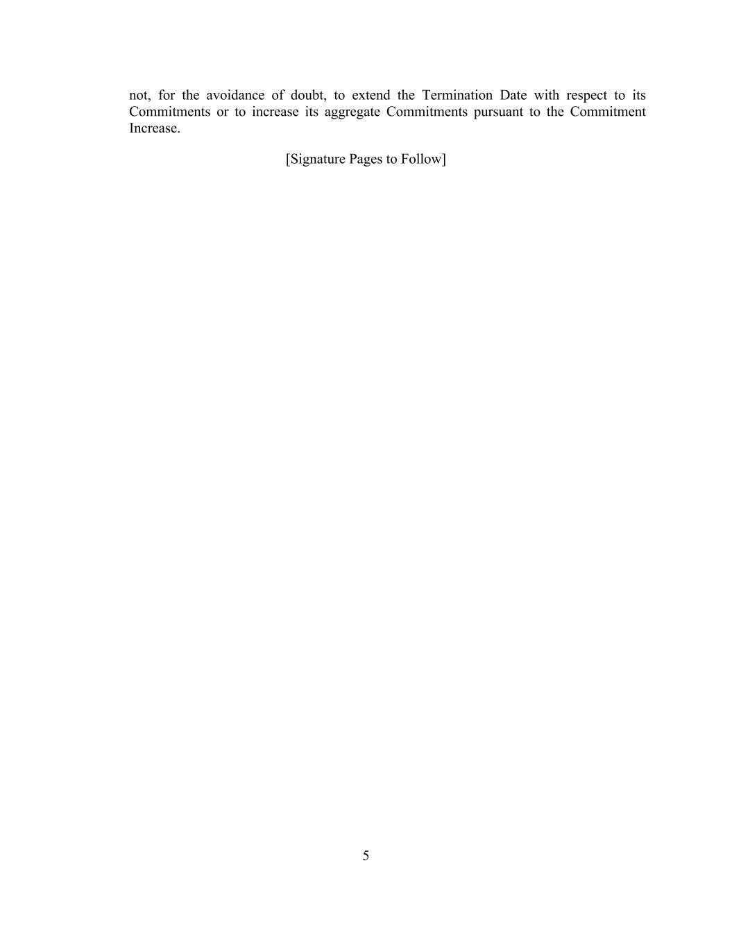 5 not, for the avoidance of doubt, to extend the Termination Date with respect to its Commitments or to increase its aggregate Commitments pursuant to the Commitment Increase. [Signature Pages to Follow]