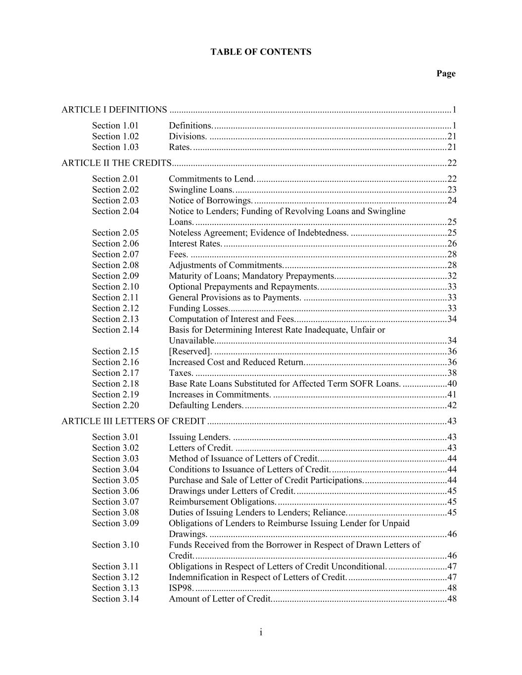 TABLE OF CONTENTS Page i ARTICLE I DEFINITIONS ........................................................................................................................ 1 Section 1.01 Definitions. ..................................................................................................... 1 Section 1.02 Divisions. ..................................................................................................... 21 Section 1.03 Rates. ............................................................................................................ 21 ARTICLE II THE CREDITS ..................................................................................................................... 22 Section 2.01 Commitments to Lend. ................................................................................. 22 Section 2.02 Swingline Loans. .......................................................................................... 23 Section 2.03 Notice of Borrowings. .................................................................................. 24 Section 2.04 Notice to Lenders; Funding of Revolving Loans and Swingline Loans. ........................................................................................................... 25 Section 2.05 Noteless Agreement; Evidence of Indebtedness. ......................................... 25 Section 2.06 Interest Rates. ............................................................................................... 26 Section 2.07 Fees. ............................................................................................................. 28 Section 2.08 Adjustments of Commitments. ..................................................................... 28 Section 2.09 Maturity of Loans; Mandatory Prepayments. ............................................... 32 Section 2.10 Optional Prepayments and Repayments. ...................................................... 33 Section 2.11 General Provisions as to Payments. ............................................................. 33 Section 2.12 Funding Losses. ............................................................................................ 33 Section 2.13 Computation of Interest and Fees. ................................................................ 34 Section 2.14 Basis for Determining Interest Rate Inadequate, Unfair or Unavailable. .................................................................................................. 34 Section 2.15 [Reserved]. ................................................................................................... 36 Section 2.16 Increased Cost and Reduced Return. ............................................................ 36 Section 2.17 Taxes. ........................................................................................................... 38 Section 2.18 Base Rate Loans Substituted for Affected Term SOFR Loans. ................... 40 Section 2.19 Increases in Commitments. .......................................................................... 41 Section 2.20 Defaulting Lenders. ...................................................................................... 42 ARTICLE III LETTERS OF CREDIT ...................................................................................................... 43 Section 3.01 Issuing Lenders. ........................................................................................... 43 Section 3.02 Letters of Credit. .......................................................................................... 43 Section 3.03 Method of Issuance of Letters of Credit. ...................................................... 44 Section 3.04 Conditions to Issuance of Letters of Credit. ................................................. 44 Section 3.05 Purchase and Sale of Letter of Credit Participations. ................................... 44 Section 3.06 Drawings under Letters of Credit. ................................................................ 45 Section 3.07 Reimbursement Obligations. ........................................................................ 45 Section 3.08 Duties of Issuing Lenders to Lenders; Reliance. .......................................... 45 Section 3.09 Obligations of Lenders to Reimburse Issuing Lender for Unpaid Drawings. ..................................................................................................... 46 Section 3.10 Funds Received from the Borrower in Respect of Drawn Letters of Credit. ........................................................................................................... 46 Section 3.11 Obligations in Respect of Letters of Credit Unconditional. ......................... 47 Section 3.12 Indemnification in Respect of Letters of Credit. .......................................... 47 Section 3.13 ISP98. ........................................................................................................... 48 Section 3.14 Amount of Letter of Credit. .......................................................................... 48