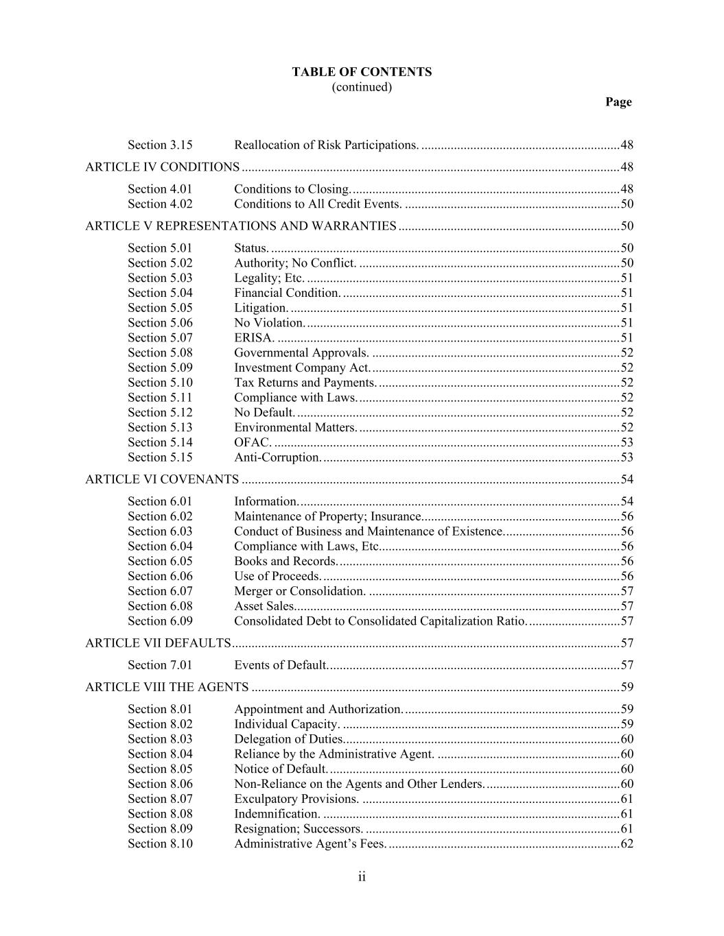 TABLE OF CONTENTS (continued) Page ii Section 3.15 Reallocation of Risk Participations. ............................................................. 48 ARTICLE IV CONDITIONS .................................................................................................................... 48 Section 4.01 Conditions to Closing. .................................................................................. 48 Section 4.02 Conditions to All Credit Events. .................................................................. 50 ARTICLE V REPRESENTATIONS AND WARRANTIES .................................................................... 50 Section 5.01 Status. ........................................................................................................... 50 Section 5.02 Authority; No Conflict. ................................................................................ 50 Section 5.03 Legality; Etc. ................................................................................................ 51 Section 5.04 Financial Condition. ..................................................................................... 51 Section 5.05 Litigation. ..................................................................................................... 51 Section 5.06 No Violation. ................................................................................................ 51 Section 5.07 ERISA. ......................................................................................................... 51 Section 5.08 Governmental Approvals. ............................................................................ 52 Section 5.09 Investment Company Act. ............................................................................ 52 Section 5.10 Tax Returns and Payments. .......................................................................... 52 Section 5.11 Compliance with Laws. ................................................................................ 52 Section 5.12 No Default. ................................................................................................... 52 Section 5.13 Environmental Matters. ................................................................................ 52 Section 5.14 OFAC. .......................................................................................................... 53 Section 5.15 Anti-Corruption. ........................................................................................... 53 ARTICLE VI COVENANTS .................................................................................................................... 54 Section 6.01 Information. .................................................................................................. 54 Section 6.02 Maintenance of Property; Insurance. ............................................................ 56 Section 6.03 Conduct of Business and Maintenance of Existence. ................................... 56 Section 6.04 Compliance with Laws, Etc.......................................................................... 56 Section 6.05 Books and Records. ...................................................................................... 56 Section 6.06 Use of Proceeds. ........................................................................................... 56 Section 6.07 Merger or Consolidation. ............................................................................. 57 Section 6.08 Asset Sales.................................................................................................... 57 Section 6.09 Consolidated Debt to Consolidated Capitalization Ratio. ............................ 57 ARTICLE VII DEFAULTS ....................................................................................................................... 57 Section 7.01 Events of Default. ......................................................................................... 57 ARTICLE VIII THE AGENTS ................................................................................................................. 59 Section 8.01 Appointment and Authorization. .................................................................. 59 Section 8.02 Individual Capacity. ..................................................................................... 59 Section 8.03 Delegation of Duties. .................................................................................... 60 Section 8.04 Reliance by the Administrative Agent. ........................................................ 60 Section 8.05 Notice of Default. ......................................................................................... 60 Section 8.06 Non-Reliance on the Agents and Other Lenders. ......................................... 60 Section 8.07 Exculpatory Provisions. ............................................................................... 61 Section 8.08 Indemnification. ........................................................................................... 61 Section 8.09 Resignation; Successors. .............................................................................. 61 Section 8.10 Administrative Agent’s Fees. ....................................................................... 62