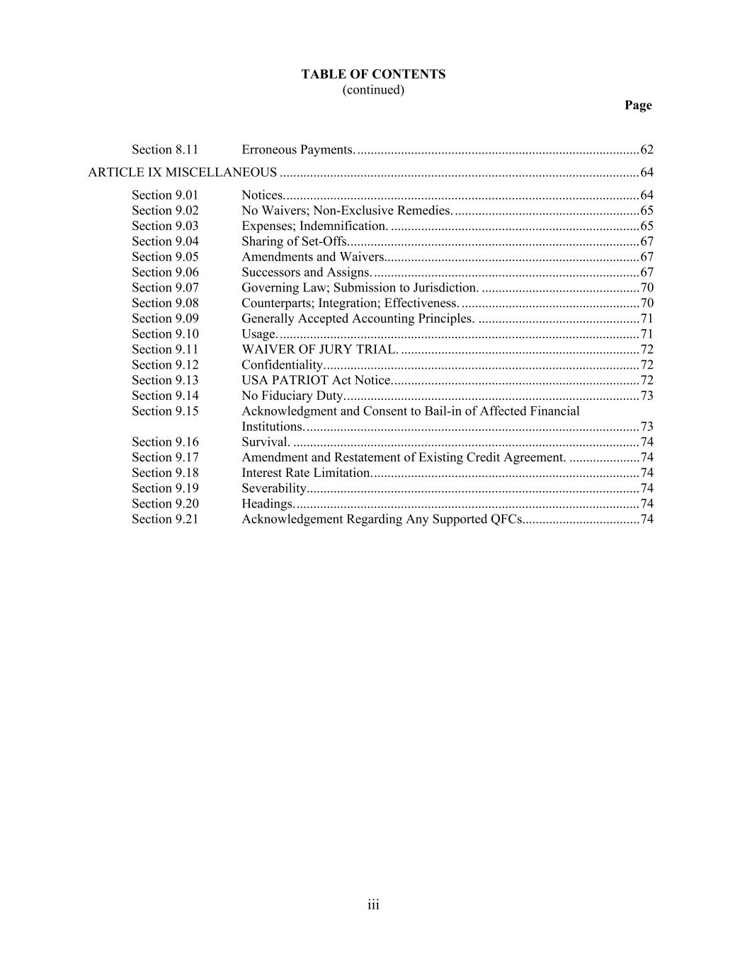 TABLE OF CONTENTS (continued) Page iii Section 8.11 Erroneous Payments. .................................................................................... 62 ARTICLE IX MISCELLANEOUS ........................................................................................................... 64 Section 9.01 Notices. ......................................................................................................... 64 Section 9.02 No Waivers; Non-Exclusive Remedies. ....................................................... 65 Section 9.03 Expenses; Indemnification. .......................................................................... 65 Section 9.04 Sharing of Set-Offs. ...................................................................................... 67 Section 9.05 Amendments and Waivers............................................................................ 67 Section 9.06 Successors and Assigns. ............................................................................... 67 Section 9.07 Governing Law; Submission to Jurisdiction. ............................................... 70 Section 9.08 Counterparts; Integration; Effectiveness. ..................................................... 70 Section 9.09 Generally Accepted Accounting Principles. ................................................ 71 Section 9.10 Usage. ........................................................................................................... 71 Section 9.11 WAIVER OF JURY TRIAL. ....................................................................... 72 Section 9.12 Confidentiality. ............................................................................................. 72 Section 9.13 USA PATRIOT Act Notice. ......................................................................... 72 Section 9.14 No Fiduciary Duty. ....................................................................................... 73 Section 9.15 Acknowledgment and Consent to Bail-in of Affected Financial Institutions. ................................................................................................... 73 Section 9.16 Survival. ....................................................................................................... 74 Section 9.17 Amendment and Restatement of Existing Credit Agreement. ..................... 74 Section 9.18 Interest Rate Limitation. ............................................................................... 74 Section 9.19 Severability................................................................................................... 74 Section 9.20 Headings. ...................................................................................................... 74 Section 9.21 Acknowledgement Regarding Any Supported QFCs. .................................. 74