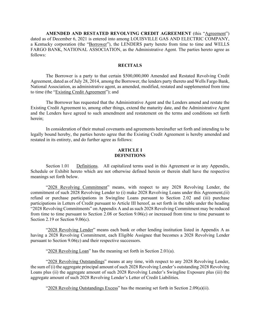 AMENDED AND RESTATED REVOLVING CREDIT AGREEMENT (this “Agreement”) dated as of December 6, 2021 is entered into among LOUISVILLE GAS AND ELECTRIC COMPANY, a Kentucky corporation (the “Borrower”), the LENDERS party hereto from time to time and WELLS FARGO BANK, NATIONAL ASSOCIATION, as the Administrative Agent. The parties hereto agree as follows: RECITALS The Borrower is a party to that certain $500,000,000 Amended and Restated Revolving Credit Agreement, dated as of July 28, 2014, among the Borrower, the lenders party thereto and Wells Fargo Bank, National Association, as administrative agent, as amended, modified, restated and supplemented from time to time (the “Existing Credit Agreement”); and The Borrower has requested that the Administrative Agent and the Lenders amend and restate the Existing Credit Agreement to, among other things, extend the maturity date, and the Administrative Agent and the Lenders have agreed to such amendment and restatement on the terms and conditions set forth herein; In consideration of their mutual covenants and agreements hereinafter set forth and intending to be legally bound hereby, the parties hereto agree that the Existing Credit Agreement is hereby amended and restated in its entirety, and do further agree as follows: ARTICLE I DEFINITIONS Section 1.01 Definitions. All capitalized terms used in this Agreement or in any Appendix, Schedule or Exhibit hereto which are not otherwise defined herein or therein shall have the respective meanings set forth below. “2028 Revolving Commitment” means, with respect to any 2028 Revolving Lender, the commitment of such 2028 Revolving Lender to (i) make 2028 Revolving Loans under this Agreement,(ii) refund or purchase participations in Swingline Loans pursuant to Section 2.02 and (iii) purchase participations in Letters of Credit pursuant to Article III hereof, as set forth in the table under the heading “2028 Revolving Commitments” on Appendix A and as such 2028 Revolving Commitment may be reduced from time to time pursuant to Section 2.08 or Section 9.06(c) or increased from time to time pursuant to Section 2.19 or Section 9.06(c). “2028 Revolving Lender” means each bank or other lending institution listed in Appendix A as having a 2028 Revolving Commitment, each Eligible Assignee that becomes a 2028 Revolving Lender pursuant to Section 9.06(c) and their respective successors. “2028 Revolving Loan” has the meaning set forth in Section 2.01(a). “2028 Revolving Outstandings” means at any time, with respect to any 2028 Revolving Lender, the sum of (i) the aggregate principal amount of such 2028 Revolving Lender’s outstanding 2028 Revolving Loans plus (ii) the aggregate amount of such 2028 Revolving Lender’s Swingline Exposure plus (iii) the aggregate amount of such 2028 Revolving Lender’s Letter of Credit Liabilities. “2028 Revolving Outstandings Excess” has the meaning set forth in Section 2.09(a)(ii).