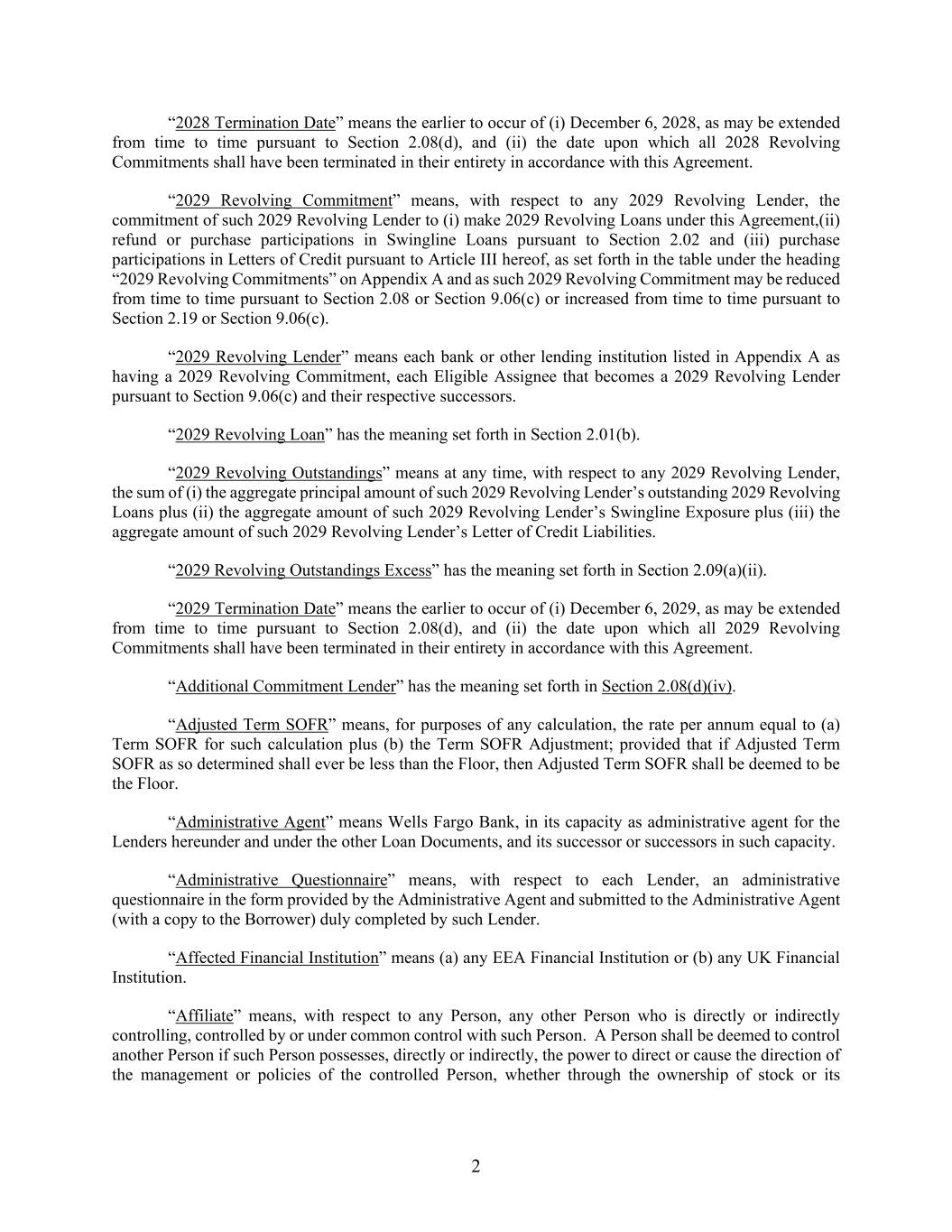 2 “2028 Termination Date” means the earlier to occur of (i) December 6, 2028, as may be extended from time to time pursuant to Section 2.08(d), and (ii) the date upon which all 2028 Revolving Commitments shall have been terminated in their entirety in accordance with this Agreement. “2029 Revolving Commitment” means, with respect to any 2029 Revolving Lender, the commitment of such 2029 Revolving Lender to (i) make 2029 Revolving Loans under this Agreement,(ii) refund or purchase participations in Swingline Loans pursuant to Section 2.02 and (iii) purchase participations in Letters of Credit pursuant to Article III hereof, as set forth in the table under the heading “2029 Revolving Commitments” on Appendix A and as such 2029 Revolving Commitment may be reduced from time to time pursuant to Section 2.08 or Section 9.06(c) or increased from time to time pursuant to Section 2.19 or Section 9.06(c). “2029 Revolving Lender” means each bank or other lending institution listed in Appendix A as having a 2029 Revolving Commitment, each Eligible Assignee that becomes a 2029 Revolving Lender pursuant to Section 9.06(c) and their respective successors. “2029 Revolving Loan” has the meaning set forth in Section 2.01(b). “2029 Revolving Outstandings” means at any time, with respect to any 2029 Revolving Lender, the sum of (i) the aggregate principal amount of such 2029 Revolving Lender’s outstanding 2029 Revolving Loans plus (ii) the aggregate amount of such 2029 Revolving Lender’s Swingline Exposure plus (iii) the aggregate amount of such 2029 Revolving Lender’s Letter of Credit Liabilities. “2029 Revolving Outstandings Excess” has the meaning set forth in Section 2.09(a)(ii). “2029 Termination Date” means the earlier to occur of (i) December 6, 2029, as may be extended from time to time pursuant to Section 2.08(d), and (ii) the date upon which all 2029 Revolving Commitments shall have been terminated in their entirety in accordance with this Agreement. “Additional Commitment Lender” has the meaning set forth in Section 2.08(d)(iv). “Adjusted Term SOFR” means, for purposes of any calculation, the rate per annum equal to (a) Term SOFR for such calculation plus (b) the Term SOFR Adjustment; provided that if Adjusted Term SOFR as so determined shall ever be less than the Floor, then Adjusted Term SOFR shall be deemed to be the Floor. “Administrative Agent” means Wells Fargo Bank, in its capacity as administrative agent for the Lenders hereunder and under the other Loan Documents, and its successor or successors in such capacity. “Administrative Questionnaire” means, with respect to each Lender, an administrative questionnaire in the form provided by the Administrative Agent and submitted to the Administrative Agent (with a copy to the Borrower) duly completed by such Lender. “Affected Financial Institution” means (a) any EEA Financial Institution or (b) any UK Financial Institution. “Affiliate” means, with respect to any Person, any other Person who is directly or indirectly controlling, controlled by or under common control with such Person. A Person shall be deemed to control another Person if such Person possesses, directly or indirectly, the power to direct or cause the direction of the management or policies of the controlled Person, whether through the ownership of stock or its