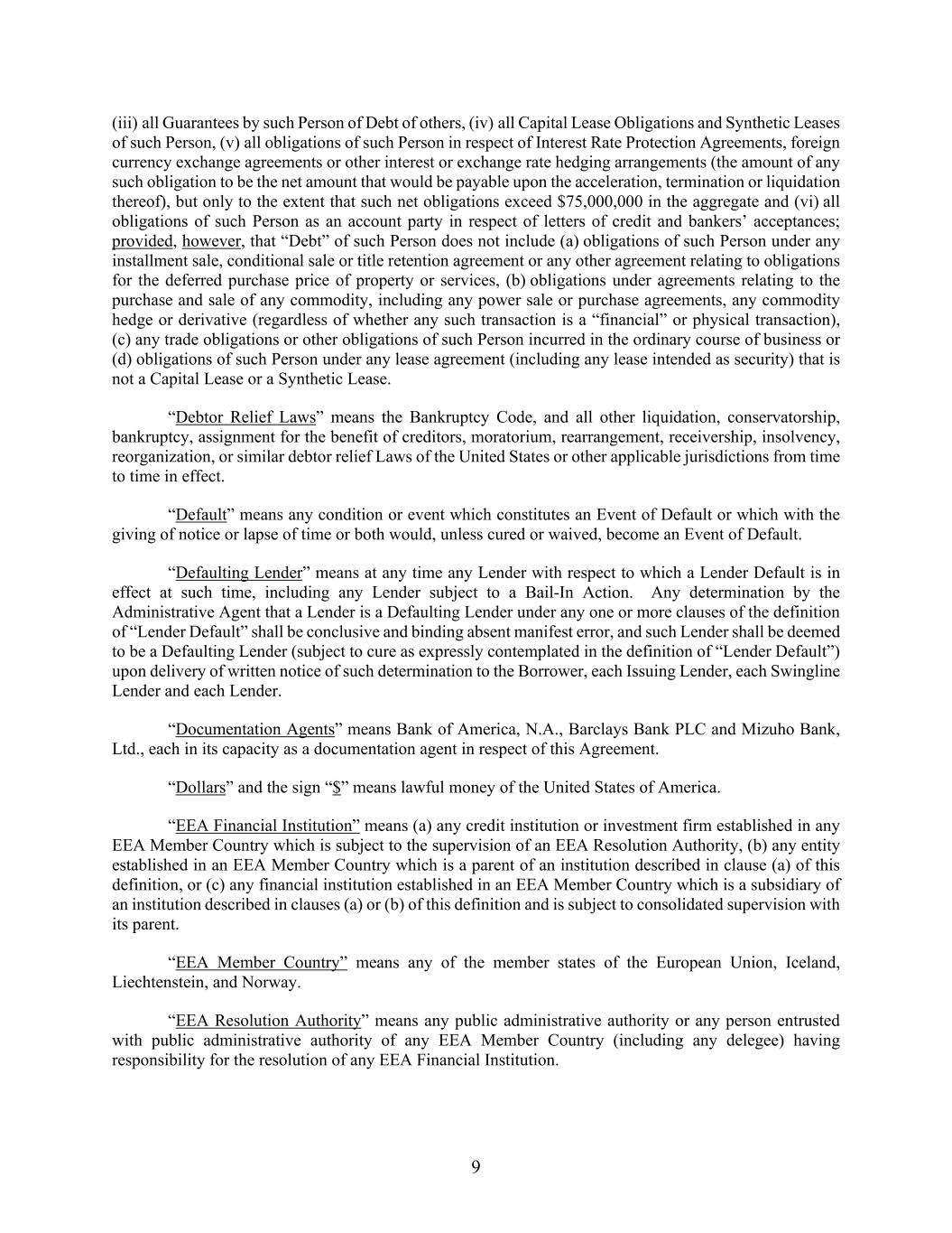 9 (iii) all Guarantees by such Person of Debt of others, (iv) all Capital Lease Obligations and Synthetic Leases of such Person, (v) all obligations of such Person in respect of Interest Rate Protection Agreements, foreign currency exchange agreements or other interest or exchange rate hedging arrangements (the amount of any such obligation to be the net amount that would be payable upon the acceleration, termination or liquidation thereof), but only to the extent that such net obligations exceed $75,000,000 in the aggregate and (vi) all obligations of such Person as an account party in respect of letters of credit and bankers’ acceptances; provided, however, that “Debt” of such Person does not include (a) obligations of such Person under any installment sale, conditional sale or title retention agreement or any other agreement relating to obligations for the deferred purchase price of property or services, (b) obligations under agreements relating to the purchase and sale of any commodity, including any power sale or purchase agreements, any commodity hedge or derivative (regardless of whether any such transaction is a “financial” or physical transaction), (c) any trade obligations or other obligations of such Person incurred in the ordinary course of business or (d) obligations of such Person under any lease agreement (including any lease intended as security) that is not a Capital Lease or a Synthetic Lease. “Debtor Relief Laws” means the Bankruptcy Code, and all other liquidation, conservatorship, bankruptcy, assignment for the benefit of creditors, moratorium, rearrangement, receivership, insolvency, reorganization, or similar debtor relief Laws of the United States or other applicable jurisdictions from time to time in effect. “Default” means any condition or event which constitutes an Event of Default or which with the giving of notice or lapse of time or both would, unless cured or waived, become an Event of Default. “Defaulting Lender” means at any time any Lender with respect to which a Lender Default is in effect at such time, including any Lender subject to a Bail-In Action. Any determination by the Administrative Agent that a Lender is a Defaulting Lender under any one or more clauses of the definition of “Lender Default” shall be conclusive and binding absent manifest error, and such Lender shall be deemed to be a Defaulting Lender (subject to cure as expressly contemplated in the definition of “Lender Default”) upon delivery of written notice of such determination to the Borrower, each Issuing Lender, each Swingline Lender and each Lender. “Documentation Agents” means Bank of America, N.A., Barclays Bank PLC and Mizuho Bank, Ltd., each in its capacity as a documentation agent in respect of this Agreement. “Dollars” and the sign “$” means lawful money of the United States of America. “EEA Financial Institution” means (a) any credit institution or investment firm established in any EEA Member Country which is subject to the supervision of an EEA Resolution Authority, (b) any entity established in an EEA Member Country which is a parent of an institution described in clause (a) of this definition, or (c) any financial institution established in an EEA Member Country which is a subsidiary of an institution described in clauses (a) or (b) of this definition and is subject to consolidated supervision with its parent. “EEA Member Country” means any of the member states of the European Union, Iceland, Liechtenstein, and Norway. “EEA Resolution Authority” means any public administrative authority or any person entrusted with public administrative authority of any EEA Member Country (including any delegee) having responsibility for the resolution of any EEA Financial Institution.
