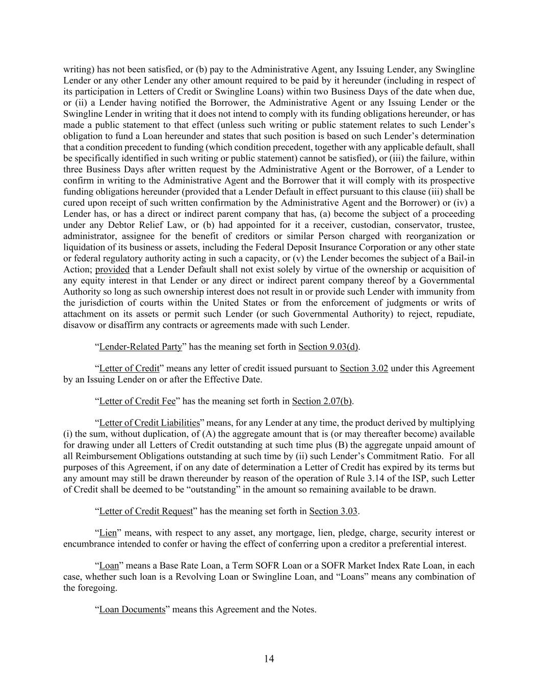 14 writing) has not been satisfied, or (b) pay to the Administrative Agent, any Issuing Lender, any Swingline Lender or any other Lender any other amount required to be paid by it hereunder (including in respect of its participation in Letters of Credit or Swingline Loans) within two Business Days of the date when due, or (ii) a Lender having notified the Borrower, the Administrative Agent or any Issuing Lender or the Swingline Lender in writing that it does not intend to comply with its funding obligations hereunder, or has made a public statement to that effect (unless such writing or public statement relates to such Lender’s obligation to fund a Loan hereunder and states that such position is based on such Lender’s determination that a condition precedent to funding (which condition precedent, together with any applicable default, shall be specifically identified in such writing or public statement) cannot be satisfied), or (iii) the failure, within three Business Days after written request by the Administrative Agent or the Borrower, of a Lender to confirm in writing to the Administrative Agent and the Borrower that it will comply with its prospective funding obligations hereunder (provided that a Lender Default in effect pursuant to this clause (iii) shall be cured upon receipt of such written confirmation by the Administrative Agent and the Borrower) or (iv) a Lender has, or has a direct or indirect parent company that has, (a) become the subject of a proceeding under any Debtor Relief Law, or (b) had appointed for it a receiver, custodian, conservator, trustee, administrator, assignee for the benefit of creditors or similar Person charged with reorganization or liquidation of its business or assets, including the Federal Deposit Insurance Corporation or any other state or federal regulatory authority acting in such a capacity, or (v) the Lender becomes the subject of a Bail-in Action; provided that a Lender Default shall not exist solely by virtue of the ownership or acquisition of any equity interest in that Lender or any direct or indirect parent company thereof by a Governmental Authority so long as such ownership interest does not result in or provide such Lender with immunity from the jurisdiction of courts within the United States or from the enforcement of judgments or writs of attachment on its assets or permit such Lender (or such Governmental Authority) to reject, repudiate, disavow or disaffirm any contracts or agreements made with such Lender. “Lender-Related Party” has the meaning set forth in Section 9.03(d). “Letter of Credit” means any letter of credit issued pursuant to Section 3.02 under this Agreement by an Issuing Lender on or after the Effective Date. “Letter of Credit Fee” has the meaning set forth in Section 2.07(b). “Letter of Credit Liabilities” means, for any Lender at any time, the product derived by multiplying (i) the sum, without duplication, of (A) the aggregate amount that is (or may thereafter become) available for drawing under all Letters of Credit outstanding at such time plus (B) the aggregate unpaid amount of all Reimbursement Obligations outstanding at such time by (ii) such Lender’s Commitment Ratio. For all purposes of this Agreement, if on any date of determination a Letter of Credit has expired by its terms but any amount may still be drawn thereunder by reason of the operation of Rule 3.14 of the ISP, such Letter of Credit shall be deemed to be “outstanding” in the amount so remaining available to be drawn. “Letter of Credit Request” has the meaning set forth in Section 3.03. “Lien” means, with respect to any asset, any mortgage, lien, pledge, charge, security interest or encumbrance intended to confer or having the effect of conferring upon a creditor a preferential interest. “Loan” means a Base Rate Loan, a Term SOFR Loan or a SOFR Market Index Rate Loan, in each case, whether such loan is a Revolving Loan or Swingline Loan, and “Loans” means any combination of the foregoing. “Loan Documents” means this Agreement and the Notes.
