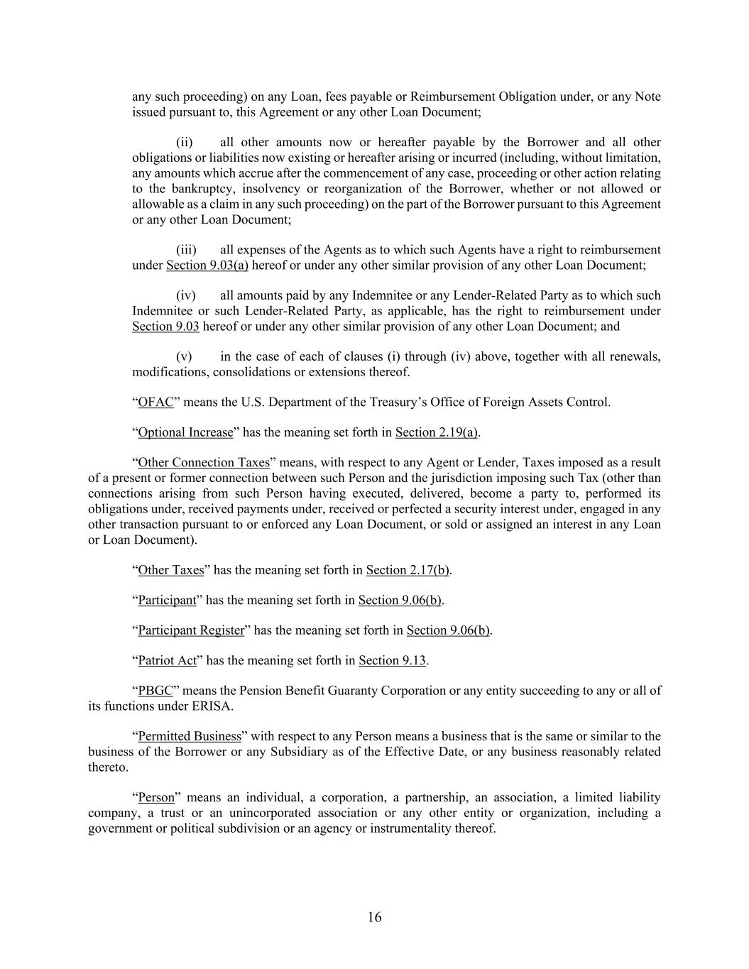 16 any such proceeding) on any Loan, fees payable or Reimbursement Obligation under, or any Note issued pursuant to, this Agreement or any other Loan Document; (ii) all other amounts now or hereafter payable by the Borrower and all other obligations or liabilities now existing or hereafter arising or incurred (including, without limitation, any amounts which accrue after the commencement of any case, proceeding or other action relating to the bankruptcy, insolvency or reorganization of the Borrower, whether or not allowed or allowable as a claim in any such proceeding) on the part of the Borrower pursuant to this Agreement or any other Loan Document; (iii) all expenses of the Agents as to which such Agents have a right to reimbursement under Section 9.03(a) hereof or under any other similar provision of any other Loan Document; (iv) all amounts paid by any Indemnitee or any Lender-Related Party as to which such Indemnitee or such Lender-Related Party, as applicable, has the right to reimbursement under Section 9.03 hereof or under any other similar provision of any other Loan Document; and (v) in the case of each of clauses (i) through (iv) above, together with all renewals, modifications, consolidations or extensions thereof. “OFAC” means the U.S. Department of the Treasury’s Office of Foreign Assets Control. “Optional Increase” has the meaning set forth in Section 2.19(a). “Other Connection Taxes” means, with respect to any Agent or Lender, Taxes imposed as a result of a present or former connection between such Person and the jurisdiction imposing such Tax (other than connections arising from such Person having executed, delivered, become a party to, performed its obligations under, received payments under, received or perfected a security interest under, engaged in any other transaction pursuant to or enforced any Loan Document, or sold or assigned an interest in any Loan or Loan Document). “Other Taxes” has the meaning set forth in Section 2.17(b). “Participant” has the meaning set forth in Section 9.06(b). “Participant Register” has the meaning set forth in Section 9.06(b). “Patriot Act” has the meaning set forth in Section 9.13. “PBGC” means the Pension Benefit Guaranty Corporation or any entity succeeding to any or all of its functions under ERISA. “Permitted Business” with respect to any Person means a business that is the same or similar to the business of the Borrower or any Subsidiary as of the Effective Date, or any business reasonably related thereto. “Person” means an individual, a corporation, a partnership, an association, a limited liability company, a trust or an unincorporated association or any other entity or organization, including a government or political subdivision or an agency or instrumentality thereof.