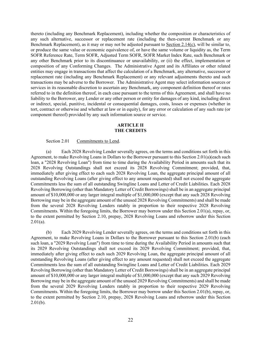 22 thereto (including any Benchmark Replacement), including whether the composition or characteristics of any such alternative, successor or replacement rate (including the then-current Benchmark or any Benchmark Replacement), as it may or may not be adjusted pursuant to Section 2.14(c), will be similar to, or produce the same value or economic equivalence of, or have the same volume or liquidity as, the Term SOFR Reference Rate, Term SOFR, Adjusted Term SOFR, SOFR Market Index Rate, such Benchmark or any other Benchmark prior to its discontinuance or unavailability, or (ii) the effect, implementation or composition of any Conforming Changes. The Administrative Agent and its Affiliates or other related entities may engage in transactions that affect the calculation of a Benchmark, any alternative, successor or replacement rate (including any Benchmark Replacement) or any relevant adjustments thereto and such transactions may be adverse to the Borrower. The Administrative Agent may select information sources or services in its reasonable discretion to ascertain any Benchmark, any component definition thereof or rates referred to in the definition thereof, in each case pursuant to the terms of this Agreement, and shall have no liability to the Borrower, any Lender or any other person or entity for damages of any kind, including direct or indirect, special, punitive, incidental or consequential damages, costs, losses or expenses (whether in tort, contract or otherwise and whether at law or in equity), for any error or calculation of any such rate (or component thereof) provided by any such information source or service. ARTICLE II THE CREDITS Section 2.01 Commitments to Lend. (a) Each 2028 Revolving Lender severally agrees, on the terms and conditions set forth in this Agreement, to make Revolving Loans in Dollars to the Borrower pursuant to this Section 2.01(a)(each such loan, a "2028 Revolving Loan") from time to time during the Availability Period in amounts such that its 2028 Revolving Outstandings shall not exceed its 2028 Revolving Commitment; provided, that, immediately after giving effect to each such 2028 Revolving Loan, the aggregate principal amount of all outstanding Revolving Loans (after giving effect to any amount requested) shall not exceed the aggregate Commitments less the sum of all outstanding Swingline Loans and Letter of Credit Liabilities. Each 2028 Revolving Borrowing (other than Mandatory Letter of Credit Borrowings) shall be in an aggregate principal amount of $10,000,000 or any larger integral multiple of $1,000,000 (except that any such 2028 Revolving Borrowing may be in the aggregate amount of the unused 2028 Revolving Commitments) and shall be made from the several 2028 Revolving Lenders ratably in proportion to their respective 2028 Revolving Commitments. Within the foregoing limits, the Borrower may borrow under this Section 2.01(a), repay, or, to the extent permitted by Section 2.10, prepay, 2028 Revolving Loans and reborrow under this Section 2.01(a). (b) Each 2029 Revolving Lender severally agrees, on the terms and conditions set forth in this Agreement, to make Revolving Loans in Dollars to the Borrower pursuant to this Section 2.01(b) (each such loan, a "2029 Revolving Loan") from time to time during the Availability Period in amounts such that its 2029 Revolving Outstandings shall not exceed its 2029 Revolving Commitment; provided, that, immediately after giving effect to each such 2029 Revolving Loan, the aggregate principal amount of all outstanding Revolving Loans (after giving effect to any amount requested) shall not exceed the aggregate Commitments less the sum of all outstanding Swingline Loans and Letter of Credit Liabilities. Each 2029 Revolving Borrowing (other than Mandatory Letter of Credit Borrowings) shall be in an aggregate principal amount of $10,000,000 or any larger integral multiple of $1,000,000 (except that any such 2029 Revolving Borrowing may be in the aggregate amount of the unused 2029 Revolving Commitments) and shall be made from the several 2029 Revolving Lenders ratably in proportion to their respective 2029 Revolving Commitments. Within the foregoing limits, the Borrower may borrow under this Section 2.01(b), repay, or, to the extent permitted by Section 2.10, prepay, 2028 Revolving Loans and reborrow under this Section 2.01(b).