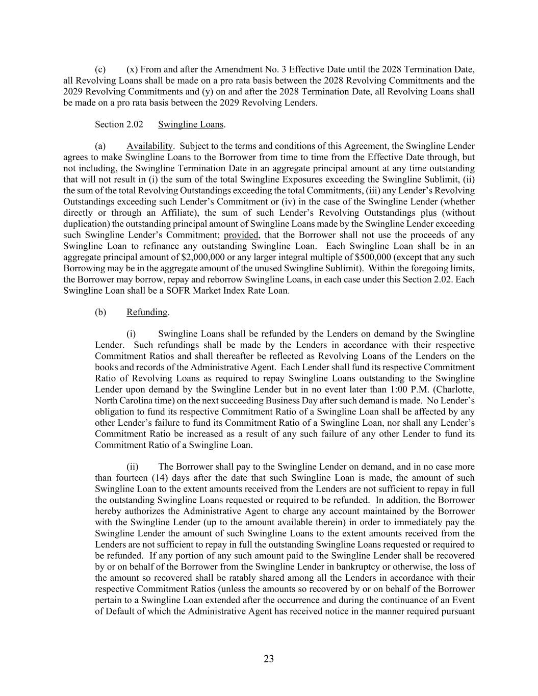23 (c) (x) From and after the Amendment No. 3 Effective Date until the 2028 Termination Date, all Revolving Loans shall be made on a pro rata basis between the 2028 Revolving Commitments and the 2029 Revolving Commitments and (y) on and after the 2028 Termination Date, all Revolving Loans shall be made on a pro rata basis between the 2029 Revolving Lenders. Section 2.02 Swingline Loans. (a) Availability. Subject to the terms and conditions of this Agreement, the Swingline Lender agrees to make Swingline Loans to the Borrower from time to time from the Effective Date through, but not including, the Swingline Termination Date in an aggregate principal amount at any time outstanding that will not result in (i) the sum of the total Swingline Exposures exceeding the Swingline Sublimit, (ii) the sum of the total Revolving Outstandings exceeding the total Commitments, (iii) any Lender’s Revolving Outstandings exceeding such Lender’s Commitment or (iv) in the case of the Swingline Lender (whether directly or through an Affiliate), the sum of such Lender’s Revolving Outstandings plus (without duplication) the outstanding principal amount of Swingline Loans made by the Swingline Lender exceeding such Swingline Lender’s Commitment; provided, that the Borrower shall not use the proceeds of any Swingline Loan to refinance any outstanding Swingline Loan. Each Swingline Loan shall be in an aggregate principal amount of $2,000,000 or any larger integral multiple of $500,000 (except that any such Borrowing may be in the aggregate amount of the unused Swingline Sublimit). Within the foregoing limits, the Borrower may borrow, repay and reborrow Swingline Loans, in each case under this Section 2.02. Each Swingline Loan shall be a SOFR Market Index Rate Loan. (b) Refunding. (i) Swingline Loans shall be refunded by the Lenders on demand by the Swingline Lender. Such refundings shall be made by the Lenders in accordance with their respective Commitment Ratios and shall thereafter be reflected as Revolving Loans of the Lenders on the books and records of the Administrative Agent. Each Lender shall fund its respective Commitment Ratio of Revolving Loans as required to repay Swingline Loans outstanding to the Swingline Lender upon demand by the Swingline Lender but in no event later than 1:00 P.M. (Charlotte, North Carolina time) on the next succeeding Business Day after such demand is made. No Lender’s obligation to fund its respective Commitment Ratio of a Swingline Loan shall be affected by any other Lender’s failure to fund its Commitment Ratio of a Swingline Loan, nor shall any Lender’s Commitment Ratio be increased as a result of any such failure of any other Lender to fund its Commitment Ratio of a Swingline Loan. (ii) The Borrower shall pay to the Swingline Lender on demand, and in no case more than fourteen (14) days after the date that such Swingline Loan is made, the amount of such Swingline Loan to the extent amounts received from the Lenders are not sufficient to repay in full the outstanding Swingline Loans requested or required to be refunded. In addition, the Borrower hereby authorizes the Administrative Agent to charge any account maintained by the Borrower with the Swingline Lender (up to the amount available therein) in order to immediately pay the Swingline Lender the amount of such Swingline Loans to the extent amounts received from the Lenders are not sufficient to repay in full the outstanding Swingline Loans requested or required to be refunded. If any portion of any such amount paid to the Swingline Lender shall be recovered by or on behalf of the Borrower from the Swingline Lender in bankruptcy or otherwise, the loss of the amount so recovered shall be ratably shared among all the Lenders in accordance with their respective Commitment Ratios (unless the amounts so recovered by or on behalf of the Borrower pertain to a Swingline Loan extended after the occurrence and during the continuance of an Event of Default of which the Administrative Agent has received notice in the manner required pursuant