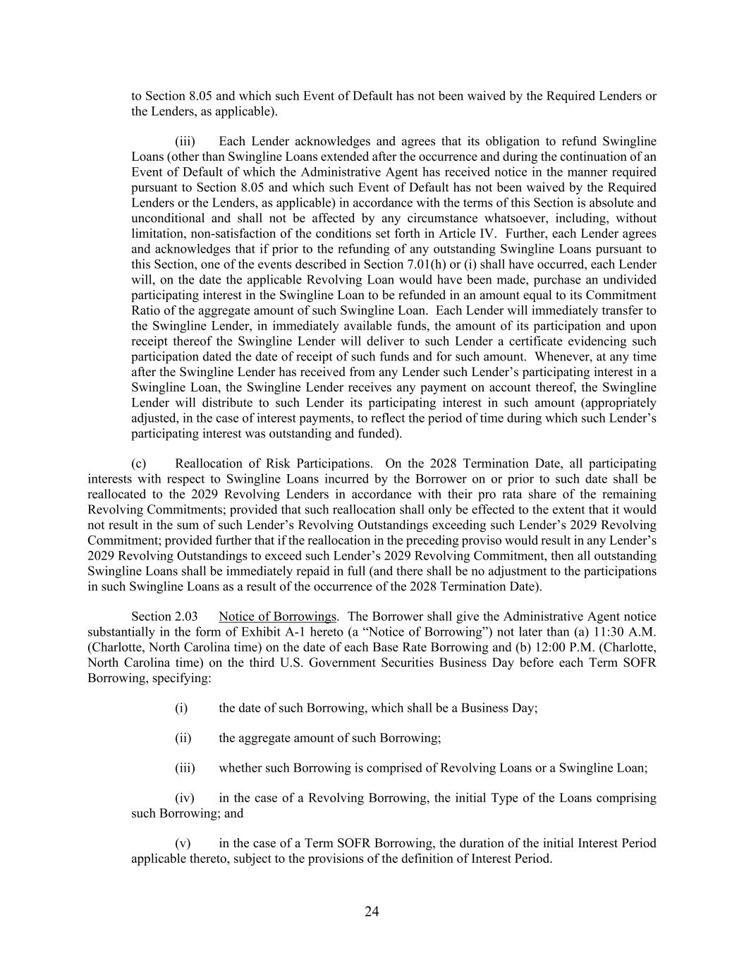 24 to Section 8.05 and which such Event of Default has not been waived by the Required Lenders or the Lenders, as applicable). (iii) Each Lender acknowledges and agrees that its obligation to refund Swingline Loans (other than Swingline Loans extended after the occurrence and during the continuation of an Event of Default of which the Administrative Agent has received notice in the manner required pursuant to Section 8.05 and which such Event of Default has not been waived by the Required Lenders or the Lenders, as applicable) in accordance with the terms of this Section is absolute and unconditional and shall not be affected by any circumstance whatsoever, including, without limitation, non-satisfaction of the conditions set forth in Article IV. Further, each Lender agrees and acknowledges that if prior to the refunding of any outstanding Swingline Loans pursuant to this Section, one of the events described in Section 7.01(h) or (i) shall have occurred, each Lender will, on the date the applicable Revolving Loan would have been made, purchase an undivided participating interest in the Swingline Loan to be refunded in an amount equal to its Commitment Ratio of the aggregate amount of such Swingline Loan. Each Lender will immediately transfer to the Swingline Lender, in immediately available funds, the amount of its participation and upon receipt thereof the Swingline Lender will deliver to such Lender a certificate evidencing such participation dated the date of receipt of such funds and for such amount. Whenever, at any time after the Swingline Lender has received from any Lender such Lender’s participating interest in a Swingline Loan, the Swingline Lender receives any payment on account thereof, the Swingline Lender will distribute to such Lender its participating interest in such amount (appropriately adjusted, in the case of interest payments, to reflect the period of time during which such Lender’s participating interest was outstanding and funded). (c) Reallocation of Risk Participations. On the 2028 Termination Date, all participating interests with respect to Swingline Loans incurred by the Borrower on or prior to such date shall be reallocated to the 2029 Revolving Lenders in accordance with their pro rata share of the remaining Revolving Commitments; provided that such reallocation shall only be effected to the extent that it would not result in the sum of such Lender’s Revolving Outstandings exceeding such Lender’s 2029 Revolving Commitment; provided further that if the reallocation in the preceding proviso would result in any Lender’s 2029 Revolving Outstandings to exceed such Lender’s 2029 Revolving Commitment, then all outstanding Swingline Loans shall be immediately repaid in full (and there shall be no adjustment to the participations in such Swingline Loans as a result of the occurrence of the 2028 Termination Date). Section 2.03 Notice of Borrowings. The Borrower shall give the Administrative Agent notice substantially in the form of Exhibit A-1 hereto (a “Notice of Borrowing”) not later than (a) 11:30 A.M. (Charlotte, North Carolina time) on the date of each Base Rate Borrowing and (b) 12:00 P.M. (Charlotte, North Carolina time) on the third U.S. Government Securities Business Day before each Term SOFR Borrowing, specifying: (i) the date of such Borrowing, which shall be a Business Day; (ii) the aggregate amount of such Borrowing; (iii) whether such Borrowing is comprised of Revolving Loans or a Swingline Loan; (iv) in the case of a Revolving Borrowing, the initial Type of the Loans comprising such Borrowing; and (v) in the case of a Term SOFR Borrowing, the duration of the initial Interest Period applicable thereto, subject to the provisions of the definition of Interest Period.