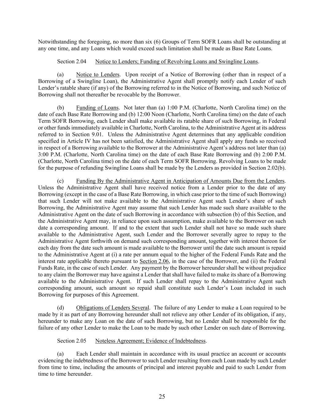 25 Notwithstanding the foregoing, no more than six (6) Groups of Term SOFR Loans shall be outstanding at any one time, and any Loans which would exceed such limitation shall be made as Base Rate Loans. Section 2.04 Notice to Lenders; Funding of Revolving Loans and Swingline Loans. (a) Notice to Lenders. Upon receipt of a Notice of Borrowing (other than in respect of a Borrowing of a Swingline Loan), the Administrative Agent shall promptly notify each Lender of such Lender’s ratable share (if any) of the Borrowing referred to in the Notice of Borrowing, and such Notice of Borrowing shall not thereafter be revocable by the Borrower. (b) Funding of Loans. Not later than (a) 1:00 P.M. (Charlotte, North Carolina time) on the date of each Base Rate Borrowing and (b) 12:00 Noon (Charlotte, North Carolina time) on the date of each Term SOFR Borrowing, each Lender shall make available its ratable share of such Borrowing, in Federal or other funds immediately available in Charlotte, North Carolina, to the Administrative Agent at its address referred to in Section 9.01. Unless the Administrative Agent determines that any applicable condition specified in Article IV has not been satisfied, the Administrative Agent shall apply any funds so received in respect of a Borrowing available to the Borrower at the Administrative Agent’s address not later than (a) 3:00 P.M. (Charlotte, North Carolina time) on the date of each Base Rate Borrowing and (b) 2:00 P.M. (Charlotte, North Carolina time) on the date of each Term SOFR Borrowing. Revolving Loans to be made for the purpose of refunding Swingline Loans shall be made by the Lenders as provided in Section 2.02(b). (c) Funding By the Administrative Agent in Anticipation of Amounts Due from the Lenders. Unless the Administrative Agent shall have received notice from a Lender prior to the date of any Borrowing (except in the case of a Base Rate Borrowing, in which case prior to the time of such Borrowing) that such Lender will not make available to the Administrative Agent such Lender’s share of such Borrowing, the Administrative Agent may assume that such Lender has made such share available to the Administrative Agent on the date of such Borrowing in accordance with subsection (b) of this Section, and the Administrative Agent may, in reliance upon such assumption, make available to the Borrower on such date a corresponding amount. If and to the extent that such Lender shall not have so made such share available to the Administrative Agent, such Lender and the Borrower severally agree to repay to the Administrative Agent forthwith on demand such corresponding amount, together with interest thereon for each day from the date such amount is made available to the Borrower until the date such amount is repaid to the Administrative Agent at (i) a rate per annum equal to the higher of the Federal Funds Rate and the interest rate applicable thereto pursuant to Section 2.06, in the case of the Borrower, and (ii) the Federal Funds Rate, in the case of such Lender. Any payment by the Borrower hereunder shall be without prejudice to any claim the Borrower may have against a Lender that shall have failed to make its share of a Borrowing available to the Administrative Agent. If such Lender shall repay to the Administrative Agent such corresponding amount, such amount so repaid shall constitute such Lender’s Loan included in such Borrowing for purposes of this Agreement. (d) Obligations of Lenders Several. The failure of any Lender to make a Loan required to be made by it as part of any Borrowing hereunder shall not relieve any other Lender of its obligation, if any, hereunder to make any Loan on the date of such Borrowing, but no Lender shall be responsible for the failure of any other Lender to make the Loan to be made by such other Lender on such date of Borrowing. Section 2.05 Noteless Agreement; Evidence of Indebtedness. (a) Each Lender shall maintain in accordance with its usual practice an account or accounts evidencing the indebtedness of the Borrower to such Lender resulting from each Loan made by such Lender from time to time, including the amounts of principal and interest payable and paid to such Lender from time to time hereunder.