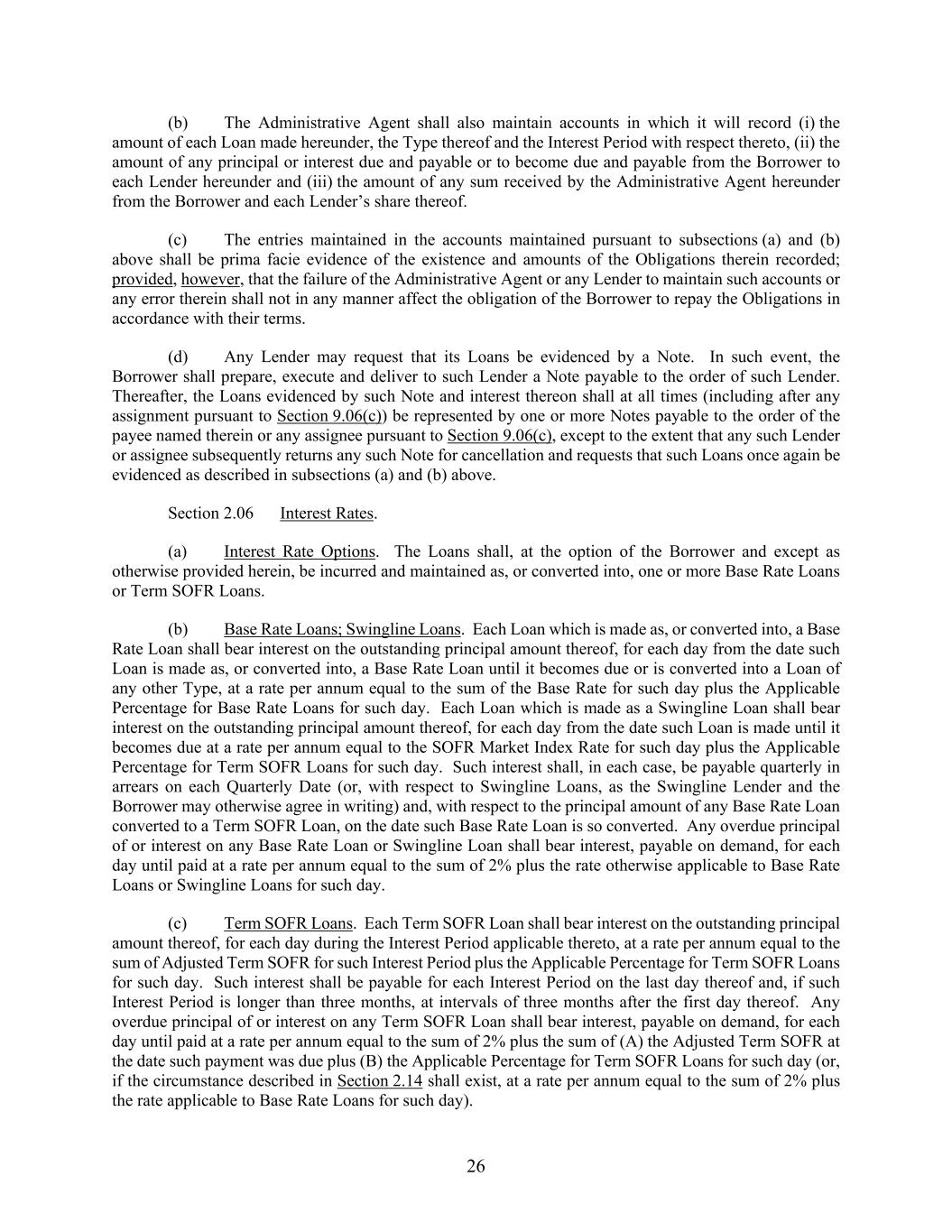 26 (b) The Administrative Agent shall also maintain accounts in which it will record (i) the amount of each Loan made hereunder, the Type thereof and the Interest Period with respect thereto, (ii) the amount of any principal or interest due and payable or to become due and payable from the Borrower to each Lender hereunder and (iii) the amount of any sum received by the Administrative Agent hereunder from the Borrower and each Lender’s share thereof. (c) The entries maintained in the accounts maintained pursuant to subsections (a) and (b) above shall be prima facie evidence of the existence and amounts of the Obligations therein recorded; provided, however, that the failure of the Administrative Agent or any Lender to maintain such accounts or any error therein shall not in any manner affect the obligation of the Borrower to repay the Obligations in accordance with their terms. (d) Any Lender may request that its Loans be evidenced by a Note. In such event, the Borrower shall prepare, execute and deliver to such Lender a Note payable to the order of such Lender. Thereafter, the Loans evidenced by such Note and interest thereon shall at all times (including after any assignment pursuant to Section 9.06(c)) be represented by one or more Notes payable to the order of the payee named therein or any assignee pursuant to Section 9.06(c), except to the extent that any such Lender or assignee subsequently returns any such Note for cancellation and requests that such Loans once again be evidenced as described in subsections (a) and (b) above. Section 2.06 Interest Rates. (a) Interest Rate Options. The Loans shall, at the option of the Borrower and except as otherwise provided herein, be incurred and maintained as, or converted into, one or more Base Rate Loans or Term SOFR Loans. (b) Base Rate Loans; Swingline Loans. Each Loan which is made as, or converted into, a Base Rate Loan shall bear interest on the outstanding principal amount thereof, for each day from the date such Loan is made as, or converted into, a Base Rate Loan until it becomes due or is converted into a Loan of any other Type, at a rate per annum equal to the sum of the Base Rate for such day plus the Applicable Percentage for Base Rate Loans for such day. Each Loan which is made as a Swingline Loan shall bear interest on the outstanding principal amount thereof, for each day from the date such Loan is made until it becomes due at a rate per annum equal to the SOFR Market Index Rate for such day plus the Applicable Percentage for Term SOFR Loans for such day. Such interest shall, in each case, be payable quarterly in arrears on each Quarterly Date (or, with respect to Swingline Loans, as the Swingline Lender and the Borrower may otherwise agree in writing) and, with respect to the principal amount of any Base Rate Loan converted to a Term SOFR Loan, on the date such Base Rate Loan is so converted. Any overdue principal of or interest on any Base Rate Loan or Swingline Loan shall bear interest, payable on demand, for each day until paid at a rate per annum equal to the sum of 2% plus the rate otherwise applicable to Base Rate Loans or Swingline Loans for such day. (c) Term SOFR Loans. Each Term SOFR Loan shall bear interest on the outstanding principal amount thereof, for each day during the Interest Period applicable thereto, at a rate per annum equal to the sum of Adjusted Term SOFR for such Interest Period plus the Applicable Percentage for Term SOFR Loans for such day. Such interest shall be payable for each Interest Period on the last day thereof and, if such Interest Period is longer than three months, at intervals of three months after the first day thereof. Any overdue principal of or interest on any Term SOFR Loan shall bear interest, payable on demand, for each day until paid at a rate per annum equal to the sum of 2% plus the sum of (A) the Adjusted Term SOFR at the date such payment was due plus (B) the Applicable Percentage for Term SOFR Loans for such day (or, if the circumstance described in Section 2.14 shall exist, at a rate per annum equal to the sum of 2% plus the rate applicable to Base Rate Loans for such day).