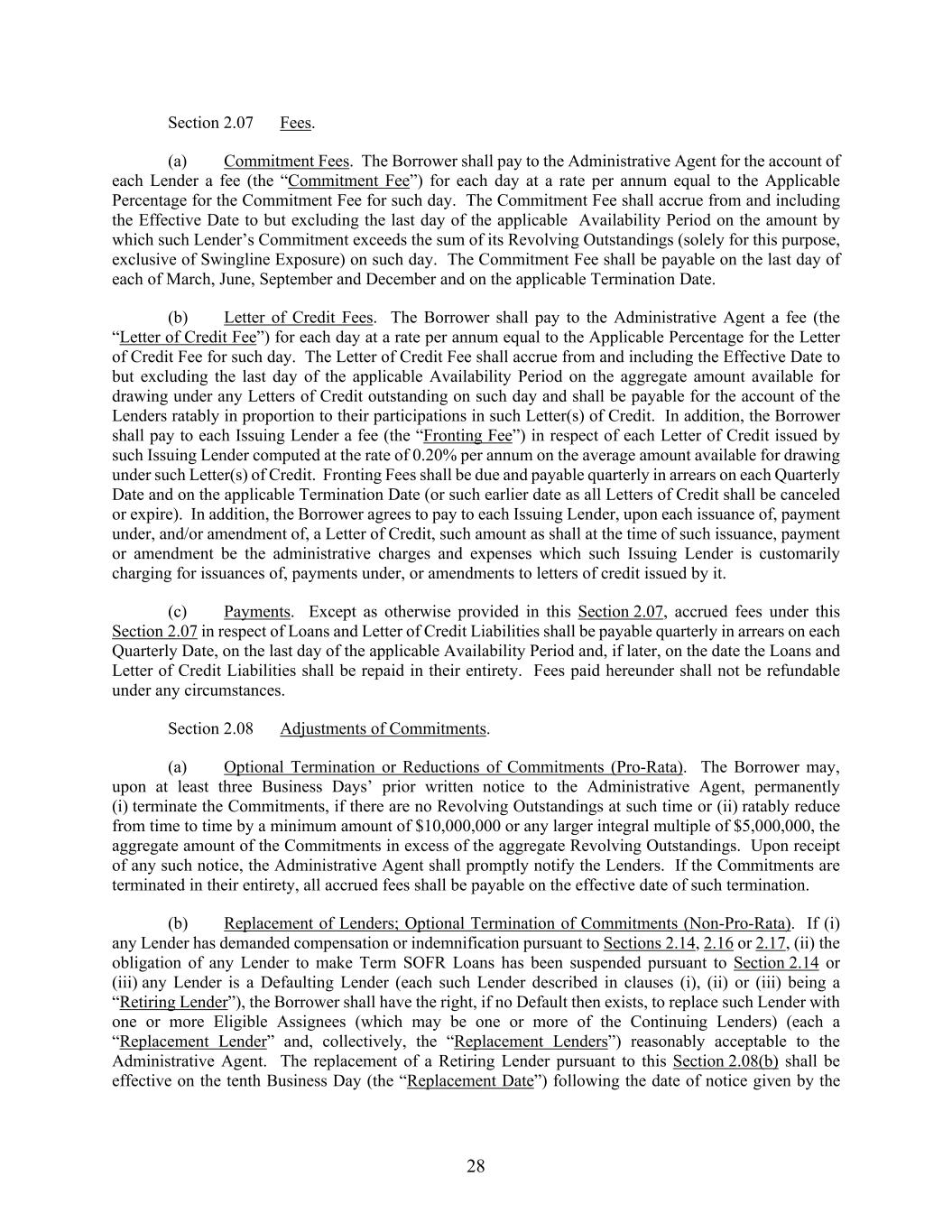 28 Section 2.07 Fees. (a) Commitment Fees. The Borrower shall pay to the Administrative Agent for the account of each Lender a fee (the “Commitment Fee”) for each day at a rate per annum equal to the Applicable Percentage for the Commitment Fee for such day. The Commitment Fee shall accrue from and including the Effective Date to but excluding the last day of the applicable Availability Period on the amount by which such Lender’s Commitment exceeds the sum of its Revolving Outstandings (solely for this purpose, exclusive of Swingline Exposure) on such day. The Commitment Fee shall be payable on the last day of each of March, June, September and December and on the applicable Termination Date. (b) Letter of Credit Fees. The Borrower shall pay to the Administrative Agent a fee (the “Letter of Credit Fee”) for each day at a rate per annum equal to the Applicable Percentage for the Letter of Credit Fee for such day. The Letter of Credit Fee shall accrue from and including the Effective Date to but excluding the last day of the applicable Availability Period on the aggregate amount available for drawing under any Letters of Credit outstanding on such day and shall be payable for the account of the Lenders ratably in proportion to their participations in such Letter(s) of Credit. In addition, the Borrower shall pay to each Issuing Lender a fee (the “Fronting Fee”) in respect of each Letter of Credit issued by such Issuing Lender computed at the rate of 0.20% per annum on the average amount available for drawing under such Letter(s) of Credit. Fronting Fees shall be due and payable quarterly in arrears on each Quarterly Date and on the applicable Termination Date (or such earlier date as all Letters of Credit shall be canceled or expire). In addition, the Borrower agrees to pay to each Issuing Lender, upon each issuance of, payment under, and/or amendment of, a Letter of Credit, such amount as shall at the time of such issuance, payment or amendment be the administrative charges and expenses which such Issuing Lender is customarily charging for issuances of, payments under, or amendments to letters of credit issued by it. (c) Payments. Except as otherwise provided in this Section 2.07, accrued fees under this Section 2.07 in respect of Loans and Letter of Credit Liabilities shall be payable quarterly in arrears on each Quarterly Date, on the last day of the applicable Availability Period and, if later, on the date the Loans and Letter of Credit Liabilities shall be repaid in their entirety. Fees paid hereunder shall not be refundable under any circumstances. Section 2.08 Adjustments of Commitments. (a) Optional Termination or Reductions of Commitments (Pro-Rata). The Borrower may, upon at least three Business Days’ prior written notice to the Administrative Agent, permanently (i) terminate the Commitments, if there are no Revolving Outstandings at such time or (ii) ratably reduce from time to time by a minimum amount of $10,000,000 or any larger integral multiple of $5,000,000, the aggregate amount of the Commitments in excess of the aggregate Revolving Outstandings. Upon receipt of any such notice, the Administrative Agent shall promptly notify the Lenders. If the Commitments are terminated in their entirety, all accrued fees shall be payable on the effective date of such termination. (b) Replacement of Lenders; Optional Termination of Commitments (Non-Pro-Rata). If (i) any Lender has demanded compensation or indemnification pursuant to Sections 2.14, 2.16 or 2.17, (ii) the obligation of any Lender to make Term SOFR Loans has been suspended pursuant to Section 2.14 or (iii) any Lender is a Defaulting Lender (each such Lender described in clauses (i), (ii) or (iii) being a “Retiring Lender”), the Borrower shall have the right, if no Default then exists, to replace such Lender with one or more Eligible Assignees (which may be one or more of the Continuing Lenders) (each a “Replacement Lender” and, collectively, the “Replacement Lenders”) reasonably acceptable to the Administrative Agent. The replacement of a Retiring Lender pursuant to this Section 2.08(b) shall be effective on the tenth Business Day (the “Replacement Date”) following the date of notice given by the