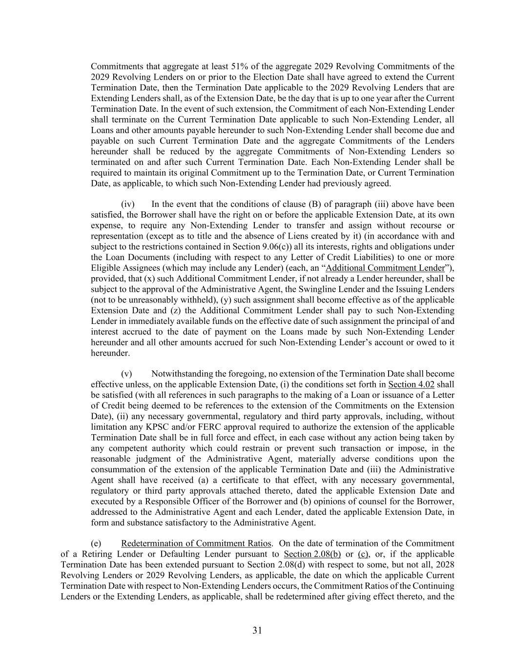 31 Commitments that aggregate at least 51% of the aggregate 2029 Revolving Commitments of the 2029 Revolving Lenders on or prior to the Election Date shall have agreed to extend the Current Termination Date, then the Termination Date applicable to the 2029 Revolving Lenders that are Extending Lenders shall, as of the Extension Date, be the day that is up to one year after the Current Termination Date. In the event of such extension, the Commitment of each Non-Extending Lender shall terminate on the Current Termination Date applicable to such Non-Extending Lender, all Loans and other amounts payable hereunder to such Non-Extending Lender shall become due and payable on such Current Termination Date and the aggregate Commitments of the Lenders hereunder shall be reduced by the aggregate Commitments of Non-Extending Lenders so terminated on and after such Current Termination Date. Each Non-Extending Lender shall be required to maintain its original Commitment up to the Termination Date, or Current Termination Date, as applicable, to which such Non-Extending Lender had previously agreed. (iv) In the event that the conditions of clause (B) of paragraph (iii) above have been satisfied, the Borrower shall have the right on or before the applicable Extension Date, at its own expense, to require any Non-Extending Lender to transfer and assign without recourse or representation (except as to title and the absence of Liens created by it) (in accordance with and subject to the restrictions contained in Section 9.06(c)) all its interests, rights and obligations under the Loan Documents (including with respect to any Letter of Credit Liabilities) to one or more Eligible Assignees (which may include any Lender) (each, an “Additional Commitment Lender”), provided, that (x) such Additional Commitment Lender, if not already a Lender hereunder, shall be subject to the approval of the Administrative Agent, the Swingline Lender and the Issuing Lenders (not to be unreasonably withheld), (y) such assignment shall become effective as of the applicable Extension Date and (z) the Additional Commitment Lender shall pay to such Non-Extending Lender in immediately available funds on the effective date of such assignment the principal of and interest accrued to the date of payment on the Loans made by such Non-Extending Lender hereunder and all other amounts accrued for such Non-Extending Lender’s account or owed to it hereunder. (v) Notwithstanding the foregoing, no extension of the Termination Date shall become effective unless, on the applicable Extension Date, (i) the conditions set forth in Section 4.02 shall be satisfied (with all references in such paragraphs to the making of a Loan or issuance of a Letter of Credit being deemed to be references to the extension of the Commitments on the Extension Date), (ii) any necessary governmental, regulatory and third party approvals, including, without limitation any KPSC and/or FERC approval required to authorize the extension of the applicable Termination Date shall be in full force and effect, in each case without any action being taken by any competent authority which could restrain or prevent such transaction or impose, in the reasonable judgment of the Administrative Agent, materially adverse conditions upon the consummation of the extension of the applicable Termination Date and (iii) the Administrative Agent shall have received (a) a certificate to that effect, with any necessary governmental, regulatory or third party approvals attached thereto, dated the applicable Extension Date and executed by a Responsible Officer of the Borrower and (b) opinions of counsel for the Borrower, addressed to the Administrative Agent and each Lender, dated the applicable Extension Date, in form and substance satisfactory to the Administrative Agent. (e) Redetermination of Commitment Ratios. On the date of termination of the Commitment of a Retiring Lender or Defaulting Lender pursuant to Section 2.08(b) or (c), or, if the applicable Termination Date has been extended pursuant to Section 2.08(d) with respect to some, but not all, 2028 Revolving Lenders or 2029 Revolving Lenders, as applicable, the date on which the applicable Current Termination Date with respect to Non-Extending Lenders occurs, the Commitment Ratios of the Continuing Lenders or the Extending Lenders, as applicable, shall be redetermined after giving effect thereto, and the