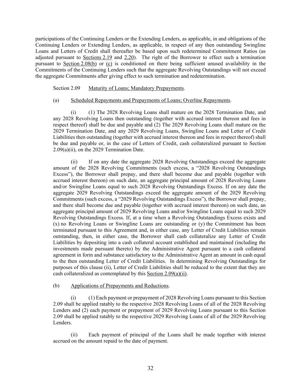 32 participations of the Continuing Lenders or the Extending Lenders, as applicable, in and obligations of the Continuing Lenders or Extending Lenders, as applicable, in respect of any then outstanding Swingline Loans and Letters of Credit shall thereafter be based upon such redetermined Commitment Ratios (as adjusted pursuant to Sections 2.19 and 2.20). The right of the Borrower to effect such a termination pursuant to Section 2.08(b) or (c) is conditioned on there being sufficient unused availability in the Commitments of the Continuing Lenders such that the aggregate Revolving Outstandings will not exceed the aggregate Commitments after giving effect to such termination and redetermination. Section 2.09 Maturity of Loans; Mandatory Prepayments. (a) Scheduled Repayments and Prepayments of Loans; Overline Repayments. (i) (1) The 2028 Revolving Loans shall mature on the 2028 Termination Date, and any 2028 Revolving Loans then outstanding (together with accrued interest thereon and fees in respect thereof) shall be due and payable and (2) The 2029 Revolving Loans shall mature on the 2029 Termination Date, and any 2029 Revolving Loans, Swingline Loans and Letter of Credit Liabilities then outstanding (together with accrued interest thereon and fees in respect thereof) shall be due and payable or, in the case of Letters of Credit, cash collateralized pursuant to Section 2.09(a)(ii), on the 2029 Termination Date. (ii) If on any date the aggregate 2028 Revolving Outstandings exceed the aggregate amount of the 2028 Revolving Commitments (such excess, a “2028 Revolving Outstandings Excess”), the Borrower shall prepay, and there shall become due and payable (together with accrued interest thereon) on such date, an aggregate principal amount of 2028 Revolving Loans and/or Swingline Loans equal to such 2028 Revolving Outstandings Excess. If on any date the aggregate 2029 Revolving Outstandings exceed the aggregate amount of the 2029 Revolving Commitments (such excess, a “2029 Revolving Outstandings Excess”), the Borrower shall prepay, and there shall become due and payable (together with accrued interest thereon) on such date, an aggregate principal amount of 2029 Revolving Loans and/or Swingline Loans equal to such 2029 Revolving Outstandings Excess. If, at a time when a Revolving Outstandings Excess exists and (x) no Revolving Loans or Swingline Loans are outstanding or (y) the Commitment has been terminated pursuant to this Agreement and, in either case, any Letter of Credit Liabilities remain outstanding, then, in either case, the Borrower shall cash collateralize any Letter of Credit Liabilities by depositing into a cash collateral account established and maintained (including the investments made pursuant thereto) by the Administrative Agent pursuant to a cash collateral agreement in form and substance satisfactory to the Administrative Agent an amount in cash equal to the then outstanding Letter of Credit Liabilities. In determining Revolving Outstandings for purposes of this clause (ii), Letter of Credit Liabilities shall be reduced to the extent that they are cash collateralized as contemplated by this Section 2.09(a)(ii). (b) Applications of Prepayments and Reductions. (i) (1) Each payment or prepayment of 2028 Revolving Loans pursuant to this Section 2.09 shall be applied ratably to the respective 2028 Revolving Loans of all of the 2028 Revolving Lenders and (2) each payment or prepayment of 2029 Revolving Loans pursuant to this Section 2.09 shall be applied ratably to the respective 2029 Revolving Loans of all of the 2029 Revolving Lenders. (ii) Each payment of principal of the Loans shall be made together with interest accrued on the amount repaid to the date of payment.