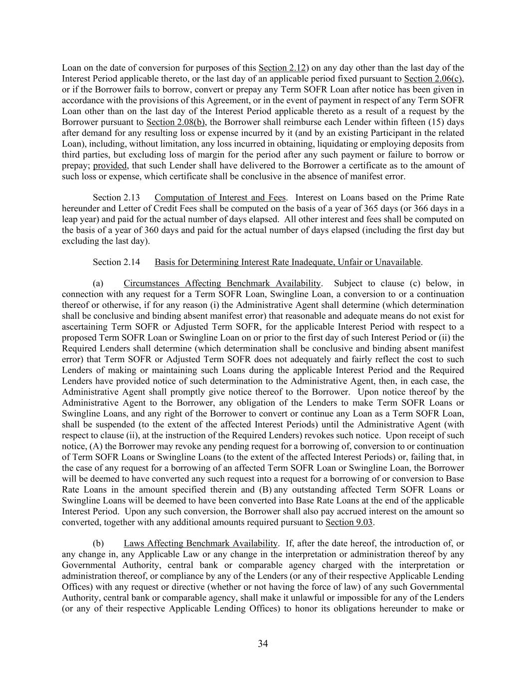 34 Loan on the date of conversion for purposes of this Section 2.12) on any day other than the last day of the Interest Period applicable thereto, or the last day of an applicable period fixed pursuant to Section 2.06(c), or if the Borrower fails to borrow, convert or prepay any Term SOFR Loan after notice has been given in accordance with the provisions of this Agreement, or in the event of payment in respect of any Term SOFR Loan other than on the last day of the Interest Period applicable thereto as a result of a request by the Borrower pursuant to Section 2.08(b), the Borrower shall reimburse each Lender within fifteen (15) days after demand for any resulting loss or expense incurred by it (and by an existing Participant in the related Loan), including, without limitation, any loss incurred in obtaining, liquidating or employing deposits from third parties, but excluding loss of margin for the period after any such payment or failure to borrow or prepay; provided, that such Lender shall have delivered to the Borrower a certificate as to the amount of such loss or expense, which certificate shall be conclusive in the absence of manifest error. Section 2.13 Computation of Interest and Fees. Interest on Loans based on the Prime Rate hereunder and Letter of Credit Fees shall be computed on the basis of a year of 365 days (or 366 days in a leap year) and paid for the actual number of days elapsed. All other interest and fees shall be computed on the basis of a year of 360 days and paid for the actual number of days elapsed (including the first day but excluding the last day). Section 2.14 Basis for Determining Interest Rate Inadequate, Unfair or Unavailable. (a) Circumstances Affecting Benchmark Availability. Subject to clause (c) below, in connection with any request for a Term SOFR Loan, Swingline Loan, a conversion to or a continuation thereof or otherwise, if for any reason (i) the Administrative Agent shall determine (which determination shall be conclusive and binding absent manifest error) that reasonable and adequate means do not exist for ascertaining Term SOFR or Adjusted Term SOFR, for the applicable Interest Period with respect to a proposed Term SOFR Loan or Swingline Loan on or prior to the first day of such Interest Period or (ii) the Required Lenders shall determine (which determination shall be conclusive and binding absent manifest error) that Term SOFR or Adjusted Term SOFR does not adequately and fairly reflect the cost to such Lenders of making or maintaining such Loans during the applicable Interest Period and the Required Lenders have provided notice of such determination to the Administrative Agent, then, in each case, the Administrative Agent shall promptly give notice thereof to the Borrower. Upon notice thereof by the Administrative Agent to the Borrower, any obligation of the Lenders to make Term SOFR Loans or Swingline Loans, and any right of the Borrower to convert or continue any Loan as a Term SOFR Loan, shall be suspended (to the extent of the affected Interest Periods) until the Administrative Agent (with respect to clause (ii), at the instruction of the Required Lenders) revokes such notice. Upon receipt of such notice, (A) the Borrower may revoke any pending request for a borrowing of, conversion to or continuation of Term SOFR Loans or Swingline Loans (to the extent of the affected Interest Periods) or, failing that, in the case of any request for a borrowing of an affected Term SOFR Loan or Swingline Loan, the Borrower will be deemed to have converted any such request into a request for a borrowing of or conversion to Base Rate Loans in the amount specified therein and (B) any outstanding affected Term SOFR Loans or Swingline Loans will be deemed to have been converted into Base Rate Loans at the end of the applicable Interest Period. Upon any such conversion, the Borrower shall also pay accrued interest on the amount so converted, together with any additional amounts required pursuant to Section 9.03. (b) Laws Affecting Benchmark Availability. If, after the date hereof, the introduction of, or any change in, any Applicable Law or any change in the interpretation or administration thereof by any Governmental Authority, central bank or comparable agency charged with the interpretation or administration thereof, or compliance by any of the Lenders (or any of their respective Applicable Lending Offices) with any request or directive (whether or not having the force of law) of any such Governmental Authority, central bank or comparable agency, shall make it unlawful or impossible for any of the Lenders (or any of their respective Applicable Lending Offices) to honor its obligations hereunder to make or