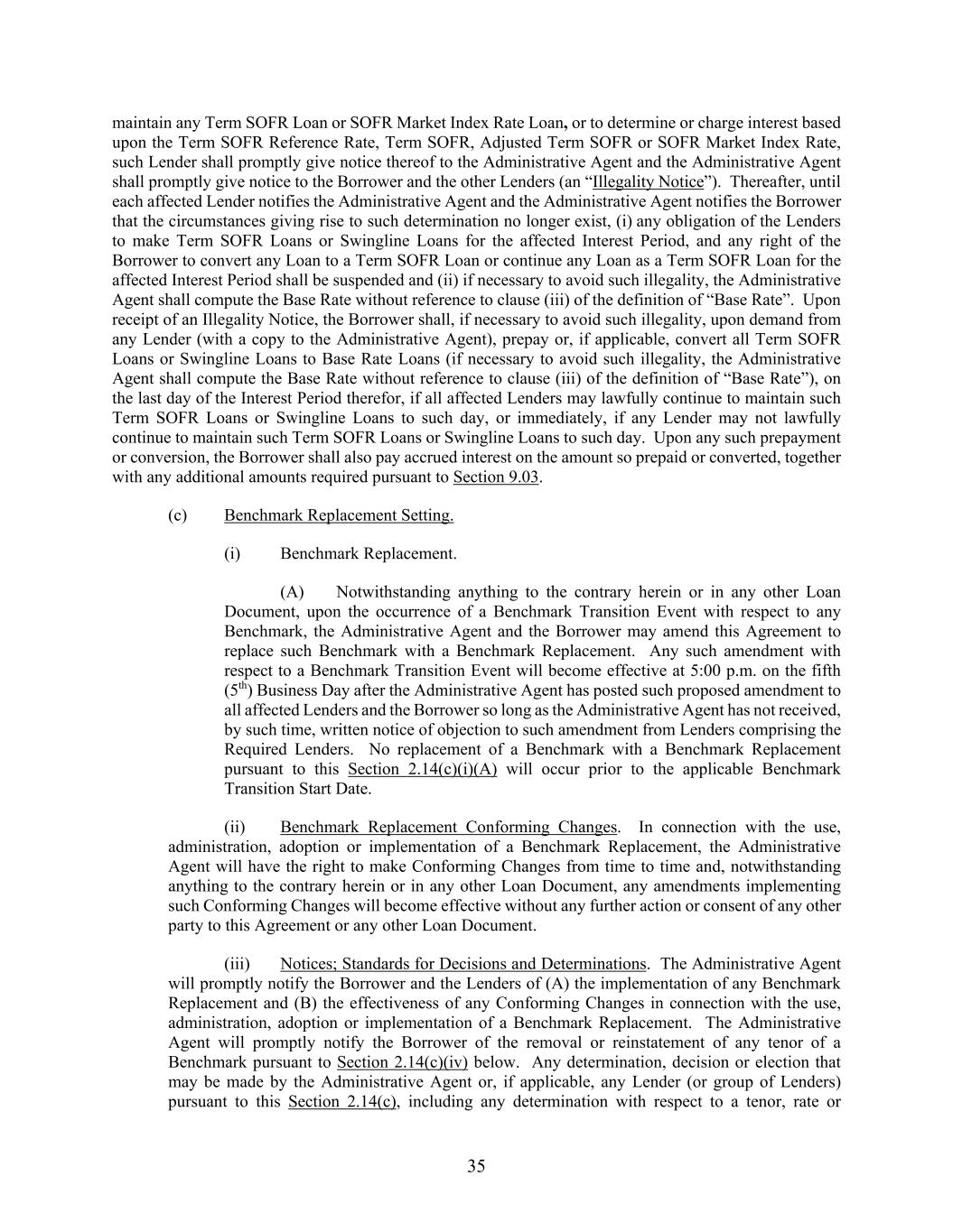 35 maintain any Term SOFR Loan or SOFR Market Index Rate Loan, or to determine or charge interest based upon the Term SOFR Reference Rate, Term SOFR, Adjusted Term SOFR or SOFR Market Index Rate, such Lender shall promptly give notice thereof to the Administrative Agent and the Administrative Agent shall promptly give notice to the Borrower and the other Lenders (an “Illegality Notice”). Thereafter, until each affected Lender notifies the Administrative Agent and the Administrative Agent notifies the Borrower that the circumstances giving rise to such determination no longer exist, (i) any obligation of the Lenders to make Term SOFR Loans or Swingline Loans for the affected Interest Period, and any right of the Borrower to convert any Loan to a Term SOFR Loan or continue any Loan as a Term SOFR Loan for the affected Interest Period shall be suspended and (ii) if necessary to avoid such illegality, the Administrative Agent shall compute the Base Rate without reference to clause (iii) of the definition of “Base Rate”. Upon receipt of an Illegality Notice, the Borrower shall, if necessary to avoid such illegality, upon demand from any Lender (with a copy to the Administrative Agent), prepay or, if applicable, convert all Term SOFR Loans or Swingline Loans to Base Rate Loans (if necessary to avoid such illegality, the Administrative Agent shall compute the Base Rate without reference to clause (iii) of the definition of “Base Rate”), on the last day of the Interest Period therefor, if all affected Lenders may lawfully continue to maintain such Term SOFR Loans or Swingline Loans to such day, or immediately, if any Lender may not lawfully continue to maintain such Term SOFR Loans or Swingline Loans to such day. Upon any such prepayment or conversion, the Borrower shall also pay accrued interest on the amount so prepaid or converted, together with any additional amounts required pursuant to Section 9.03. (c) Benchmark Replacement Setting. (i) Benchmark Replacement. (A) Notwithstanding anything to the contrary herein or in any other Loan Document, upon the occurrence of a Benchmark Transition Event with respect to any Benchmark, the Administrative Agent and the Borrower may amend this Agreement to replace such Benchmark with a Benchmark Replacement. Any such amendment with respect to a Benchmark Transition Event will become effective at 5:00 p.m. on the fifth (5th) Business Day after the Administrative Agent has posted such proposed amendment to all affected Lenders and the Borrower so long as the Administrative Agent has not received, by such time, written notice of objection to such amendment from Lenders comprising the Required Lenders. No replacement of a Benchmark with a Benchmark Replacement pursuant to this Section 2.14(c)(i)(A) will occur prior to the applicable Benchmark Transition Start Date. (ii) Benchmark Replacement Conforming Changes. In connection with the use, administration, adoption or implementation of a Benchmark Replacement, the Administrative Agent will have the right to make Conforming Changes from time to time and, notwithstanding anything to the contrary herein or in any other Loan Document, any amendments implementing such Conforming Changes will become effective without any further action or consent of any other party to this Agreement or any other Loan Document. (iii) Notices; Standards for Decisions and Determinations. The Administrative Agent will promptly notify the Borrower and the Lenders of (A) the implementation of any Benchmark Replacement and (B) the effectiveness of any Conforming Changes in connection with the use, administration, adoption or implementation of a Benchmark Replacement. The Administrative Agent will promptly notify the Borrower of the removal or reinstatement of any tenor of a Benchmark pursuant to Section 2.14(c)(iv) below. Any determination, decision or election that may be made by the Administrative Agent or, if applicable, any Lender (or group of Lenders) pursuant to this Section 2.14(c), including any determination with respect to a tenor, rate or