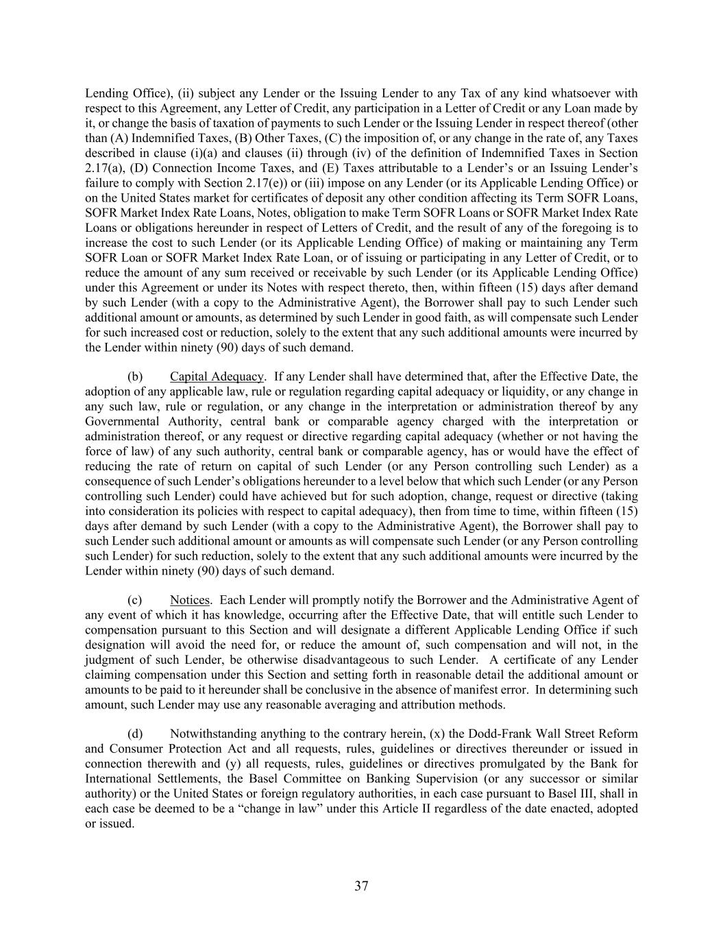 37 Lending Office), (ii) subject any Lender or the Issuing Lender to any Tax of any kind whatsoever with respect to this Agreement, any Letter of Credit, any participation in a Letter of Credit or any Loan made by it, or change the basis of taxation of payments to such Lender or the Issuing Lender in respect thereof (other than (A) Indemnified Taxes, (B) Other Taxes, (C) the imposition of, or any change in the rate of, any Taxes described in clause (i)(a) and clauses (ii) through (iv) of the definition of Indemnified Taxes in Section 2.17(a), (D) Connection Income Taxes, and (E) Taxes attributable to a Lender’s or an Issuing Lender’s failure to comply with Section 2.17(e)) or (iii) impose on any Lender (or its Applicable Lending Office) or on the United States market for certificates of deposit any other condition affecting its Term SOFR Loans, SOFR Market Index Rate Loans, Notes, obligation to make Term SOFR Loans or SOFR Market Index Rate Loans or obligations hereunder in respect of Letters of Credit, and the result of any of the foregoing is to increase the cost to such Lender (or its Applicable Lending Office) of making or maintaining any Term SOFR Loan or SOFR Market Index Rate Loan, or of issuing or participating in any Letter of Credit, or to reduce the amount of any sum received or receivable by such Lender (or its Applicable Lending Office) under this Agreement or under its Notes with respect thereto, then, within fifteen (15) days after demand by such Lender (with a copy to the Administrative Agent), the Borrower shall pay to such Lender such additional amount or amounts, as determined by such Lender in good faith, as will compensate such Lender for such increased cost or reduction, solely to the extent that any such additional amounts were incurred by the Lender within ninety (90) days of such demand. (b) Capital Adequacy. If any Lender shall have determined that, after the Effective Date, the adoption of any applicable law, rule or regulation regarding capital adequacy or liquidity, or any change in any such law, rule or regulation, or any change in the interpretation or administration thereof by any Governmental Authority, central bank or comparable agency charged with the interpretation or administration thereof, or any request or directive regarding capital adequacy (whether or not having the force of law) of any such authority, central bank or comparable agency, has or would have the effect of reducing the rate of return on capital of such Lender (or any Person controlling such Lender) as a consequence of such Lender’s obligations hereunder to a level below that which such Lender (or any Person controlling such Lender) could have achieved but for such adoption, change, request or directive (taking into consideration its policies with respect to capital adequacy), then from time to time, within fifteen (15) days after demand by such Lender (with a copy to the Administrative Agent), the Borrower shall pay to such Lender such additional amount or amounts as will compensate such Lender (or any Person controlling such Lender) for such reduction, solely to the extent that any such additional amounts were incurred by the Lender within ninety (90) days of such demand. (c) Notices. Each Lender will promptly notify the Borrower and the Administrative Agent of any event of which it has knowledge, occurring after the Effective Date, that will entitle such Lender to compensation pursuant to this Section and will designate a different Applicable Lending Office if such designation will avoid the need for, or reduce the amount of, such compensation and will not, in the judgment of such Lender, be otherwise disadvantageous to such Lender. A certificate of any Lender claiming compensation under this Section and setting forth in reasonable detail the additional amount or amounts to be paid to it hereunder shall be conclusive in the absence of manifest error. In determining such amount, such Lender may use any reasonable averaging and attribution methods. (d) Notwithstanding anything to the contrary herein, (x) the Dodd-Frank Wall Street Reform and Consumer Protection Act and all requests, rules, guidelines or directives thereunder or issued in connection therewith and (y) all requests, rules, guidelines or directives promulgated by the Bank for International Settlements, the Basel Committee on Banking Supervision (or any successor or similar authority) or the United States or foreign regulatory authorities, in each case pursuant to Basel III, shall in each case be deemed to be a “change in law” under this Article II regardless of the date enacted, adopted or issued.