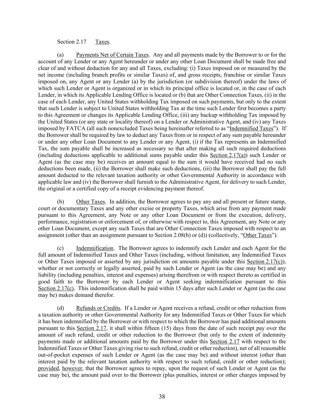 38 Section 2.17 Taxes. (a) Payments Net of Certain Taxes. Any and all payments made by the Borrower to or for the account of any Lender or any Agent hereunder or under any other Loan Document shall be made free and clear of and without deduction for any and all Taxes, excluding: (i) Taxes imposed on or measured by the net income (including branch profits or similar Taxes) of, and gross receipts, franchise or similar Taxes imposed on, any Agent or any Lender (a) by the jurisdiction (or subdivision thereof) under the laws of which such Lender or Agent is organized or in which its principal office is located or, in the case of each Lender, in which its Applicable Lending Office is located or (b) that are Other Connection Taxes, (ii) in the case of each Lender, any United States withholding Tax imposed on such payments, but only to the extent that such Lender is subject to United States withholding Tax at the time such Lender first becomes a party to this Agreement or changes its Applicable Lending Office, (iii) any backup withholding Tax imposed by the United States (or any state or locality thereof) on a Lender or Administrative Agent, and (iv) any Taxes imposed by FATCA (all such nonexcluded Taxes being hereinafter referred to as “Indemnified Taxes”). If the Borrower shall be required by law to deduct any Taxes from or in respect of any sum payable hereunder or under any other Loan Document to any Lender or any Agent, (i) if the Tax represents an Indemnified Tax, the sum payable shall be increased as necessary so that after making all such required deductions (including deductions applicable to additional sums payable under this Section 2.17(a)) such Lender or Agent (as the case may be) receives an amount equal to the sum it would have received had no such deductions been made, (ii) the Borrower shall make such deductions, (iii) the Borrower shall pay the full amount deducted to the relevant taxation authority or other Governmental Authority in accordance with applicable law and (iv) the Borrower shall furnish to the Administrative Agent, for delivery to such Lender, the original or a certified copy of a receipt evidencing payment thereof. (b) Other Taxes. In addition, the Borrower agrees to pay any and all present or future stamp, court or documentary Taxes and any other excise or property Taxes, which arise from any payment made pursuant to this Agreement, any Note or any other Loan Document or from the execution, delivery, performance, registration or enforcement of, or otherwise with respect to, this Agreement, any Note or any other Loan Document, except any such Taxes that are Other Connection Taxes imposed with respect to an assignment (other than an assignment pursuant to Section 2.08(b) or (d)) (collectively, “Other Taxes”). (c) Indemnification. The Borrower agrees to indemnify each Lender and each Agent for the full amount of Indemnified Taxes and Other Taxes (including, without limitation, any Indemnified Taxes or Other Taxes imposed or asserted by any jurisdiction on amounts payable under this Section 2.17(c)), whether or not correctly or legally asserted, paid by such Lender or Agent (as the case may be) and any liability (including penalties, interest and expenses) arising therefrom or with respect thereto as certified in good faith to the Borrower by each Lender or Agent seeking indemnification pursuant to this Section 2.17(c). This indemnification shall be paid within 15 days after such Lender or Agent (as the case may be) makes demand therefor. (d) Refunds or Credits. If a Lender or Agent receives a refund, credit or other reduction from a taxation authority or other Governmental Authority for any Indemnified Taxes or Other Taxes for which it has been indemnified by the Borrower or with respect to which the Borrower has paid additional amounts pursuant to this Section 2.17, it shall within fifteen (15) days from the date of such receipt pay over the amount of such refund, credit or other reduction to the Borrower (but only to the extent of indemnity payments made or additional amounts paid by the Borrower under this Section 2.17 with respect to the Indemnified Taxes or Other Taxes giving rise to such refund, credit or other reduction), net of all reasonable out-of-pocket expenses of such Lender or Agent (as the case may be) and without interest (other than interest paid by the relevant taxation authority with respect to such refund, credit or other reduction); provided, however, that the Borrower agrees to repay, upon the request of such Lender or Agent (as the case may be), the amount paid over to the Borrower (plus penalties, interest or other charges imposed by