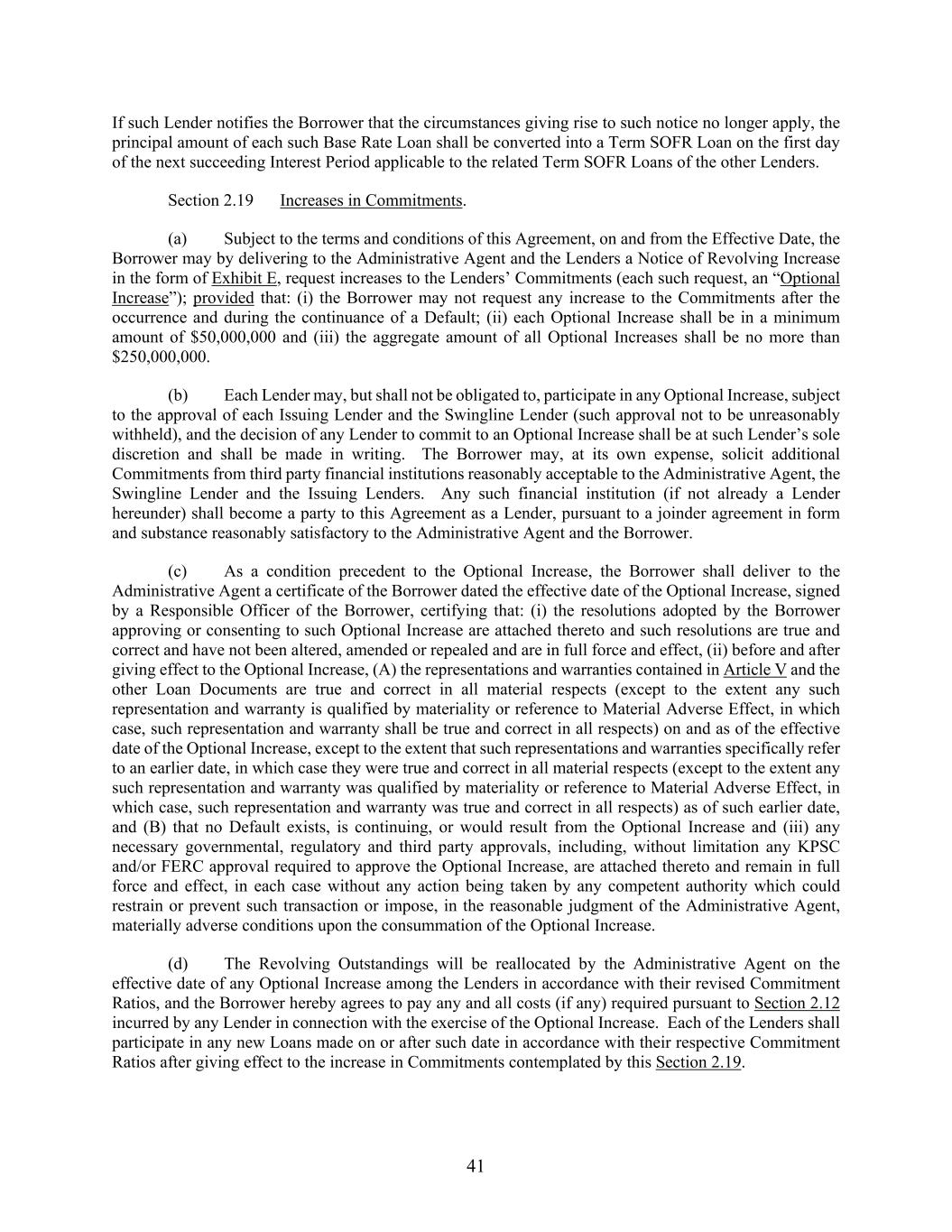 41 If such Lender notifies the Borrower that the circumstances giving rise to such notice no longer apply, the principal amount of each such Base Rate Loan shall be converted into a Term SOFR Loan on the first day of the next succeeding Interest Period applicable to the related Term SOFR Loans of the other Lenders. Section 2.19 Increases in Commitments. (a) Subject to the terms and conditions of this Agreement, on and from the Effective Date, the Borrower may by delivering to the Administrative Agent and the Lenders a Notice of Revolving Increase in the form of Exhibit E, request increases to the Lenders’ Commitments (each such request, an “Optional Increase”); provided that: (i) the Borrower may not request any increase to the Commitments after the occurrence and during the continuance of a Default; (ii) each Optional Increase shall be in a minimum amount of $50,000,000 and (iii) the aggregate amount of all Optional Increases shall be no more than $250,000,000. (b) Each Lender may, but shall not be obligated to, participate in any Optional Increase, subject to the approval of each Issuing Lender and the Swingline Lender (such approval not to be unreasonably withheld), and the decision of any Lender to commit to an Optional Increase shall be at such Lender’s sole discretion and shall be made in writing. The Borrower may, at its own expense, solicit additional Commitments from third party financial institutions reasonably acceptable to the Administrative Agent, the Swingline Lender and the Issuing Lenders. Any such financial institution (if not already a Lender hereunder) shall become a party to this Agreement as a Lender, pursuant to a joinder agreement in form and substance reasonably satisfactory to the Administrative Agent and the Borrower. (c) As a condition precedent to the Optional Increase, the Borrower shall deliver to the Administrative Agent a certificate of the Borrower dated the effective date of the Optional Increase, signed by a Responsible Officer of the Borrower, certifying that: (i) the resolutions adopted by the Borrower approving or consenting to such Optional Increase are attached thereto and such resolutions are true and correct and have not been altered, amended or repealed and are in full force and effect, (ii) before and after giving effect to the Optional Increase, (A) the representations and warranties contained in Article V and the other Loan Documents are true and correct in all material respects (except to the extent any such representation and warranty is qualified by materiality or reference to Material Adverse Effect, in which case, such representation and warranty shall be true and correct in all respects) on and as of the effective date of the Optional Increase, except to the extent that such representations and warranties specifically refer to an earlier date, in which case they were true and correct in all material respects (except to the extent any such representation and warranty was qualified by materiality or reference to Material Adverse Effect, in which case, such representation and warranty was true and correct in all respects) as of such earlier date, and (B) that no Default exists, is continuing, or would result from the Optional Increase and (iii) any necessary governmental, regulatory and third party approvals, including, without limitation any KPSC and/or FERC approval required to approve the Optional Increase, are attached thereto and remain in full force and effect, in each case without any action being taken by any competent authority which could restrain or prevent such transaction or impose, in the reasonable judgment of the Administrative Agent, materially adverse conditions upon the consummation of the Optional Increase. (d) The Revolving Outstandings will be reallocated by the Administrative Agent on the effective date of any Optional Increase among the Lenders in accordance with their revised Commitment Ratios, and the Borrower hereby agrees to pay any and all costs (if any) required pursuant to Section 2.12 incurred by any Lender in connection with the exercise of the Optional Increase. Each of the Lenders shall participate in any new Loans made on or after such date in accordance with their respective Commitment Ratios after giving effect to the increase in Commitments contemplated by this Section 2.19.