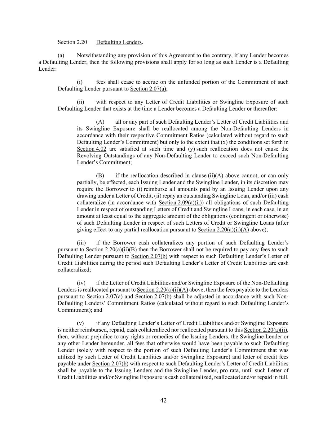 42 Section 2.20 Defaulting Lenders. (a) Notwithstanding any provision of this Agreement to the contrary, if any Lender becomes a Defaulting Lender, then the following provisions shall apply for so long as such Lender is a Defaulting Lender: (i) fees shall cease to accrue on the unfunded portion of the Commitment of such Defaulting Lender pursuant to Section 2.07(a); (ii) with respect to any Letter of Credit Liabilities or Swingline Exposure of such Defaulting Lender that exists at the time a Lender becomes a Defaulting Lender or thereafter: (A) all or any part of such Defaulting Lender’s Letter of Credit Liabilities and its Swingline Exposure shall be reallocated among the Non-Defaulting Lenders in accordance with their respective Commitment Ratios (calculated without regard to such Defaulting Lender’s Commitment) but only to the extent that (x) the conditions set forth in Section 4.02 are satisfied at such time and (y) such reallocation does not cause the Revolving Outstandings of any Non-Defaulting Lender to exceed such Non-Defaulting Lender’s Commitment; (B) if the reallocation described in clause (ii)(A) above cannot, or can only partially, be effected, each Issuing Lender and the Swingline Lender, in its discretion may require the Borrower to (i) reimburse all amounts paid by an Issuing Lender upon any drawing under a Letter of Credit, (ii) repay an outstanding Swingline Loan, and/or (iii) cash collateralize (in accordance with Section 2.09(a)(ii)) all obligations of such Defaulting Lender in respect of outstanding Letters of Credit and Swingline Loans, in each case, in an amount at least equal to the aggregate amount of the obligations (contingent or otherwise) of such Defaulting Lender in respect of such Letters of Credit or Swingline Loans (after giving effect to any partial reallocation pursuant to Section 2.20(a)(ii)(A) above); (iii) if the Borrower cash collateralizes any portion of such Defaulting Lender’s pursuant to Section 2.20(a)(ii)(B) then the Borrower shall not be required to pay any fees to such Defaulting Lender pursuant to Section 2.07(b) with respect to such Defaulting Lender’s Letter of Credit Liabilities during the period such Defaulting Lender’s Letter of Credit Liabilities are cash collateralized; (iv) if the Letter of Credit Liabilities and/or Swingline Exposure of the Non-Defaulting Lenders is reallocated pursuant to Section 2.20(a)(ii)(A) above, then the fees payable to the Lenders pursuant to Section 2.07(a) and Section 2.07(b) shall be adjusted in accordance with such Non- Defaulting Lenders’ Commitment Ratios (calculated without regard to such Defaulting Lender’s Commitment); and (v) if any Defaulting Lender’s Letter of Credit Liabilities and/or Swingline Exposure is neither reimbursed, repaid, cash collateralized nor reallocated pursuant to this Section 2.20(a)(ii), then, without prejudice to any rights or remedies of the Issuing Lenders, the Swingline Lender or any other Lender hereunder, all fees that otherwise would have been payable to such Defaulting Lender (solely with respect to the portion of such Defaulting Lender’s Commitment that was utilized by such Letter of Credit Liabilities and/or Swingline Exposure) and letter of credit fees payable under Section 2.07(b) with respect to such Defaulting Lender’s Letter of Credit Liabilities shall be payable to the Issuing Lenders and the Swingline Lender, pro rata, until such Letter of Credit Liabilities and/or Swingline Exposure is cash collateralized, reallocated and/or repaid in full.