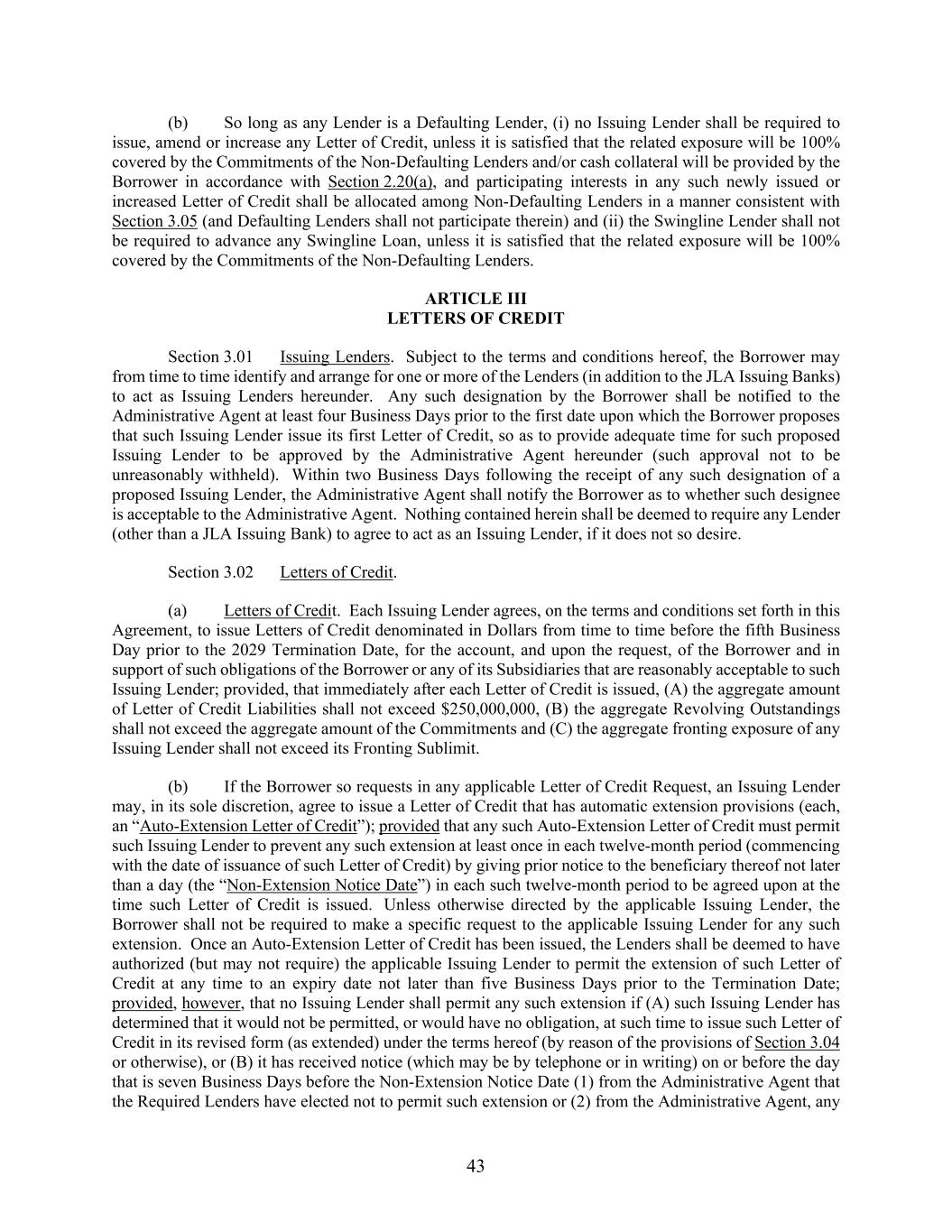 43 (b) So long as any Lender is a Defaulting Lender, (i) no Issuing Lender shall be required to issue, amend or increase any Letter of Credit, unless it is satisfied that the related exposure will be 100% covered by the Commitments of the Non-Defaulting Lenders and/or cash collateral will be provided by the Borrower in accordance with Section 2.20(a), and participating interests in any such newly issued or increased Letter of Credit shall be allocated among Non-Defaulting Lenders in a manner consistent with Section 3.05 (and Defaulting Lenders shall not participate therein) and (ii) the Swingline Lender shall not be required to advance any Swingline Loan, unless it is satisfied that the related exposure will be 100% covered by the Commitments of the Non-Defaulting Lenders. ARTICLE III LETTERS OF CREDIT Section 3.01 Issuing Lenders. Subject to the terms and conditions hereof, the Borrower may from time to time identify and arrange for one or more of the Lenders (in addition to the JLA Issuing Banks) to act as Issuing Lenders hereunder. Any such designation by the Borrower shall be notified to the Administrative Agent at least four Business Days prior to the first date upon which the Borrower proposes that such Issuing Lender issue its first Letter of Credit, so as to provide adequate time for such proposed Issuing Lender to be approved by the Administrative Agent hereunder (such approval not to be unreasonably withheld). Within two Business Days following the receipt of any such designation of a proposed Issuing Lender, the Administrative Agent shall notify the Borrower as to whether such designee is acceptable to the Administrative Agent. Nothing contained herein shall be deemed to require any Lender (other than a JLA Issuing Bank) to agree to act as an Issuing Lender, if it does not so desire. Section 3.02 Letters of Credit. (a) Letters of Credit. Each Issuing Lender agrees, on the terms and conditions set forth in this Agreement, to issue Letters of Credit denominated in Dollars from time to time before the fifth Business Day prior to the 2029 Termination Date, for the account, and upon the request, of the Borrower and in support of such obligations of the Borrower or any of its Subsidiaries that are reasonably acceptable to such Issuing Lender; provided, that immediately after each Letter of Credit is issued, (A) the aggregate amount of Letter of Credit Liabilities shall not exceed $250,000,000, (B) the aggregate Revolving Outstandings shall not exceed the aggregate amount of the Commitments and (C) the aggregate fronting exposure of any Issuing Lender shall not exceed its Fronting Sublimit. (b) If the Borrower so requests in any applicable Letter of Credit Request, an Issuing Lender may, in its sole discretion, agree to issue a Letter of Credit that has automatic extension provisions (each, an “Auto-Extension Letter of Credit”); provided that any such Auto-Extension Letter of Credit must permit such Issuing Lender to prevent any such extension at least once in each twelve-month period (commencing with the date of issuance of such Letter of Credit) by giving prior notice to the beneficiary thereof not later than a day (the “Non-Extension Notice Date”) in each such twelve-month period to be agreed upon at the time such Letter of Credit is issued. Unless otherwise directed by the applicable Issuing Lender, the Borrower shall not be required to make a specific request to the applicable Issuing Lender for any such extension. Once an Auto-Extension Letter of Credit has been issued, the Lenders shall be deemed to have authorized (but may not require) the applicable Issuing Lender to permit the extension of such Letter of Credit at any time to an expiry date not later than five Business Days prior to the Termination Date; provided, however, that no Issuing Lender shall permit any such extension if (A) such Issuing Lender has determined that it would not be permitted, or would have no obligation, at such time to issue such Letter of Credit in its revised form (as extended) under the terms hereof (by reason of the provisions of Section 3.04 or otherwise), or (B) it has received notice (which may be by telephone or in writing) on or before the day that is seven Business Days before the Non-Extension Notice Date (1) from the Administrative Agent that the Required Lenders have elected not to permit such extension or (2) from the Administrative Agent, any