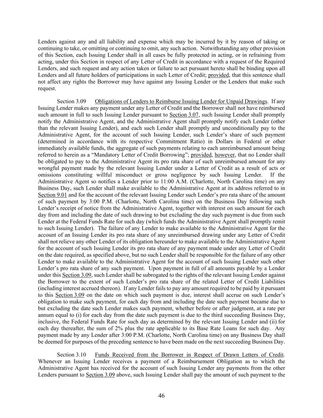 46 Lenders against any and all liability and expense which may be incurred by it by reason of taking or continuing to take, or omitting or continuing to omit, any such action. Notwithstanding any other provision of this Section, each Issuing Lender shall in all cases be fully protected in acting, or in refraining from acting, under this Section in respect of any Letter of Credit in accordance with a request of the Required Lenders, and such request and any action taken or failure to act pursuant hereto shall be binding upon all Lenders and all future holders of participations in such Letter of Credit; provided, that this sentence shall not affect any rights the Borrower may have against any Issuing Lender or the Lenders that make such request. Section 3.09 Obligations of Lenders to Reimburse Issuing Lender for Unpaid Drawings. If any Issuing Lender makes any payment under any Letter of Credit and the Borrower shall not have reimbursed such amount in full to such Issuing Lender pursuant to Section 3.07, such Issuing Lender shall promptly notify the Administrative Agent, and the Administrative Agent shall promptly notify each Lender (other than the relevant Issuing Lender), and each such Lender shall promptly and unconditionally pay to the Administrative Agent, for the account of such Issuing Lender, such Lender’s share of such payment (determined in accordance with its respective Commitment Ratio) in Dollars in Federal or other immediately available funds, the aggregate of such payments relating to each unreimbursed amount being referred to herein as a “Mandatory Letter of Credit Borrowing”; provided, however, that no Lender shall be obligated to pay to the Administrative Agent its pro rata share of such unreimbursed amount for any wrongful payment made by the relevant Issuing Lender under a Letter of Credit as a result of acts or omissions constituting willful misconduct or gross negligence by such Issuing Lender. If the Administrative Agent so notifies a Lender prior to 11:00 A.M. (Charlotte, North Carolina time) on any Business Day, such Lender shall make available to the Administrative Agent at its address referred to in Section 9.01 and for the account of the relevant Issuing Lender such Lender’s pro rata share of the amount of such payment by 3:00 P.M. (Charlotte, North Carolina time) on the Business Day following such Lender’s receipt of notice from the Administrative Agent, together with interest on such amount for each day from and including the date of such drawing to but excluding the day such payment is due from such Lender at the Federal Funds Rate for such day (which funds the Administrative Agent shall promptly remit to such Issuing Lender). The failure of any Lender to make available to the Administrative Agent for the account of an Issuing Lender its pro rata share of any unreimbursed drawing under any Letter of Credit shall not relieve any other Lender of its obligation hereunder to make available to the Administrative Agent for the account of such Issuing Lender its pro rata share of any payment made under any Letter of Credit on the date required, as specified above, but no such Lender shall be responsible for the failure of any other Lender to make available to the Administrative Agent for the account of such Issuing Lender such other Lender’s pro rata share of any such payment. Upon payment in full of all amounts payable by a Lender under this Section 3.09, such Lender shall be subrogated to the rights of the relevant Issuing Lender against the Borrower to the extent of such Lender’s pro rata share of the related Letter of Credit Liabilities (including interest accrued thereon). If any Lender fails to pay any amount required to be paid by it pursuant to this Section 3.09 on the date on which such payment is due, interest shall accrue on such Lender’s obligation to make such payment, for each day from and including the date such payment became due to but excluding the date such Lender makes such payment, whether before or after judgment, at a rate per annum equal to (i) for each day from the date such payment is due to the third succeeding Business Day, inclusive, the Federal Funds Rate for such day as determined by the relevant Issuing Lender and (ii) for each day thereafter, the sum of 2% plus the rate applicable to its Base Rate Loans for such day. Any payment made by any Lender after 3:00 P.M. (Charlotte, North Carolina time) on any Business Day shall be deemed for purposes of the preceding sentence to have been made on the next succeeding Business Day. Section 3.10 Funds Received from the Borrower in Respect of Drawn Letters of Credit. Whenever an Issuing Lender receives a payment of a Reimbursement Obligation as to which the Administrative Agent has received for the account of such Issuing Lender any payments from the other Lenders pursuant to Section 3.09 above, such Issuing Lender shall pay the amount of such payment to the