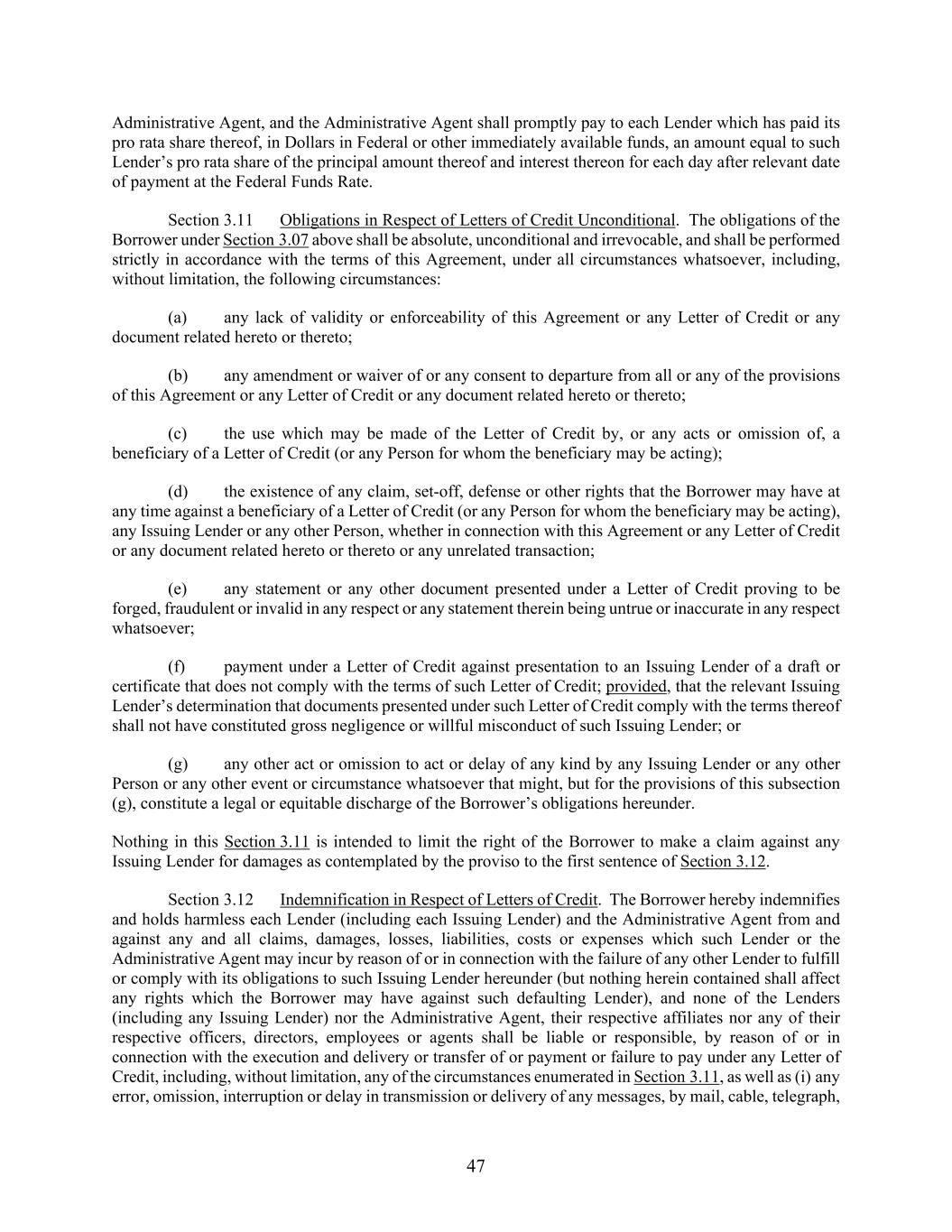 47 Administrative Agent, and the Administrative Agent shall promptly pay to each Lender which has paid its pro rata share thereof, in Dollars in Federal or other immediately available funds, an amount equal to such Lender’s pro rata share of the principal amount thereof and interest thereon for each day after relevant date of payment at the Federal Funds Rate. Section 3.11 Obligations in Respect of Letters of Credit Unconditional. The obligations of the Borrower under Section 3.07 above shall be absolute, unconditional and irrevocable, and shall be performed strictly in accordance with the terms of this Agreement, under all circumstances whatsoever, including, without limitation, the following circumstances: (a) any lack of validity or enforceability of this Agreement or any Letter of Credit or any document related hereto or thereto; (b) any amendment or waiver of or any consent to departure from all or any of the provisions of this Agreement or any Letter of Credit or any document related hereto or thereto; (c) the use which may be made of the Letter of Credit by, or any acts or omission of, a beneficiary of a Letter of Credit (or any Person for whom the beneficiary may be acting); (d) the existence of any claim, set-off, defense or other rights that the Borrower may have at any time against a beneficiary of a Letter of Credit (or any Person for whom the beneficiary may be acting), any Issuing Lender or any other Person, whether in connection with this Agreement or any Letter of Credit or any document related hereto or thereto or any unrelated transaction; (e) any statement or any other document presented under a Letter of Credit proving to be forged, fraudulent or invalid in any respect or any statement therein being untrue or inaccurate in any respect whatsoever; (f) payment under a Letter of Credit against presentation to an Issuing Lender of a draft or certificate that does not comply with the terms of such Letter of Credit; provided, that the relevant Issuing Lender’s determination that documents presented under such Letter of Credit comply with the terms thereof shall not have constituted gross negligence or willful misconduct of such Issuing Lender; or (g) any other act or omission to act or delay of any kind by any Issuing Lender or any other Person or any other event or circumstance whatsoever that might, but for the provisions of this subsection (g), constitute a legal or equitable discharge of the Borrower’s obligations hereunder. Nothing in this Section 3.11 is intended to limit the right of the Borrower to make a claim against any Issuing Lender for damages as contemplated by the proviso to the first sentence of Section 3.12. Section 3.12 Indemnification in Respect of Letters of Credit. The Borrower hereby indemnifies and holds harmless each Lender (including each Issuing Lender) and the Administrative Agent from and against any and all claims, damages, losses, liabilities, costs or expenses which such Lender or the Administrative Agent may incur by reason of or in connection with the failure of any other Lender to fulfill or comply with its obligations to such Issuing Lender hereunder (but nothing herein contained shall affect any rights which the Borrower may have against such defaulting Lender), and none of the Lenders (including any Issuing Lender) nor the Administrative Agent, their respective affiliates nor any of their respective officers, directors, employees or agents shall be liable or responsible, by reason of or in connection with the execution and delivery or transfer of or payment or failure to pay under any Letter of Credit, including, without limitation, any of the circumstances enumerated in Section 3.11, as well as (i) any error, omission, interruption or delay in transmission or delivery of any messages, by mail, cable, telegraph,