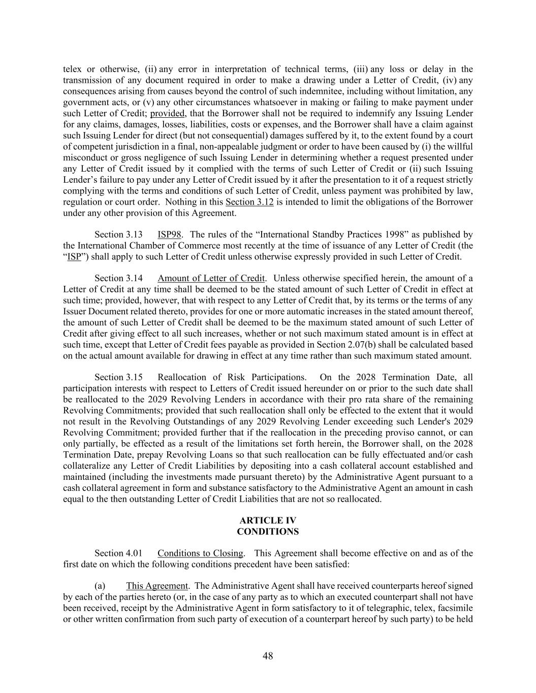 48 telex or otherwise, (ii) any error in interpretation of technical terms, (iii) any loss or delay in the transmission of any document required in order to make a drawing under a Letter of Credit, (iv) any consequences arising from causes beyond the control of such indemnitee, including without limitation, any government acts, or (v) any other circumstances whatsoever in making or failing to make payment under such Letter of Credit; provided, that the Borrower shall not be required to indemnify any Issuing Lender for any claims, damages, losses, liabilities, costs or expenses, and the Borrower shall have a claim against such Issuing Lender for direct (but not consequential) damages suffered by it, to the extent found by a court of competent jurisdiction in a final, non-appealable judgment or order to have been caused by (i) the willful misconduct or gross negligence of such Issuing Lender in determining whether a request presented under any Letter of Credit issued by it complied with the terms of such Letter of Credit or (ii) such Issuing Lender’s failure to pay under any Letter of Credit issued by it after the presentation to it of a request strictly complying with the terms and conditions of such Letter of Credit, unless payment was prohibited by law, regulation or court order. Nothing in this Section 3.12 is intended to limit the obligations of the Borrower under any other provision of this Agreement. Section 3.13 ISP98. The rules of the “International Standby Practices 1998” as published by the International Chamber of Commerce most recently at the time of issuance of any Letter of Credit (the “ISP”) shall apply to such Letter of Credit unless otherwise expressly provided in such Letter of Credit. Section 3.14 Amount of Letter of Credit. Unless otherwise specified herein, the amount of a Letter of Credit at any time shall be deemed to be the stated amount of such Letter of Credit in effect at such time; provided, however, that with respect to any Letter of Credit that, by its terms or the terms of any Issuer Document related thereto, provides for one or more automatic increases in the stated amount thereof, the amount of such Letter of Credit shall be deemed to be the maximum stated amount of such Letter of Credit after giving effect to all such increases, whether or not such maximum stated amount is in effect at such time, except that Letter of Credit fees payable as provided in Section 2.07(b) shall be calculated based on the actual amount available for drawing in effect at any time rather than such maximum stated amount. Section 3.15 Reallocation of Risk Participations. On the 2028 Termination Date, all participation interests with respect to Letters of Credit issued hereunder on or prior to the such date shall be reallocated to the 2029 Revolving Lenders in accordance with their pro rata share of the remaining Revolving Commitments; provided that such reallocation shall only be effected to the extent that it would not result in the Revolving Outstandings of any 2029 Revolving Lender exceeding such Lender's 2029 Revolving Commitment; provided further that if the reallocation in the preceding proviso cannot, or can only partially, be effected as a result of the limitations set forth herein, the Borrower shall, on the 2028 Termination Date, prepay Revolving Loans so that such reallocation can be fully effectuated and/or cash collateralize any Letter of Credit Liabilities by depositing into a cash collateral account established and maintained (including the investments made pursuant thereto) by the Administrative Agent pursuant to a cash collateral agreement in form and substance satisfactory to the Administrative Agent an amount in cash equal to the then outstanding Letter of Credit Liabilities that are not so reallocated. ARTICLE IV CONDITIONS Section 4.01 Conditions to Closing. This Agreement shall become effective on and as of the first date on which the following conditions precedent have been satisfied: (a) This Agreement. The Administrative Agent shall have received counterparts hereof signed by each of the parties hereto (or, in the case of any party as to which an executed counterpart shall not have been received, receipt by the Administrative Agent in form satisfactory to it of telegraphic, telex, facsimile or other written confirmation from such party of execution of a counterpart hereof by such party) to be held
