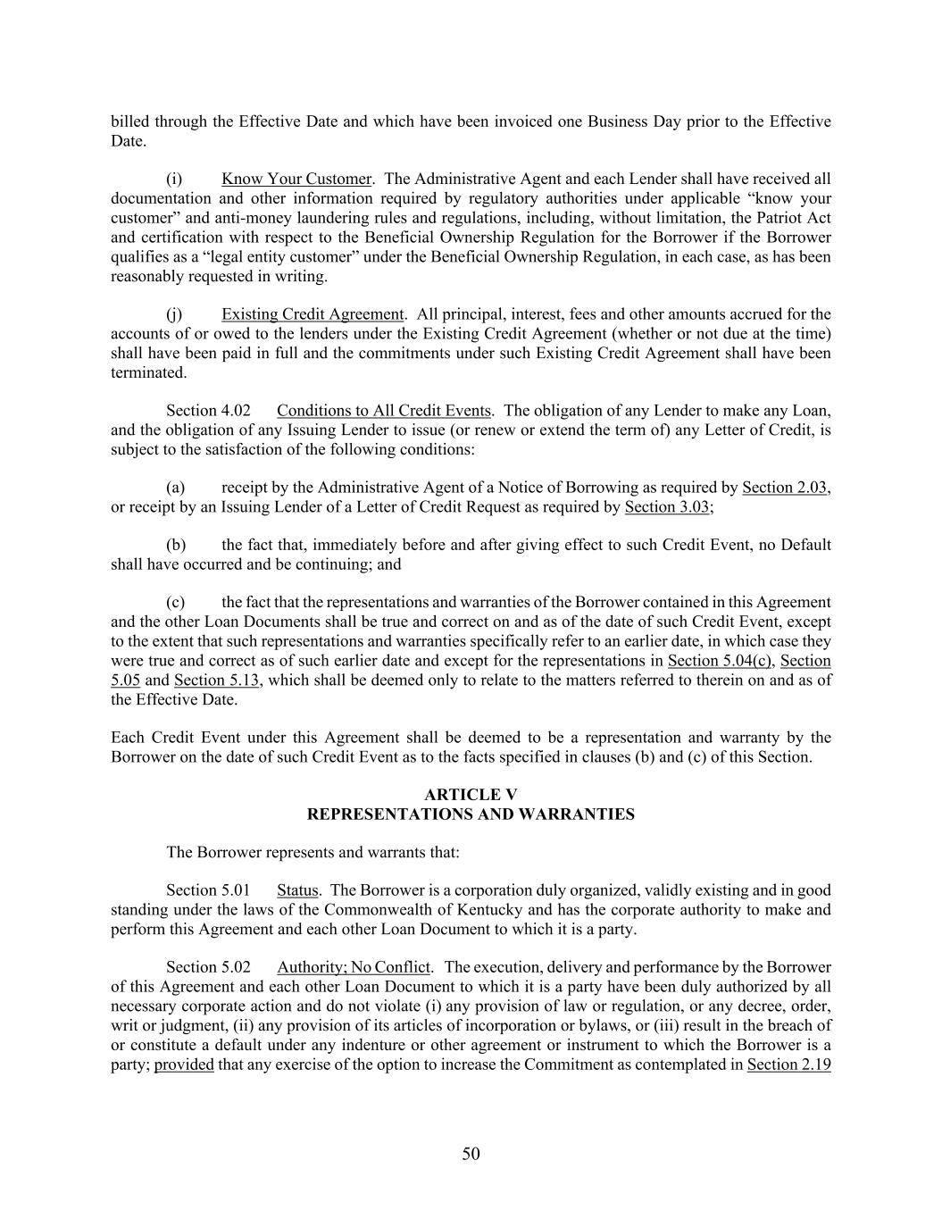 50 billed through the Effective Date and which have been invoiced one Business Day prior to the Effective Date. (i) Know Your Customer. The Administrative Agent and each Lender shall have received all documentation and other information required by regulatory authorities under applicable “know your customer” and anti-money laundering rules and regulations, including, without limitation, the Patriot Act and certification with respect to the Beneficial Ownership Regulation for the Borrower if the Borrower qualifies as a “legal entity customer” under the Beneficial Ownership Regulation, in each case, as has been reasonably requested in writing. (j) Existing Credit Agreement. All principal, interest, fees and other amounts accrued for the accounts of or owed to the lenders under the Existing Credit Agreement (whether or not due at the time) shall have been paid in full and the commitments under such Existing Credit Agreement shall have been terminated. Section 4.02 Conditions to All Credit Events. The obligation of any Lender to make any Loan, and the obligation of any Issuing Lender to issue (or renew or extend the term of) any Letter of Credit, is subject to the satisfaction of the following conditions: (a) receipt by the Administrative Agent of a Notice of Borrowing as required by Section 2.03, or receipt by an Issuing Lender of a Letter of Credit Request as required by Section 3.03; (b) the fact that, immediately before and after giving effect to such Credit Event, no Default shall have occurred and be continuing; and (c) the fact that the representations and warranties of the Borrower contained in this Agreement and the other Loan Documents shall be true and correct on and as of the date of such Credit Event, except to the extent that such representations and warranties specifically refer to an earlier date, in which case they were true and correct as of such earlier date and except for the representations in Section 5.04(c), Section 5.05 and Section 5.13, which shall be deemed only to relate to the matters referred to therein on and as of the Effective Date. Each Credit Event under this Agreement shall be deemed to be a representation and warranty by the Borrower on the date of such Credit Event as to the facts specified in clauses (b) and (c) of this Section. ARTICLE V REPRESENTATIONS AND WARRANTIES The Borrower represents and warrants that: Section 5.01 Status. The Borrower is a corporation duly organized, validly existing and in good standing under the laws of the Commonwealth of Kentucky and has the corporate authority to make and perform this Agreement and each other Loan Document to which it is a party. Section 5.02 Authority; No Conflict. The execution, delivery and performance by the Borrower of this Agreement and each other Loan Document to which it is a party have been duly authorized by all necessary corporate action and do not violate (i) any provision of law or regulation, or any decree, order, writ or judgment, (ii) any provision of its articles of incorporation or bylaws, or (iii) result in the breach of or constitute a default under any indenture or other agreement or instrument to which the Borrower is a party; provided that any exercise of the option to increase the Commitment as contemplated in Section 2.19