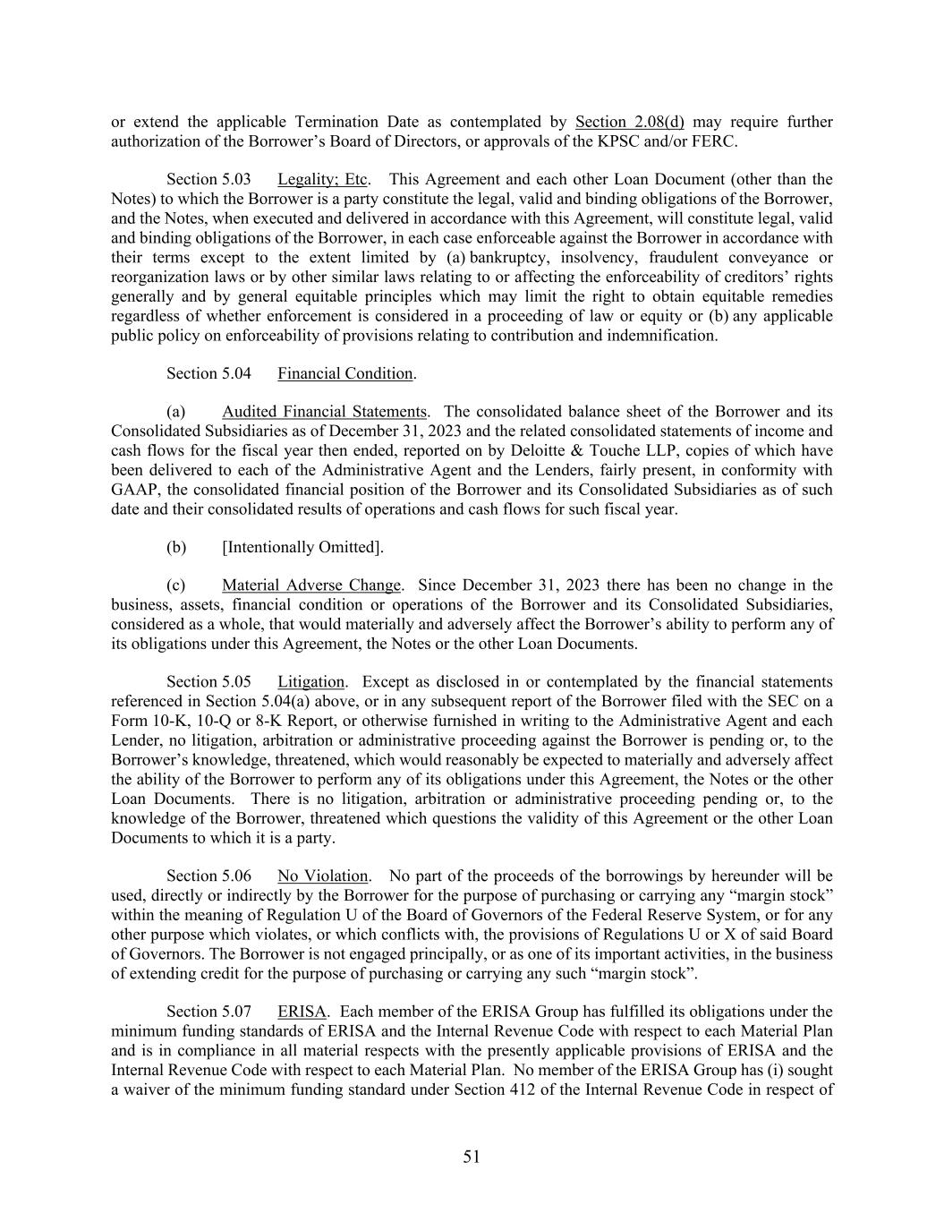 51 or extend the applicable Termination Date as contemplated by Section 2.08(d) may require further authorization of the Borrower’s Board of Directors, or approvals of the KPSC and/or FERC. Section 5.03 Legality; Etc. This Agreement and each other Loan Document (other than the Notes) to which the Borrower is a party constitute the legal, valid and binding obligations of the Borrower, and the Notes, when executed and delivered in accordance with this Agreement, will constitute legal, valid and binding obligations of the Borrower, in each case enforceable against the Borrower in accordance with their terms except to the extent limited by (a) bankruptcy, insolvency, fraudulent conveyance or reorganization laws or by other similar laws relating to or affecting the enforceability of creditors’ rights generally and by general equitable principles which may limit the right to obtain equitable remedies regardless of whether enforcement is considered in a proceeding of law or equity or (b) any applicable public policy on enforceability of provisions relating to contribution and indemnification. Section 5.04 Financial Condition. (a) Audited Financial Statements. The consolidated balance sheet of the Borrower and its Consolidated Subsidiaries as of December 31, 2023 and the related consolidated statements of income and cash flows for the fiscal year then ended, reported on by Deloitte & Touche LLP, copies of which have been delivered to each of the Administrative Agent and the Lenders, fairly present, in conformity with GAAP, the consolidated financial position of the Borrower and its Consolidated Subsidiaries as of such date and their consolidated results of operations and cash flows for such fiscal year. (b) [Intentionally Omitted]. (c) Material Adverse Change. Since December 31, 2023 there has been no change in the business, assets, financial condition or operations of the Borrower and its Consolidated Subsidiaries, considered as a whole, that would materially and adversely affect the Borrower’s ability to perform any of its obligations under this Agreement, the Notes or the other Loan Documents. Section 5.05 Litigation. Except as disclosed in or contemplated by the financial statements referenced in Section 5.04(a) above, or in any subsequent report of the Borrower filed with the SEC on a Form 10-K, 10-Q or 8-K Report, or otherwise furnished in writing to the Administrative Agent and each Lender, no litigation, arbitration or administrative proceeding against the Borrower is pending or, to the Borrower’s knowledge, threatened, which would reasonably be expected to materially and adversely affect the ability of the Borrower to perform any of its obligations under this Agreement, the Notes or the other Loan Documents. There is no litigation, arbitration or administrative proceeding pending or, to the knowledge of the Borrower, threatened which questions the validity of this Agreement or the other Loan Documents to which it is a party. Section 5.06 No Violation. No part of the proceeds of the borrowings by hereunder will be used, directly or indirectly by the Borrower for the purpose of purchasing or carrying any “margin stock” within the meaning of Regulation U of the Board of Governors of the Federal Reserve System, or for any other purpose which violates, or which conflicts with, the provisions of Regulations U or X of said Board of Governors. The Borrower is not engaged principally, or as one of its important activities, in the business of extending credit for the purpose of purchasing or carrying any such “margin stock”. Section 5.07 ERISA. Each member of the ERISA Group has fulfilled its obligations under the minimum funding standards of ERISA and the Internal Revenue Code with respect to each Material Plan and is in compliance in all material respects with the presently applicable provisions of ERISA and the Internal Revenue Code with respect to each Material Plan. No member of the ERISA Group has (i) sought a waiver of the minimum funding standard under Section 412 of the Internal Revenue Code in respect of