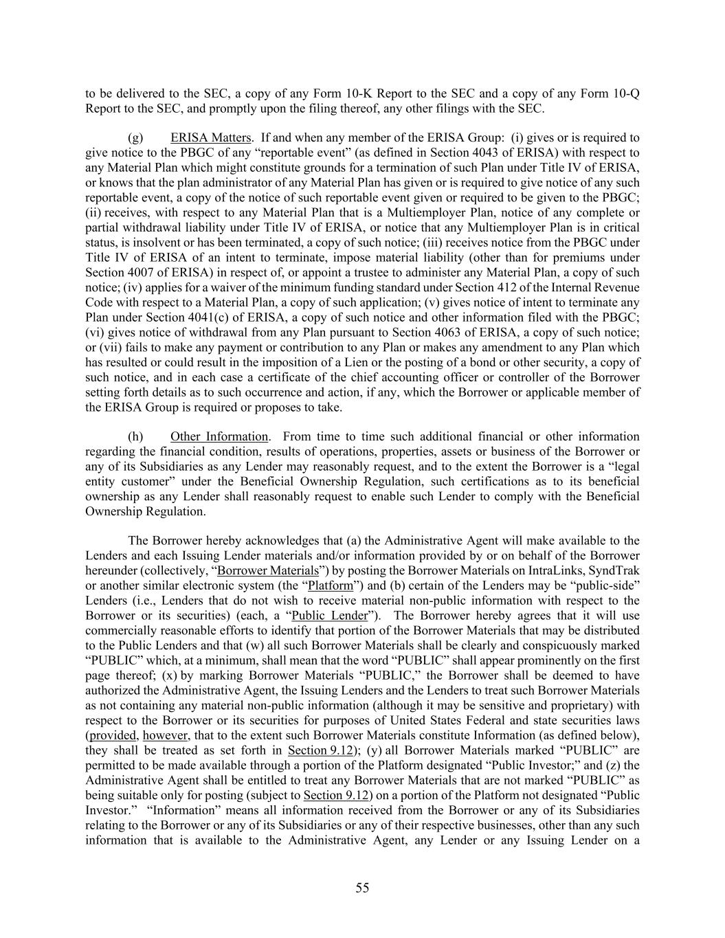 55 to be delivered to the SEC, a copy of any Form 10-K Report to the SEC and a copy of any Form 10-Q Report to the SEC, and promptly upon the filing thereof, any other filings with the SEC. (g) ERISA Matters. If and when any member of the ERISA Group: (i) gives or is required to give notice to the PBGC of any “reportable event” (as defined in Section 4043 of ERISA) with respect to any Material Plan which might constitute grounds for a termination of such Plan under Title IV of ERISA, or knows that the plan administrator of any Material Plan has given or is required to give notice of any such reportable event, a copy of the notice of such reportable event given or required to be given to the PBGC; (ii) receives, with respect to any Material Plan that is a Multiemployer Plan, notice of any complete or partial withdrawal liability under Title IV of ERISA, or notice that any Multiemployer Plan is in critical status, is insolvent or has been terminated, a copy of such notice; (iii) receives notice from the PBGC under Title IV of ERISA of an intent to terminate, impose material liability (other than for premiums under Section 4007 of ERISA) in respect of, or appoint a trustee to administer any Material Plan, a copy of such notice; (iv) applies for a waiver of the minimum funding standard under Section 412 of the Internal Revenue Code with respect to a Material Plan, a copy of such application; (v) gives notice of intent to terminate any Plan under Section 4041(c) of ERISA, a copy of such notice and other information filed with the PBGC; (vi) gives notice of withdrawal from any Plan pursuant to Section 4063 of ERISA, a copy of such notice; or (vii) fails to make any payment or contribution to any Plan or makes any amendment to any Plan which has resulted or could result in the imposition of a Lien or the posting of a bond or other security, a copy of such notice, and in each case a certificate of the chief accounting officer or controller of the Borrower setting forth details as to such occurrence and action, if any, which the Borrower or applicable member of the ERISA Group is required or proposes to take. (h) Other Information. From time to time such additional financial or other information regarding the financial condition, results of operations, properties, assets or business of the Borrower or any of its Subsidiaries as any Lender may reasonably request, and to the extent the Borrower is a “legal entity customer” under the Beneficial Ownership Regulation, such certifications as to its beneficial ownership as any Lender shall reasonably request to enable such Lender to comply with the Beneficial Ownership Regulation. The Borrower hereby acknowledges that (a) the Administrative Agent will make available to the Lenders and each Issuing Lender materials and/or information provided by or on behalf of the Borrower hereunder (collectively, “Borrower Materials”) by posting the Borrower Materials on IntraLinks, SyndTrak or another similar electronic system (the “Platform”) and (b) certain of the Lenders may be “public-side” Lenders (i.e., Lenders that do not wish to receive material non-public information with respect to the Borrower or its securities) (each, a “Public Lender”). The Borrower hereby agrees that it will use commercially reasonable efforts to identify that portion of the Borrower Materials that may be distributed to the Public Lenders and that (w) all such Borrower Materials shall be clearly and conspicuously marked “PUBLIC” which, at a minimum, shall mean that the word “PUBLIC” shall appear prominently on the first page thereof; (x) by marking Borrower Materials “PUBLIC,” the Borrower shall be deemed to have authorized the Administrative Agent, the Issuing Lenders and the Lenders to treat such Borrower Materials as not containing any material non-public information (although it may be sensitive and proprietary) with respect to the Borrower or its securities for purposes of United States Federal and state securities laws (provided, however, that to the extent such Borrower Materials constitute Information (as defined below), they shall be treated as set forth in Section 9.12); (y) all Borrower Materials marked “PUBLIC” are permitted to be made available through a portion of the Platform designated “Public Investor;” and (z) the Administrative Agent shall be entitled to treat any Borrower Materials that are not marked “PUBLIC” as being suitable only for posting (subject to Section 9.12) on a portion of the Platform not designated “Public Investor.” “Information” means all information received from the Borrower or any of its Subsidiaries relating to the Borrower or any of its Subsidiaries or any of their respective businesses, other than any such information that is available to the Administrative Agent, any Lender or any Issuing Lender on a
