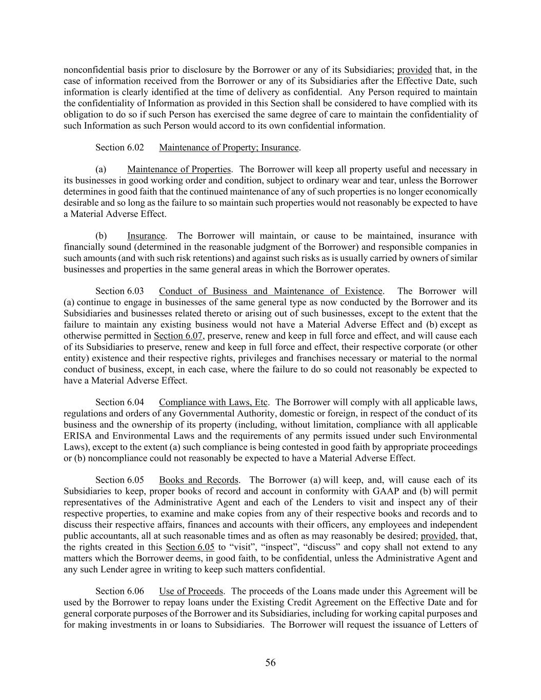 56 nonconfidential basis prior to disclosure by the Borrower or any of its Subsidiaries; provided that, in the case of information received from the Borrower or any of its Subsidiaries after the Effective Date, such information is clearly identified at the time of delivery as confidential. Any Person required to maintain the confidentiality of Information as provided in this Section shall be considered to have complied with its obligation to do so if such Person has exercised the same degree of care to maintain the confidentiality of such Information as such Person would accord to its own confidential information. Section 6.02 Maintenance of Property; Insurance. (a) Maintenance of Properties. The Borrower will keep all property useful and necessary in its businesses in good working order and condition, subject to ordinary wear and tear, unless the Borrower determines in good faith that the continued maintenance of any of such properties is no longer economically desirable and so long as the failure to so maintain such properties would not reasonably be expected to have a Material Adverse Effect. (b) Insurance. The Borrower will maintain, or cause to be maintained, insurance with financially sound (determined in the reasonable judgment of the Borrower) and responsible companies in such amounts (and with such risk retentions) and against such risks as is usually carried by owners of similar businesses and properties in the same general areas in which the Borrower operates. Section 6.03 Conduct of Business and Maintenance of Existence. The Borrower will (a) continue to engage in businesses of the same general type as now conducted by the Borrower and its Subsidiaries and businesses related thereto or arising out of such businesses, except to the extent that the failure to maintain any existing business would not have a Material Adverse Effect and (b) except as otherwise permitted in Section 6.07, preserve, renew and keep in full force and effect, and will cause each of its Subsidiaries to preserve, renew and keep in full force and effect, their respective corporate (or other entity) existence and their respective rights, privileges and franchises necessary or material to the normal conduct of business, except, in each case, where the failure to do so could not reasonably be expected to have a Material Adverse Effect. Section 6.04 Compliance with Laws, Etc. The Borrower will comply with all applicable laws, regulations and orders of any Governmental Authority, domestic or foreign, in respect of the conduct of its business and the ownership of its property (including, without limitation, compliance with all applicable ERISA and Environmental Laws and the requirements of any permits issued under such Environmental Laws), except to the extent (a) such compliance is being contested in good faith by appropriate proceedings or (b) noncompliance could not reasonably be expected to have a Material Adverse Effect. Section 6.05 Books and Records. The Borrower (a) will keep, and, will cause each of its Subsidiaries to keep, proper books of record and account in conformity with GAAP and (b) will permit representatives of the Administrative Agent and each of the Lenders to visit and inspect any of their respective properties, to examine and make copies from any of their respective books and records and to discuss their respective affairs, finances and accounts with their officers, any employees and independent public accountants, all at such reasonable times and as often as may reasonably be desired; provided, that, the rights created in this Section 6.05 to “visit”, “inspect”, “discuss” and copy shall not extend to any matters which the Borrower deems, in good faith, to be confidential, unless the Administrative Agent and any such Lender agree in writing to keep such matters confidential. Section 6.06 Use of Proceeds. The proceeds of the Loans made under this Agreement will be used by the Borrower to repay loans under the Existing Credit Agreement on the Effective Date and for general corporate purposes of the Borrower and its Subsidiaries, including for working capital purposes and for making investments in or loans to Subsidiaries. The Borrower will request the issuance of Letters of