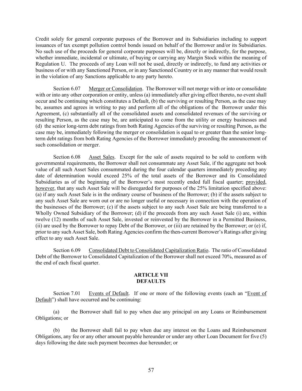 57 Credit solely for general corporate purposes of the Borrower and its Subsidiaries including to support issuances of tax exempt pollution control bonds issued on behalf of the Borrower and/or its Subsidiaries. No such use of the proceeds for general corporate purposes will be, directly or indirectly, for the purpose, whether immediate, incidental or ultimate, of buying or carrying any Margin Stock within the meaning of Regulation U. The proceeds of any Loan will not be used, directly or indirectly, to fund any activities or business of or with any Sanctioned Person, or in any Sanctioned Country or in any manner that would result in the violation of any Sanctions applicable to any party hereto. Section 6.07 Merger or Consolidation. The Borrower will not merge with or into or consolidate with or into any other corporation or entity, unless (a) immediately after giving effect thereto, no event shall occur and be continuing which constitutes a Default, (b) the surviving or resulting Person, as the case may be, assumes and agrees in writing to pay and perform all of the obligations of the Borrower under this Agreement, (c) substantially all of the consolidated assets and consolidated revenues of the surviving or resulting Person, as the case may be, are anticipated to come from the utility or energy businesses and (d) the senior long-term debt ratings from both Rating Agencies of the surviving or resulting Person, as the case may be, immediately following the merger or consolidation is equal to or greater than the senior long- term debt ratings from both Rating Agencies of the Borrower immediately preceding the announcement of such consolidation or merger. Section 6.08 Asset Sales. Except for the sale of assets required to be sold to conform with governmental requirements, the Borrower shall not consummate any Asset Sale, if the aggregate net book value of all such Asset Sales consummated during the four calendar quarters immediately preceding any date of determination would exceed 25% of the total assets of the Borrower and its Consolidated Subsidiaries as of the beginning of the Borrower’s most recently ended full fiscal quarter; provided, however, that any such Asset Sale will be disregarded for purposes of the 25% limitation specified above: (a) if any such Asset Sale is in the ordinary course of business of the Borrower; (b) if the assets subject to any such Asset Sale are worn out or are no longer useful or necessary in connection with the operation of the businesses of the Borrower; (c) if the assets subject to any such Asset Sale are being transferred to a Wholly Owned Subsidiary of the Borrower; (d) if the proceeds from any such Asset Sale (i) are, within twelve (12) months of such Asset Sale, invested or reinvested by the Borrower in a Permitted Business, (ii) are used by the Borrower to repay Debt of the Borrower, or (iii) are retained by the Borrower; or (e) if, prior to any such Asset Sale, both Rating Agencies confirm the then-current Borrower’s Ratings after giving effect to any such Asset Sale. Section 6.09 Consolidated Debt to Consolidated Capitalization Ratio. The ratio of Consolidated Debt of the Borrower to Consolidated Capitalization of the Borrower shall not exceed 70%, measured as of the end of each fiscal quarter. ARTICLE VII DEFAULTS Section 7.01 Events of Default. If one or more of the following events (each an “Event of Default”) shall have occurred and be continuing: (a) the Borrower shall fail to pay when due any principal on any Loans or Reimbursement Obligations; or (b) the Borrower shall fail to pay when due any interest on the Loans and Reimbursement Obligations, any fee or any other amount payable hereunder or under any other Loan Document for five (5) days following the date such payment becomes due hereunder; or