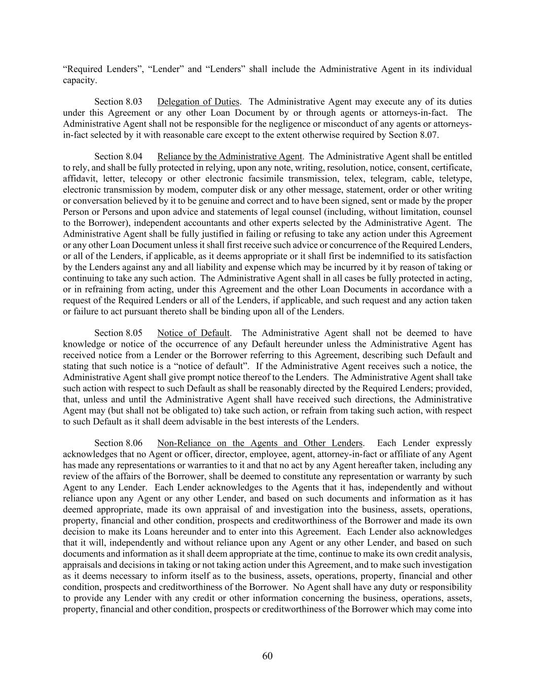 60 “Required Lenders”, “Lender” and “Lenders” shall include the Administrative Agent in its individual capacity. Section 8.03 Delegation of Duties. The Administrative Agent may execute any of its duties under this Agreement or any other Loan Document by or through agents or attorneys-in-fact. The Administrative Agent shall not be responsible for the negligence or misconduct of any agents or attorneys- in-fact selected by it with reasonable care except to the extent otherwise required by Section 8.07. Section 8.04 Reliance by the Administrative Agent. The Administrative Agent shall be entitled to rely, and shall be fully protected in relying, upon any note, writing, resolution, notice, consent, certificate, affidavit, letter, telecopy or other electronic facsimile transmission, telex, telegram, cable, teletype, electronic transmission by modem, computer disk or any other message, statement, order or other writing or conversation believed by it to be genuine and correct and to have been signed, sent or made by the proper Person or Persons and upon advice and statements of legal counsel (including, without limitation, counsel to the Borrower), independent accountants and other experts selected by the Administrative Agent. The Administrative Agent shall be fully justified in failing or refusing to take any action under this Agreement or any other Loan Document unless it shall first receive such advice or concurrence of the Required Lenders, or all of the Lenders, if applicable, as it deems appropriate or it shall first be indemnified to its satisfaction by the Lenders against any and all liability and expense which may be incurred by it by reason of taking or continuing to take any such action. The Administrative Agent shall in all cases be fully protected in acting, or in refraining from acting, under this Agreement and the other Loan Documents in accordance with a request of the Required Lenders or all of the Lenders, if applicable, and such request and any action taken or failure to act pursuant thereto shall be binding upon all of the Lenders. Section 8.05 Notice of Default. The Administrative Agent shall not be deemed to have knowledge or notice of the occurrence of any Default hereunder unless the Administrative Agent has received notice from a Lender or the Borrower referring to this Agreement, describing such Default and stating that such notice is a “notice of default”. If the Administrative Agent receives such a notice, the Administrative Agent shall give prompt notice thereof to the Lenders. The Administrative Agent shall take such action with respect to such Default as shall be reasonably directed by the Required Lenders; provided, that, unless and until the Administrative Agent shall have received such directions, the Administrative Agent may (but shall not be obligated to) take such action, or refrain from taking such action, with respect to such Default as it shall deem advisable in the best interests of the Lenders. Section 8.06 Non-Reliance on the Agents and Other Lenders. Each Lender expressly acknowledges that no Agent or officer, director, employee, agent, attorney-in-fact or affiliate of any Agent has made any representations or warranties to it and that no act by any Agent hereafter taken, including any review of the affairs of the Borrower, shall be deemed to constitute any representation or warranty by such Agent to any Lender. Each Lender acknowledges to the Agents that it has, independently and without reliance upon any Agent or any other Lender, and based on such documents and information as it has deemed appropriate, made its own appraisal of and investigation into the business, assets, operations, property, financial and other condition, prospects and creditworthiness of the Borrower and made its own decision to make its Loans hereunder and to enter into this Agreement. Each Lender also acknowledges that it will, independently and without reliance upon any Agent or any other Lender, and based on such documents and information as it shall deem appropriate at the time, continue to make its own credit analysis, appraisals and decisions in taking or not taking action under this Agreement, and to make such investigation as it deems necessary to inform itself as to the business, assets, operations, property, financial and other condition, prospects and creditworthiness of the Borrower. No Agent shall have any duty or responsibility to provide any Lender with any credit or other information concerning the business, operations, assets, property, financial and other condition, prospects or creditworthiness of the Borrower which may come into