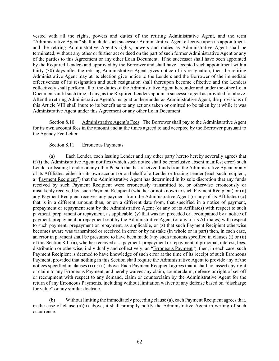 62 vested with all the rights, powers and duties of the retiring Administrative Agent, and the term “Administrative Agent” shall include such successor Administrative Agent effective upon its appointment, and the retiring Administrative Agent’s rights, powers and duties as Administrative Agent shall be terminated, without any other or further act or deed on the part of such former Administrative Agent or any of the parties to this Agreement or any other Loan Document. If no successor shall have been appointed by the Required Lenders and approved by the Borrower and shall have accepted such appointment within thirty (30) days after the retiring Administrative Agent gives notice of its resignation, then the retiring Administrative Agent may at its election give notice to the Lenders and the Borrower of the immediate effectiveness of its resignation and such resignation shall thereupon become effective and the Lenders collectively shall perform all of the duties of the Administrative Agent hereunder and under the other Loan Documents until such time, if any, as the Required Lenders appoint a successor agent as provided for above. After the retiring Administrative Agent’s resignation hereunder as Administrative Agent, the provisions of this Article VIII shall inure to its benefit as to any actions taken or omitted to be taken by it while it was Administrative Agent under this Agreement or any other Loan Document Section 8.10 Administrative Agent’s Fees. The Borrower shall pay to the Administrative Agent for its own account fees in the amount and at the times agreed to and accepted by the Borrower pursuant to the Agency Fee Letter. Section 8.11 Erroneous Payments. (a) Each Lender, each Issuing Lender and any other party hereto hereby severally agrees that if (i) the Administrative Agent notifies (which such notice shall be conclusive absent manifest error) such Lender or Issuing Lender or any other Person that has received funds from the Administrative Agent or any of its Affiliates, either for its own account or on behalf of a Lender or Issuing Lender (each such recipient, a “Payment Recipient”) that the Administrative Agent has determined in its sole discretion that any funds received by such Payment Recipient were erroneously transmitted to, or otherwise erroneously or mistakenly received by, such Payment Recipient (whether or not known to such Payment Recipient) or (ii) any Payment Recipient receives any payment from the Administrative Agent (or any of its Affiliates) (x) that is in a different amount than, or on a different date from, that specified in a notice of payment, prepayment or repayment sent by the Administrative Agent (or any of its Affiliates) with respect to such payment, prepayment or repayment, as applicable, (y) that was not preceded or accompanied by a notice of payment, prepayment or repayment sent by the Administrative Agent (or any of its Affiliates) with respect to such payment, prepayment or repayment, as applicable, or (z) that such Payment Recipient otherwise becomes aware was transmitted or received in error or by mistake (in whole or in part) then, in each case, an error in payment shall be presumed to have been made (any such amounts specified in clauses (i) or (ii) of this Section 8.11(a), whether received as a payment, prepayment or repayment of principal, interest, fees, distribution or otherwise; individually and collectively, an “Erroneous Payment”), then, in each case, such Payment Recipient is deemed to have knowledge of such error at the time of its receipt of such Erroneous Payment; provided that nothing in this Section shall require the Administrative Agent to provide any of the notices specified in clauses (i) or (ii) above. Each Payment Recipient agrees that it shall not assert any right or claim to any Erroneous Payment, and hereby waives any claim, counterclaim, defense or right of set-off or recoupment with respect to any demand, claim or counterclaim by the Administrative Agent for the return of any Erroneous Payments, including without limitation waiver of any defense based on “discharge for value” or any similar doctrine. (b) Without limiting the immediately preceding clause (a), each Payment Recipient agrees that, in the case of clause (a)(ii) above, it shall promptly notify the Administrative Agent in writing of such occurrence.